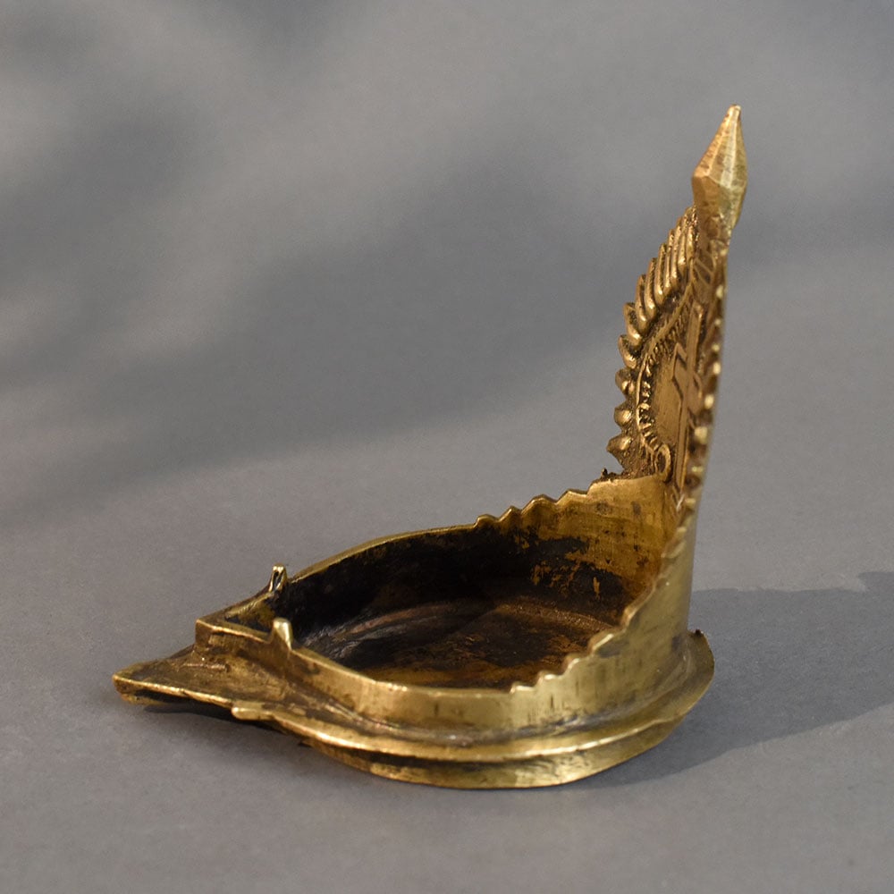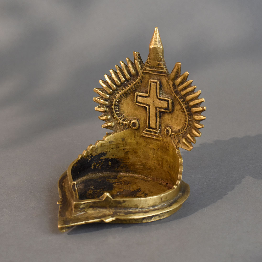 This vintage brass South Indian diya is a rare and beautifully crafted piece that blends spirituality with traditional artistry. Made of solid brass, the diya features an intricate cross design with a radiant sunburst motif, symbolizing divine light and blessings. It is perfect for pooja rituals, prayers, and festive occasions, creating a serene and devotional ambiance. With its antique charm, this diya not only serves as a sacred lamp but also as a collectible art piece that enhances your home Decor. Its durable brass body ensures long-lasting use, while the unique design reflects the fusion of cultural and spiritual heritage. An ideal choice for personal use or as a meaningful gift, this diya brings tradition, faith, and positive energy to any space.