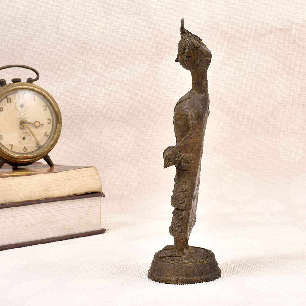 Immerse yourself in the captivating melodies of Bengal with this stunning brass statue of a Bengali lady playing a traditional drum. Crafted with meticulous attention to detail in the renowned Dhokra Art style, this piece is a true masterpiece that will transport you to the vibrant heart of Indian culture. Bring the captivating rhythms of Bengal into your home or workspace with this exquisite brass statue. Let it inspire you with its timeless beauty and connect you to the rich cultural heritage of India. Whether you're a collector of fine art, a lover of Indian craftsmanship, or simply seeking to add a touch of exotic elegance to your decor, this statue is a must-have addition to your collection.