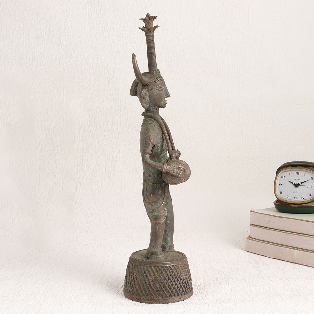 Buy a Brass Male Figure Playing Drum online and get a hassle free delivery at your doorstep. This exquisite masterpiece is painstakingly crafted by skilled Indian artisans in the enchanting region of Nagaland and is a testament to their exceptional craftsmanship. Standing proudly on a platform, this brass figure captivates with its antique brown finish, evoking a sense of timeless elegance and sophistication. Its intricate detailing showcases the meticulous care and dedication of these talented craftsmen, making each piece truly one-of-a-kind. The Brass Male Figure Playing Drum is a versatile addition to your living space, be it at home, in the office, a restaurant, hotel, cafe, or shop. Its alluring presence can elevate any setting, whether contemporary or classic, adding a touch of heritage and artistry to your surroundings. Perfect for collectors, this piece is an excellent addition to your vintage collection or a striking exhibit at an art gallery or exhibition. Additionally, it makes for an extraordinary gift, imparting a sense of tradition and luxury on special, festive, or auspicious occasions.