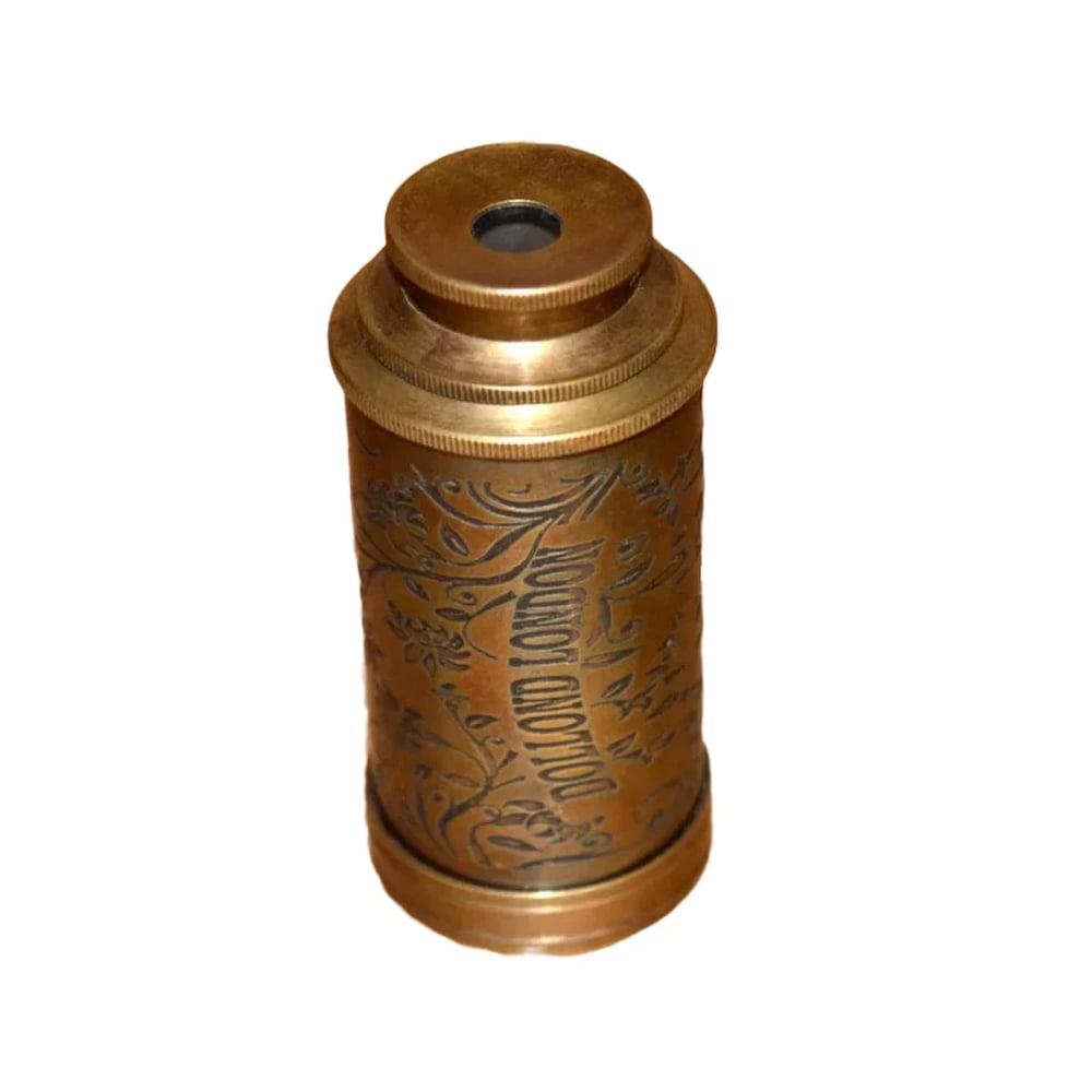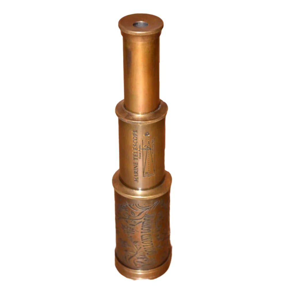 This handcrafted brass telescope features intricate engraved detailing across its body, reflecting classic nautical design and vintage craftsmanship. Its aged brass finish and cylindrical form make it a timeless decorative piece suited for collectors, explorers, and antique-inspired interiors.