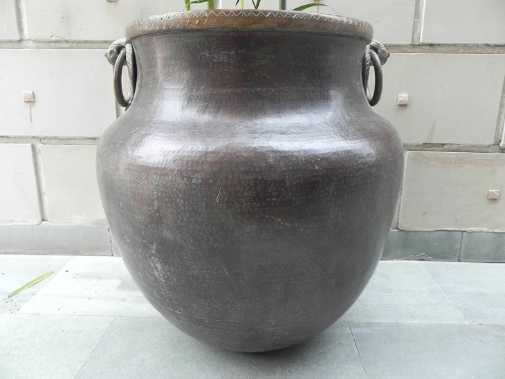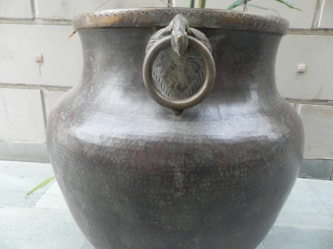 Vintage bronze planter. It is hand made by skilled craftsmen in South India. It has 2 beautiful bronze peacock handles attached to it. You can keep it inside or outside.