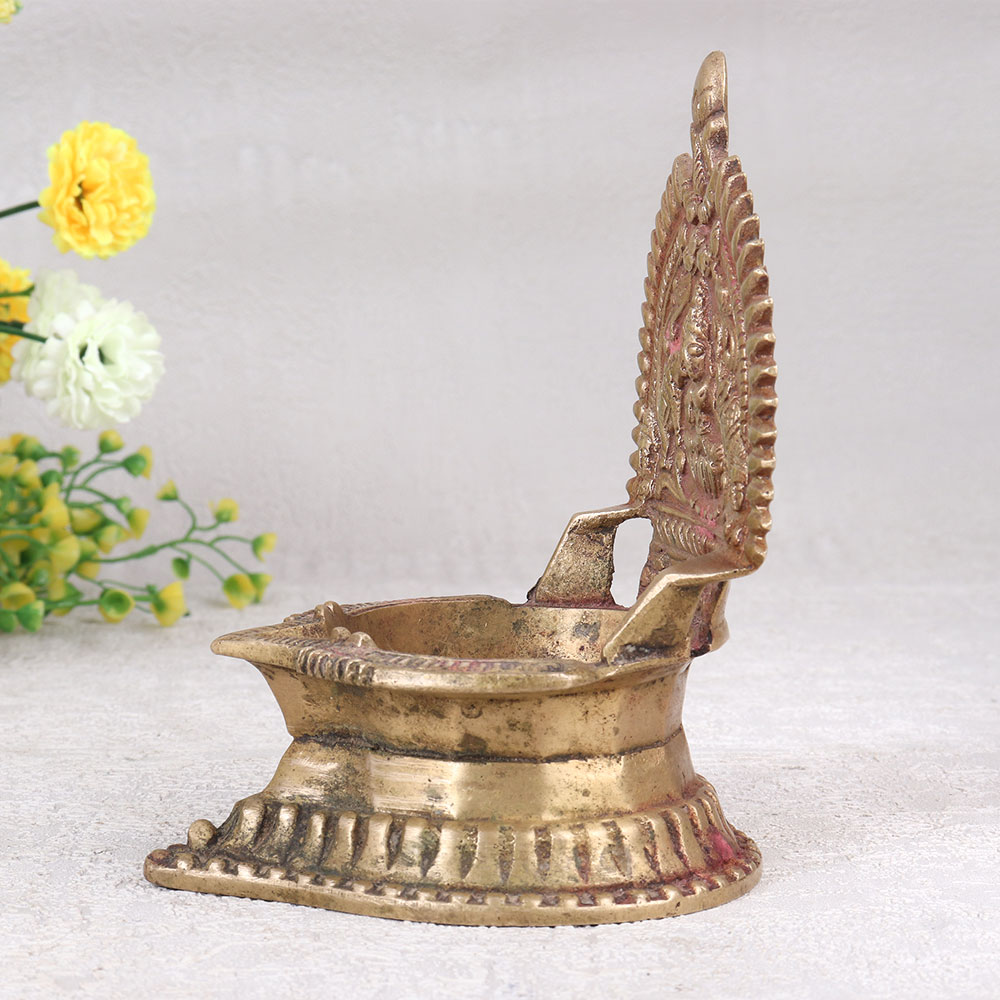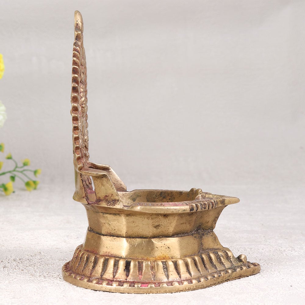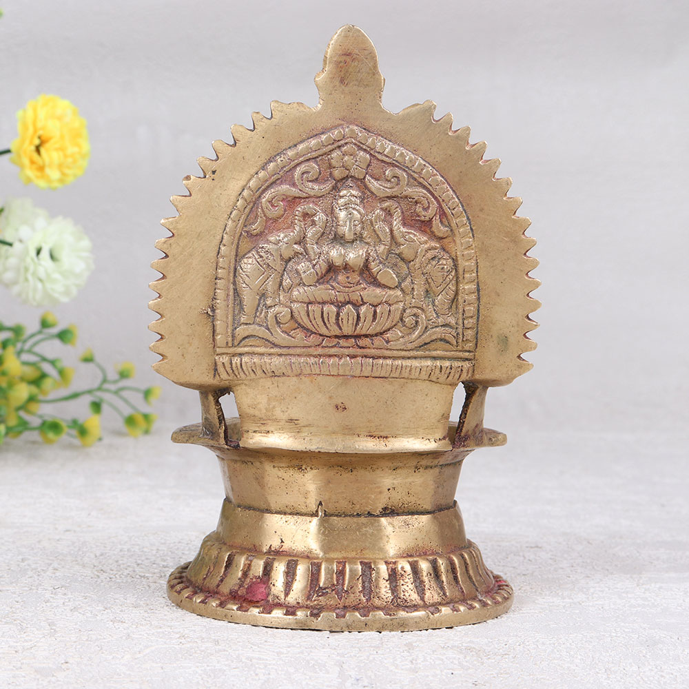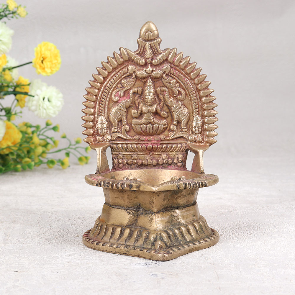 Buy a Vintage Brass Gajlaxmi Oil Lamp online and get a hassle free delivery right at your doorstep. Crafted by highly skilled Indian artisans in the revered South Indian Art style, this diya showcases the divine form of Goddess Gajlaxmi intricately carved into its brass surface. The antique brown finish adds a touch of nostalgia, enhancing the lamp's vintage charm. Designed for use with mustard oil or ghee and a cotton wick, the lamp provides a warm, flickering glow reminiscent of a bygone era. Versatile and elegant, it finds a perfect place in homes, offices, restaurants, hotels, or cafes, especially in prayer rooms. Beyond its spiritual significance, this handmade masterpiece doubles as a captivating decorative item, suitable for both contemporary and classic settings. Elevate your surroundings, or gift this symbol of divinity and craftsmanship to loved ones on special, festive, or auspicious occasions.