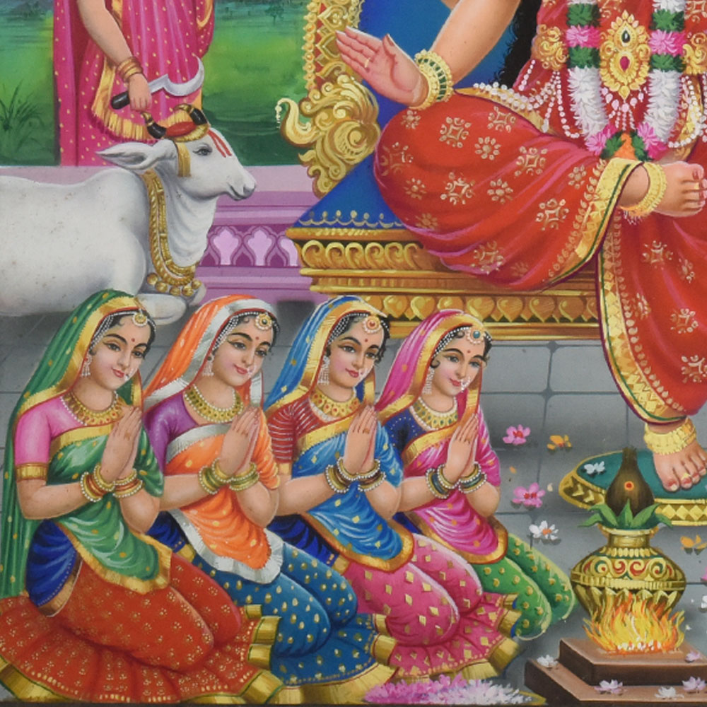 This vibrant calendar art painting beautifully depicts a divine goddess seated majestically on a golden throne beneath an ornate umbrella. Adorned in a radiant red saree with intricate golden embroidery, she exudes grace and power while holding a sword and trident, symbols of protection and strength. Her serene yet commanding presence is enhanced by elaborate jewelry, including layered necklaces, earrings, and a regal crown. Surrounding her are scenes of devotion and daily life. At her feet, a sage sits in reverence, while a group of women in colorful traditional attire offer prayers. To the left, a woman leads a white cow, symbolizing purity and prosperity, and in the background, a man carries a pot, suggesting temple offerings. Children and devotees in the distance add depth and liveliness to the scene. The painting’s bold, saturated colors and intricate detailing are characteristic of traditional Indian calendar art, designed to inspire devotion and cultural pride. The black mount and simple wooden frame highlight the vivid imagery, making it a striking wall display. This artwork not only serves as a devotional piece but also as a collectible representation of mid-20th-century Indian printing heritage.