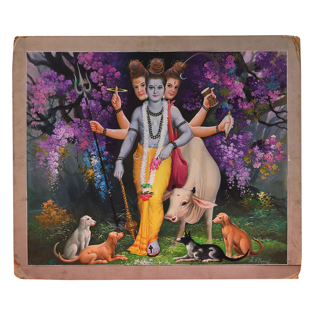 Prepare to be mesmerized by the stunning Fine Vintage Calendar art painting that celebrates the revered Hindu deities - Lord Vishnu, Krishna, and Shiva. This breathtaking piece is a true masterpiece, blending intricate craftsmanship with the timeless grace of these divine figures. This exquisite painting is not just a work of art; it's a window into the rich tapestry of Hindu mythology and spirituality. As you gaze upon the divine trio, you'll be transported to a realm of reverence and wonder, where the mysteries of the universe unfold before your eyes. Whether you're a collector of fine art or simply seeking to add a touch of cultural elegance to your home, this Fine Vintage Calendar art painting is a must-have. Elevate your space and immerse yourself in the captivating beauty of this extraordinary piece. Bring home the divine energy of Lord Vishnu, Krishna, and Shiva, and let their timeless presence inspire and enrich your life.