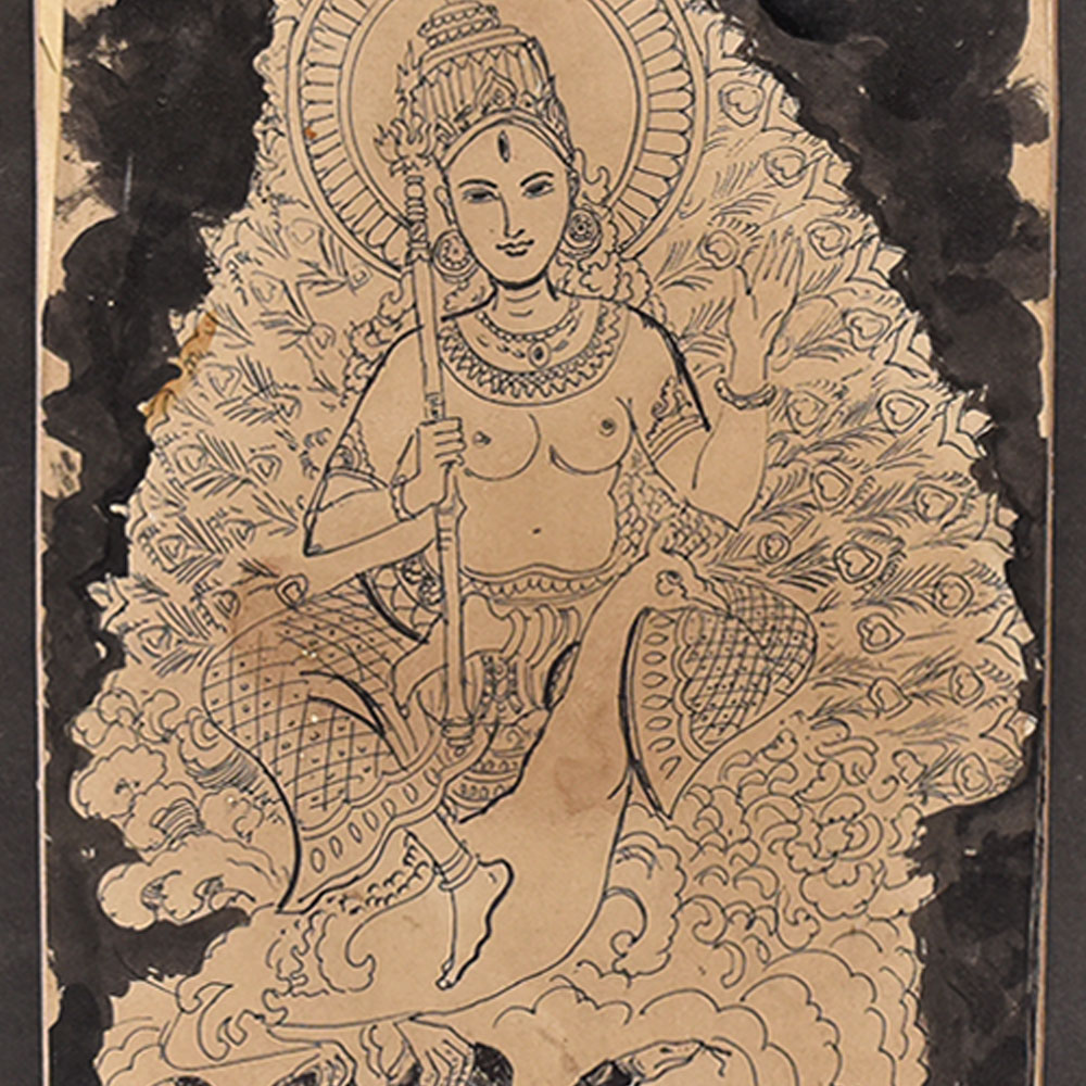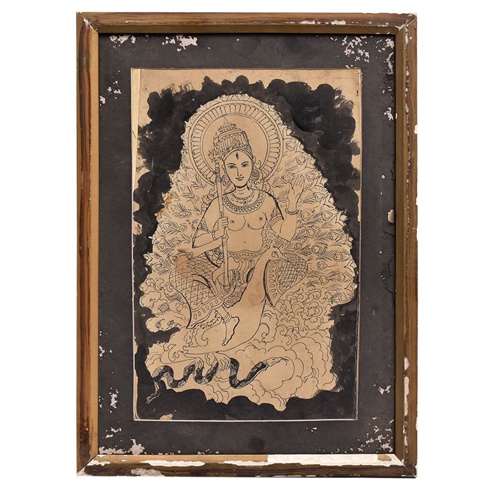 This breathtaking vintage charcoal painting offers a glimpse into the captivating world of ancient Bengal spirituality. Masterfully rendered by a skilled artist, the piece depicts the revered Goddess Saraswati seated majestically atop a majestic peacock - a powerful symbol of beauty, grace, and the divine feminine. The level of detail and artistry is truly awe-inspiring, from the intricate feather patterns of the peacock to the serene, contemplative expression of the Goddess Saraswati. This painting is not merely a work of art, but a portal into a realm of timeless wisdom and spiritual enlightenment.
