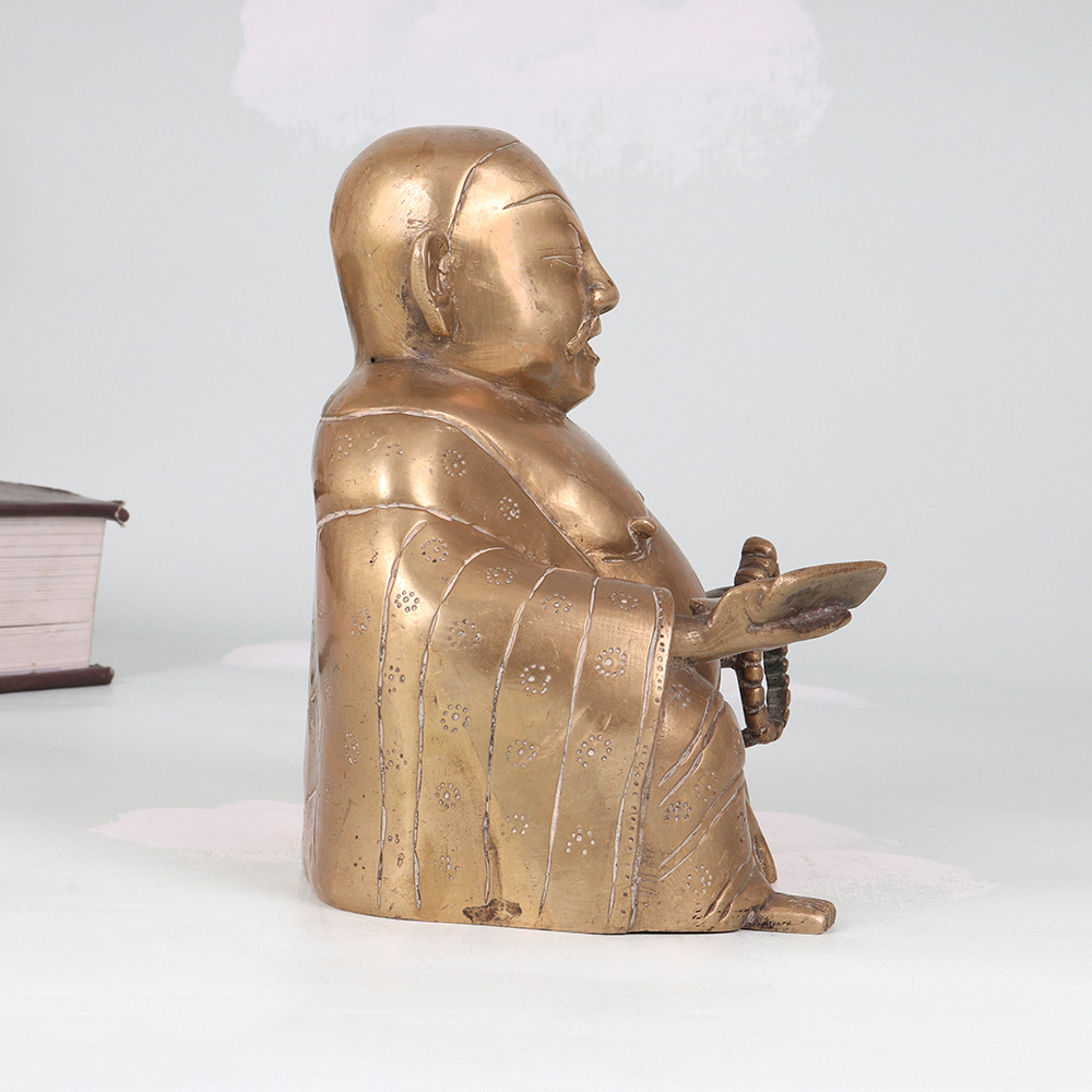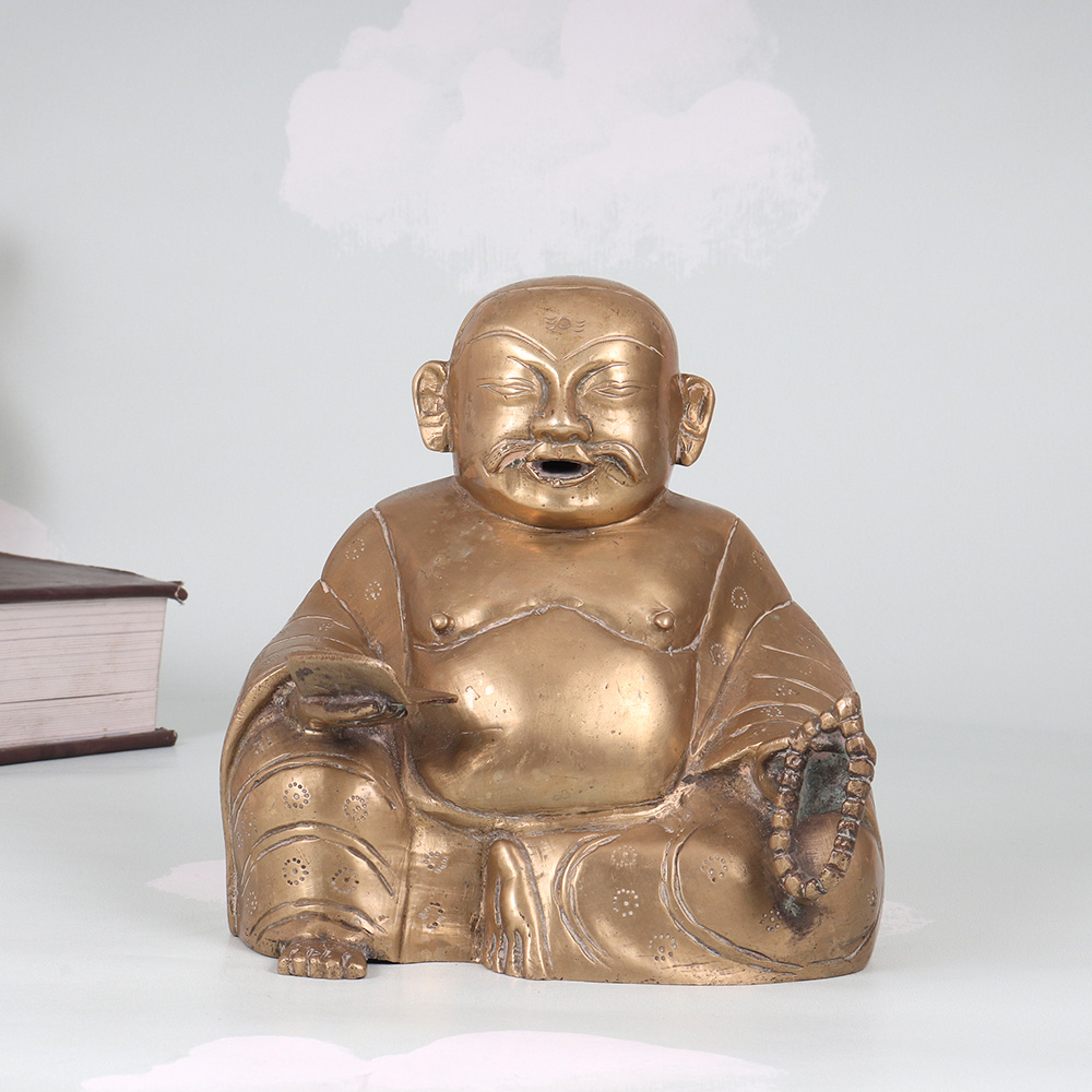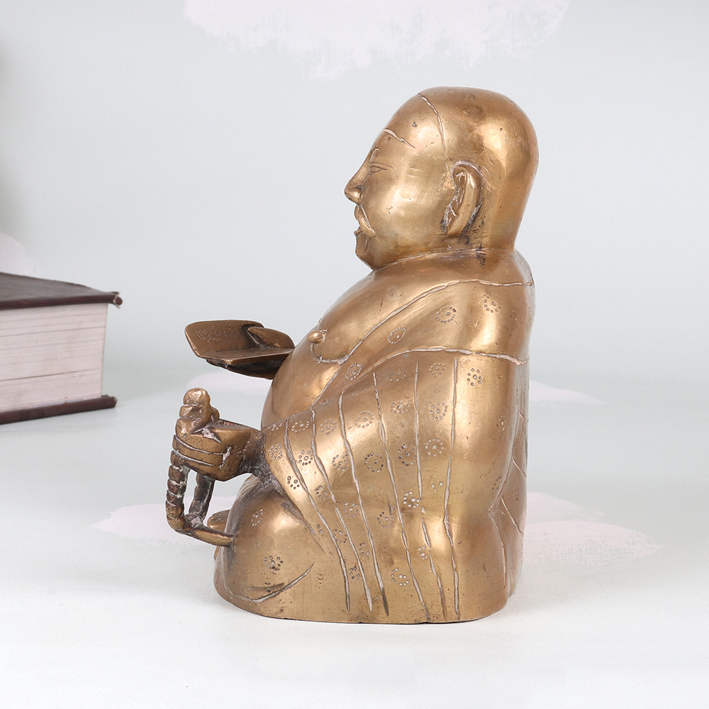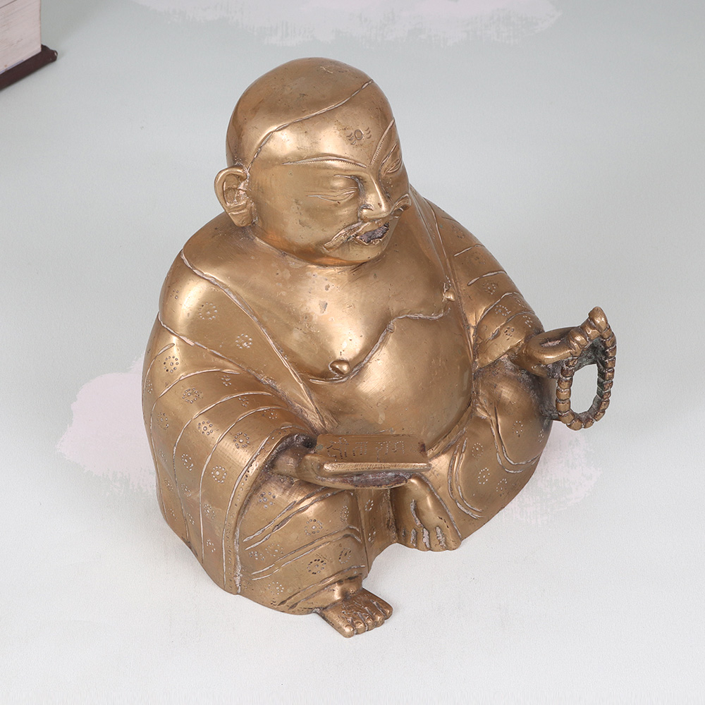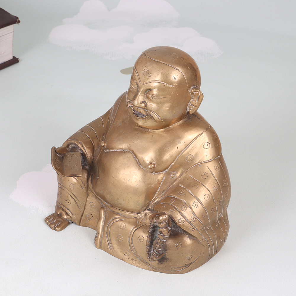 Invite the joy and prosperity of the Laughing Buddha into your home with this stunning vintage brass statue. Radiating positive energy, this captivating piece commands attention with its intricate detailing and joyful expression. The Laughing Buddha is revered in Chinese culture as a symbol of contentment, generosity, and spiritual enlightenment. Placing this magnificent statue in your home invites those positive qualities to permeate your surroundings. Its infectious smile and jolly demeanor are said to attract wealth, luck, and laughter. This vintage brass Laughing Buddha is a timeless work of art that will elevate the ambiance of any room, from the living area to the office. Its impressive size and exquisite craftsmanship make it a conversation piece that guests will admire. Display it proudly to infuse your space with the Buddha's joyful energy and blessings of abundance.