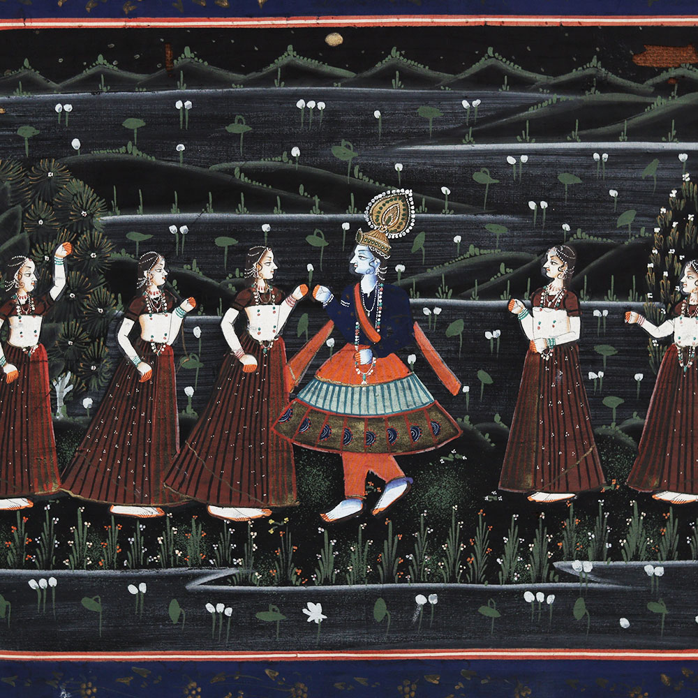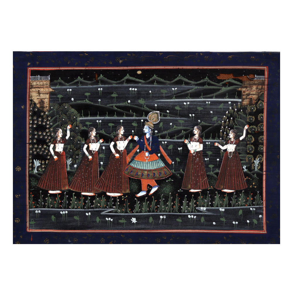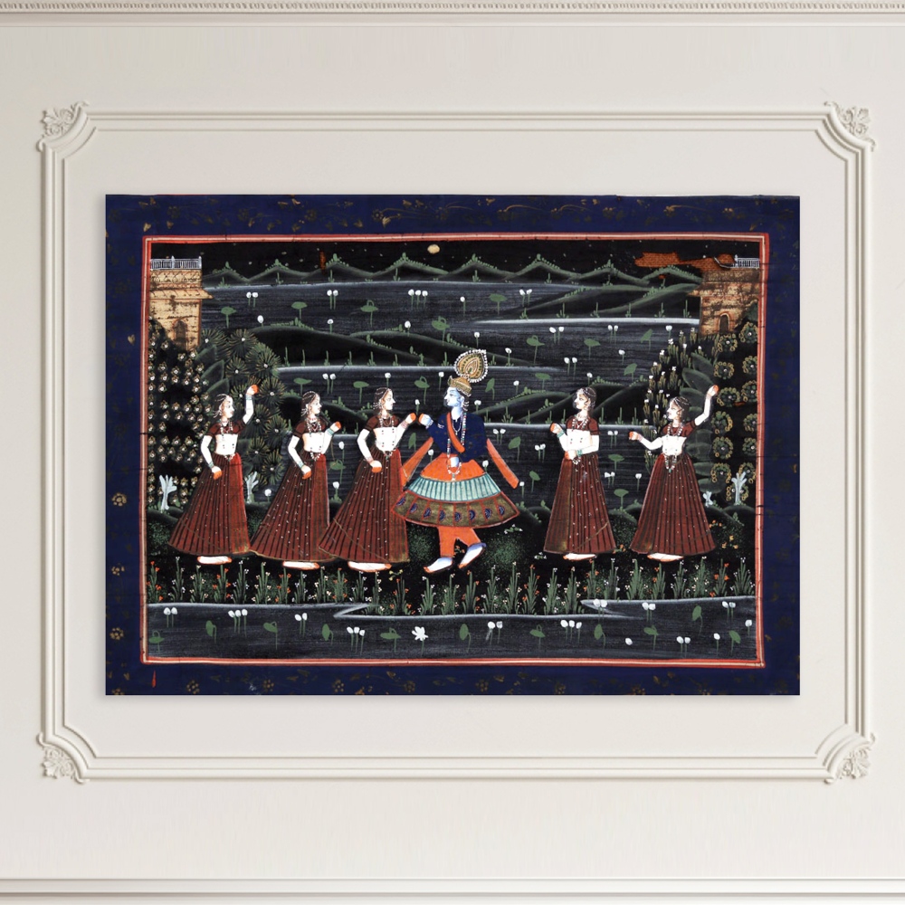 - Vintage painting of Lord Krishna dancing with the Gopies