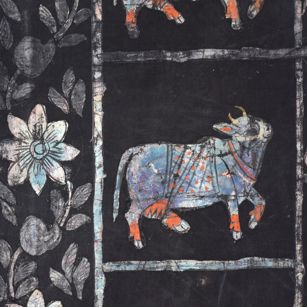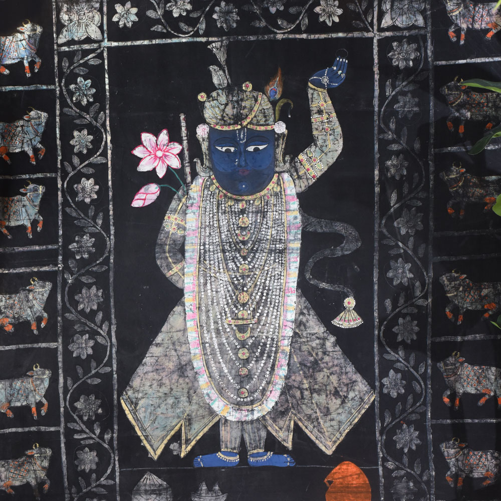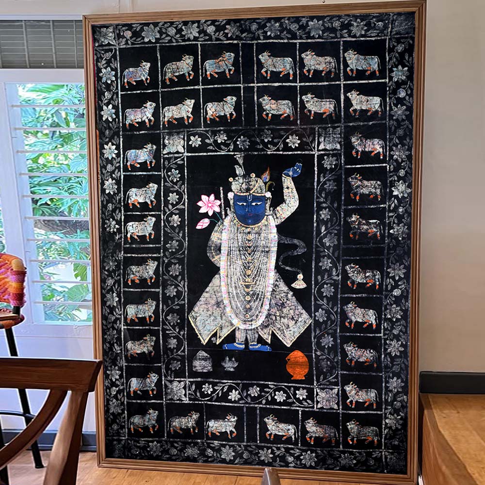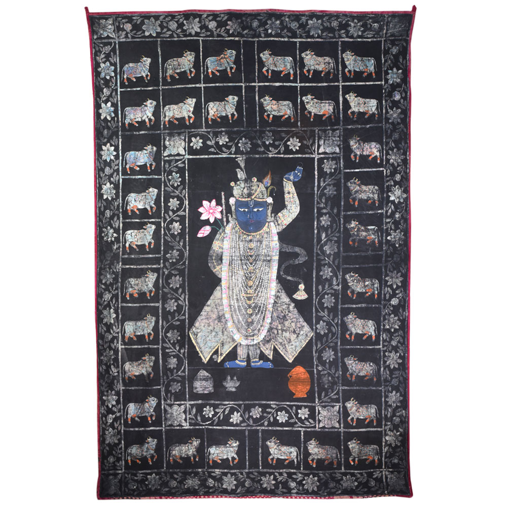 Immerse yourself in the captivating world of Indian art with this stunning vintage Lord Krishna Cloth painting Without Frame, a masterpiece from the renowned Golconda Art tradition. Adorned with a mesmerizing black background and a shimmering silver finish, this pichwai painting exudes an aura of timeless elegance that will captivate your senses. Step into the realm of divine inspiration as you gaze upon this masterpiece. The painting's central focus is the revered Lord Krishna, whose serene expression and graceful pose emanate a sense of peace and tranquility. Surrounding him is a herd of cows, each one delicately engraved with precision, creating a harmonious and serene composition. This vintage Lord Krishna Cloth painting is not just a work of art; it's a testament to the rich cultural heritage of India. The Golconda Art tradition, renowned for its intricate and captivating pichwai paintings, has been passed down through generations, and this painting is a true embodiment of that legacy. Whether you're a collector of fine art, a devotee of Lord Krishna, or simply someone who appreciates the beauty of Indian culture, this painting is sure to captivate and inspire you. Imagine the transformative power of this painting in your home or sacred space. Its stunning visual presence will not only elevate the aesthetic appeal of your surroundings but also create an atmosphere of serenity and spiritual connection. As you gaze upon the painting, you'll be transported to a realm of divine harmony, where the gentle sway of the cows and the serene expression of Lord Krishna invite you to pause, reflect, and connect with the deeper essence of life. Don't miss the opportunity to own this truly remarkable piece of art. Invest in a timeless treasure that will not only enhance your living space but also enrich your soul with the profound beauty and spiritual significance of the Golconda Art tradition.