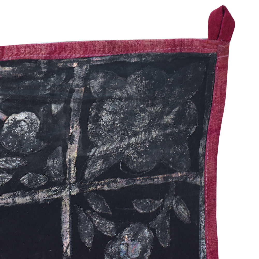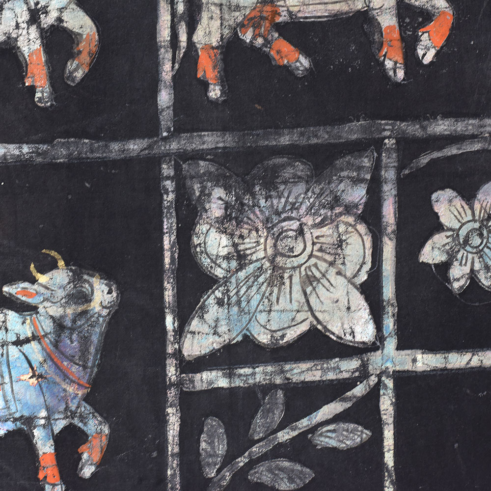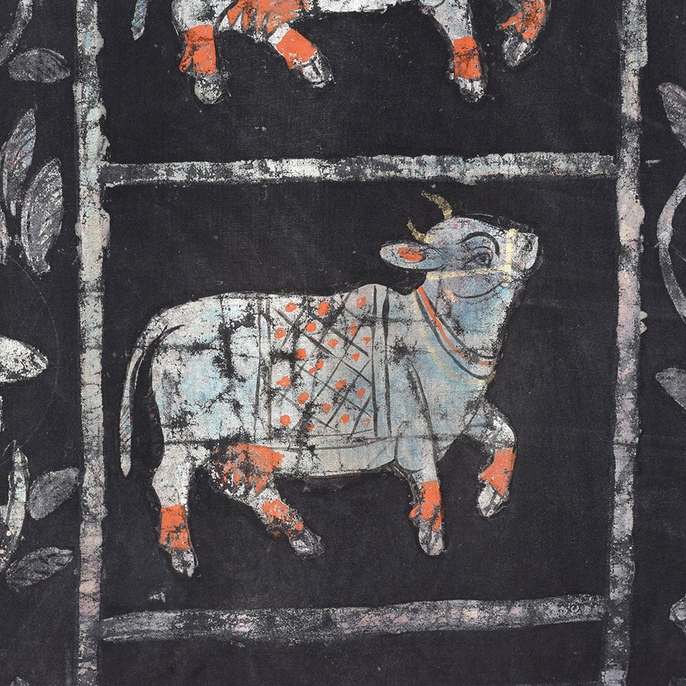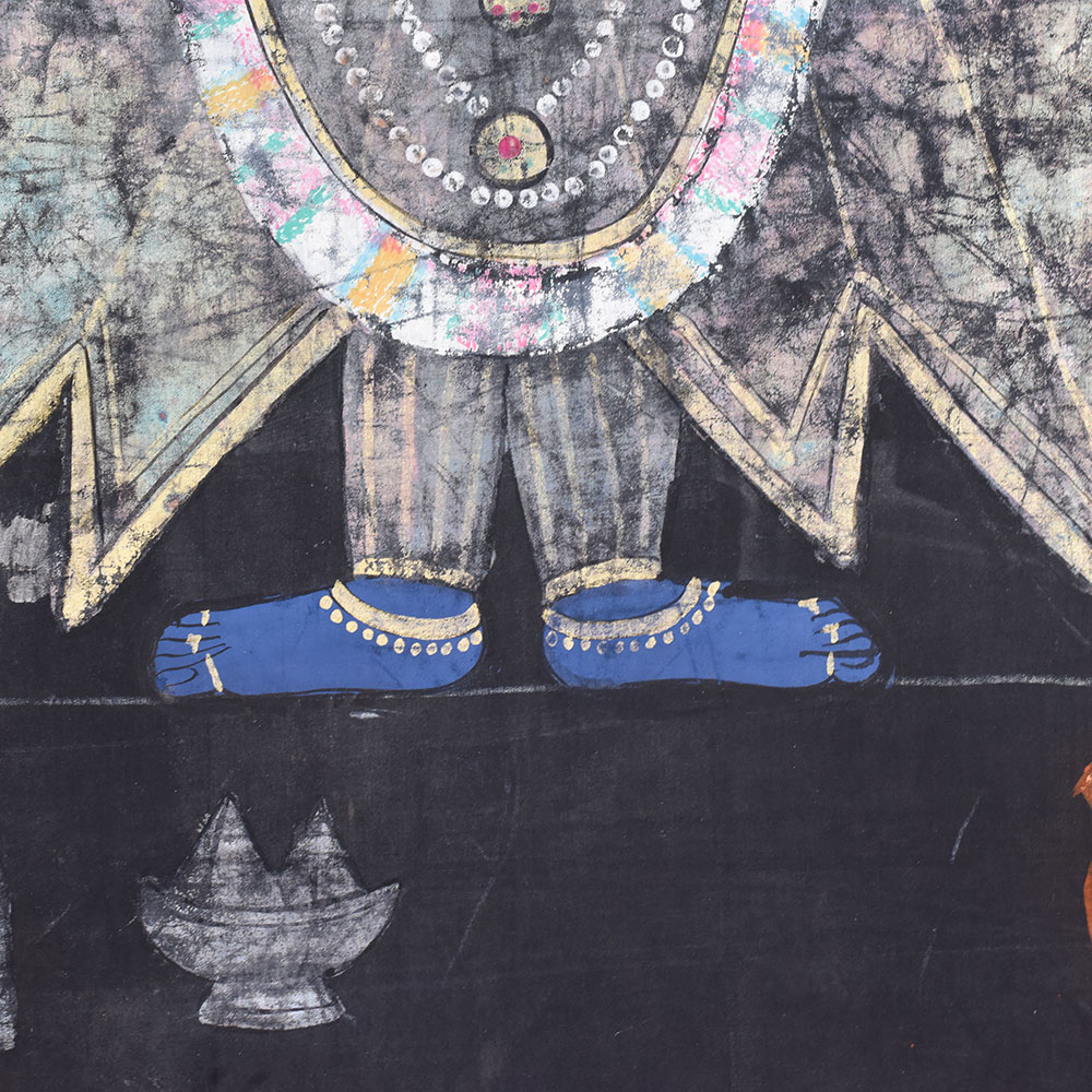 Immerse yourself in the captivating world of Indian art with this stunning vintage Lord Krishna Cloth painting Without Frame, a masterpiece from the renowned Golconda Art tradition. Adorned with a mesmerizing black background and a shimmering silver finish, this pichwai painting exudes an aura of timeless elegance that will captivate your senses. Step into the realm of divine inspiration as you gaze upon this masterpiece. The painting's central focus is the revered Lord Krishna, whose serene expression and graceful pose emanate a sense of peace and tranquility. Surrounding him is a herd of cows, each one delicately engraved with precision, creating a harmonious and serene composition. This vintage Lord Krishna Cloth painting is not just a work of art; it's a testament to the rich cultural heritage of India. The Golconda Art tradition, renowned for its intricate and captivating pichwai paintings, has been passed down through generations, and this painting is a true embodiment of that legacy. Whether you're a collector of fine art, a devotee of Lord Krishna, or simply someone who appreciates the beauty of Indian culture, this painting is sure to captivate and inspire you. Imagine the transformative power of this painting in your home or sacred space. Its stunning visual presence will not only elevate the aesthetic appeal of your surroundings but also create an atmosphere of serenity and spiritual connection. As you gaze upon the painting, you'll be transported to a realm of divine harmony, where the gentle sway of the cows and the serene expression of Lord Krishna invite you to pause, reflect, and connect with the deeper essence of life. Don't miss the opportunity to own this truly remarkable piece of art. Invest in a timeless treasure that will not only enhance your living space but also enrich your soul with the profound beauty and spiritual significance of the Golconda Art tradition.