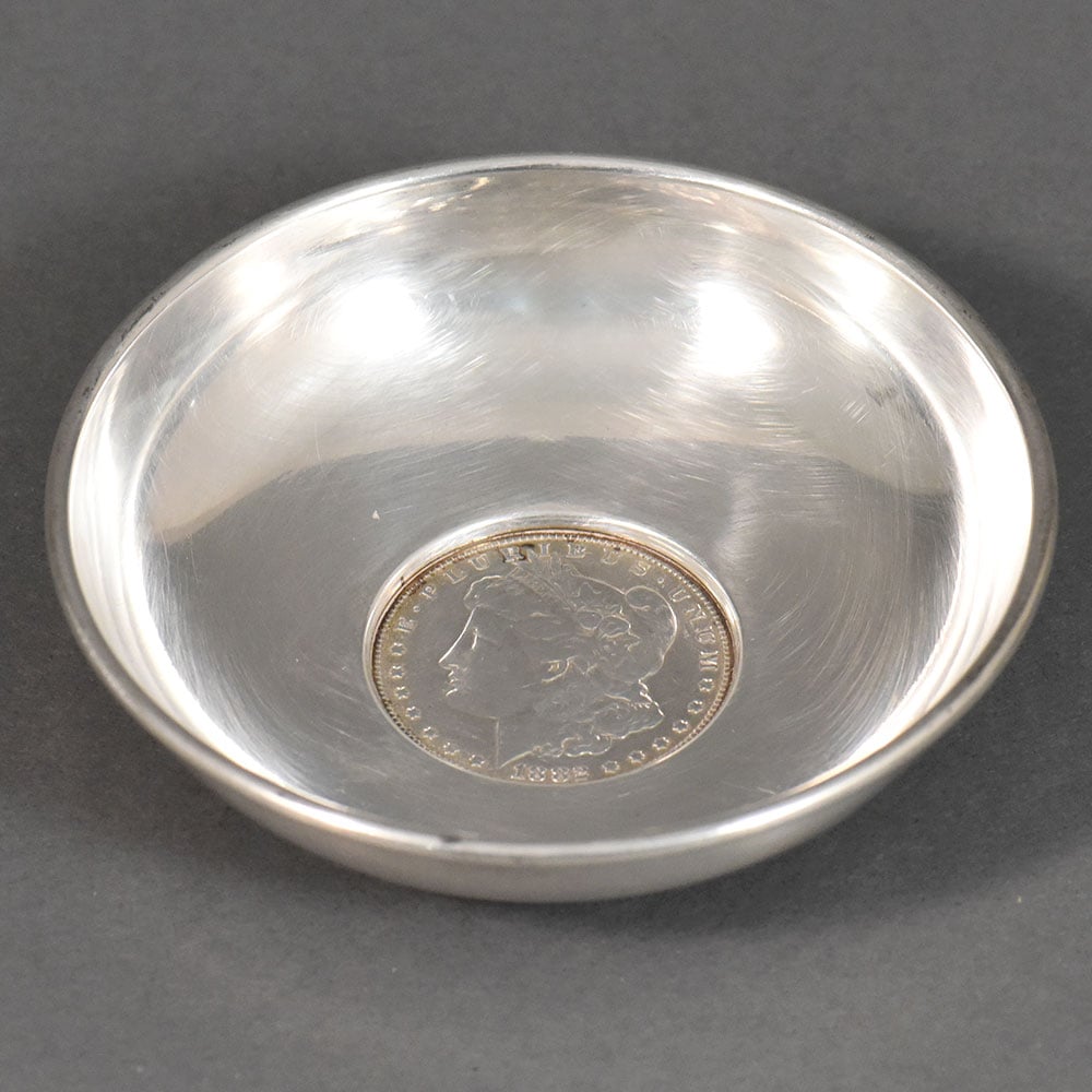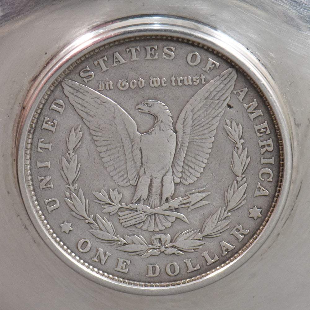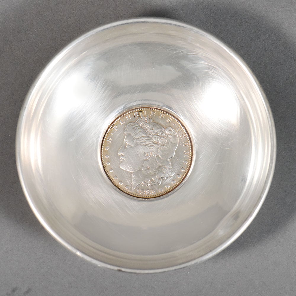 This finely crafted silver dish is a distinctive example of American sterling silver work, notable for its centrally mounted United States Morgan silver dollar. The dish is formed with a shallow circular bowl and a low stepped foot, giving it a balanced, understated profile suitable for display or refined table use. The interior features a genuine Morgan silver dollar securely set into the base of the bowl. The coin displays the classic Liberty portrait with the inscription E Pluribus Unum on the obverse, and the heraldic eagle with spread wings, United States of America One Dollar, and the motto In God We Trust on the reverse. The coin is original to the piece and integrated as a decorative focal point rather than a later addition.