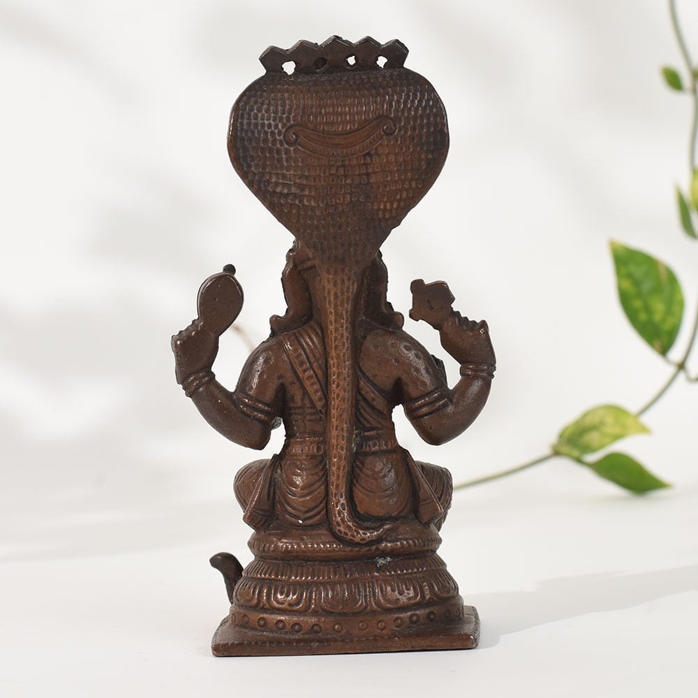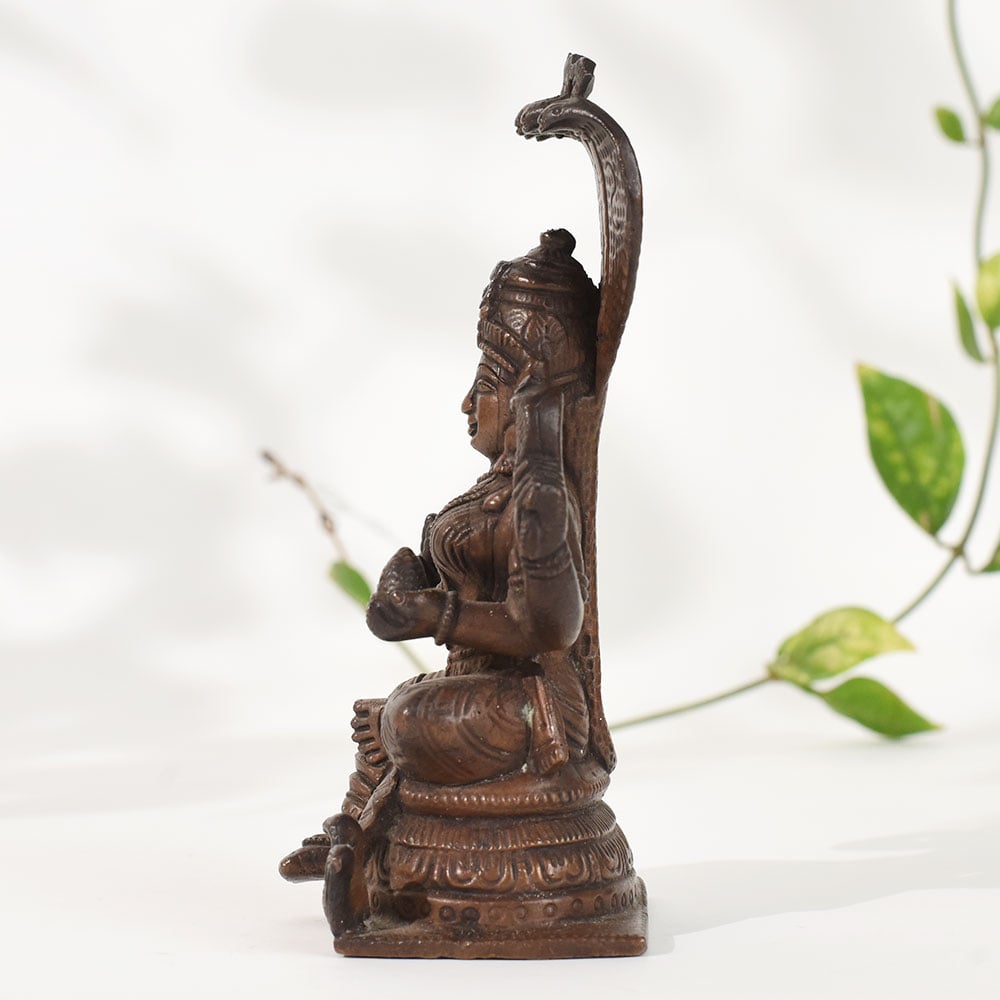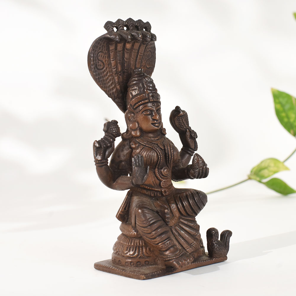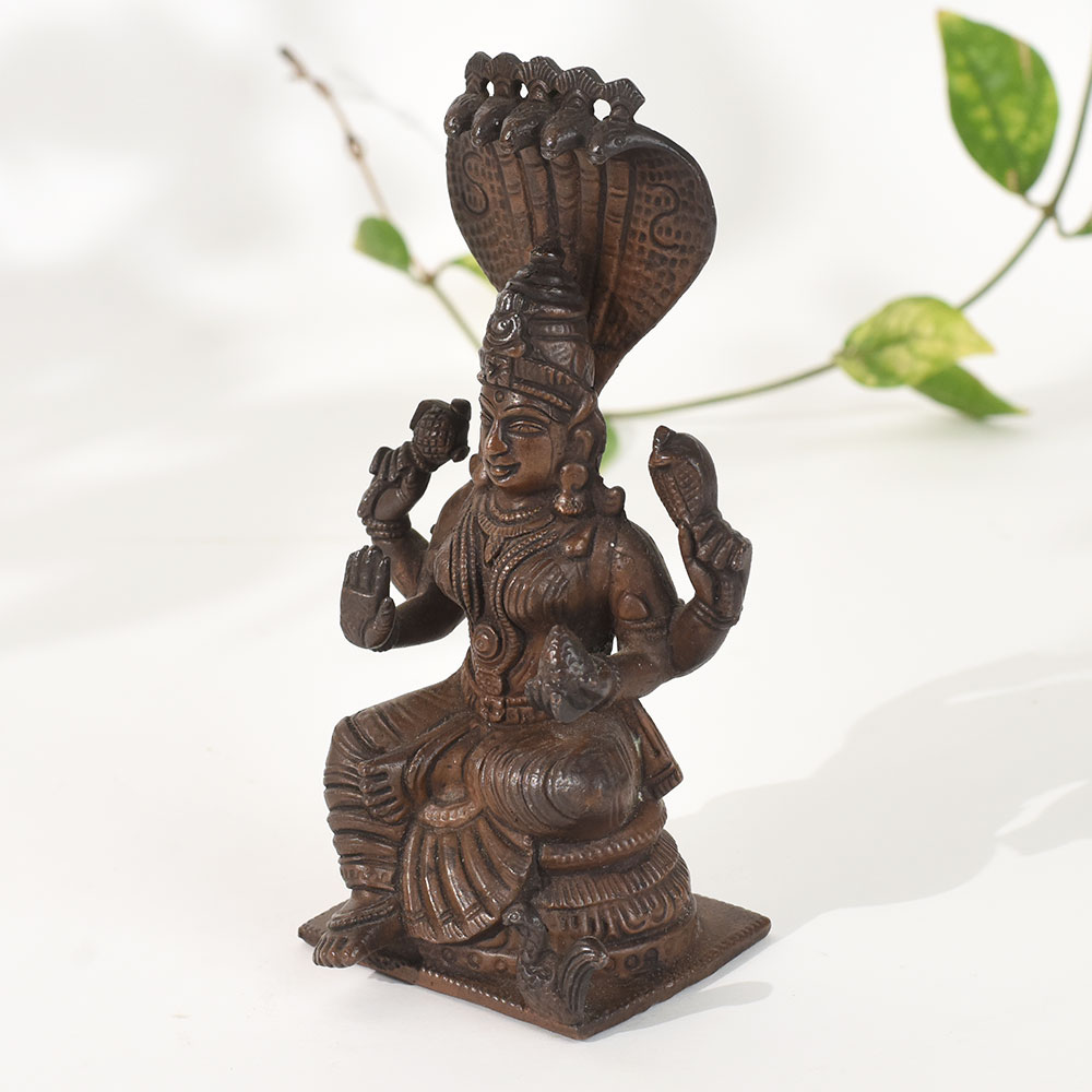 Celebrate the essence of classical South Indian artistry with this vintage copper goddess Mariammanstatue, intricately designed with rich temple-style detailing. The goddess sits gracefully beneath a multi-hooded serpent canopy, a powerful symbol of protection, divine energy, and spiritual awakening in South Indian iconography. Crafted in solid copper, the sculpture features fine detailing in the face, attire, ornaments, and posture, showcasing the mastery of traditional metal artisans. The naturally aged patina enhances its antique charm, making it a perfect addition to pooja rooms, meditation corners, heritage-themed decor, or spiritual displays. This statue carries cultural depth and devotional significance, creating a serene and grounding presence wherever it is placed. Whether used for daily worship, showcased as a decor statement, or gifted to someone who appreciates traditional Indian craftsmanship, this vintage copper goddess idol brings beauty, symbolism, and spiritual warmth to any environment.