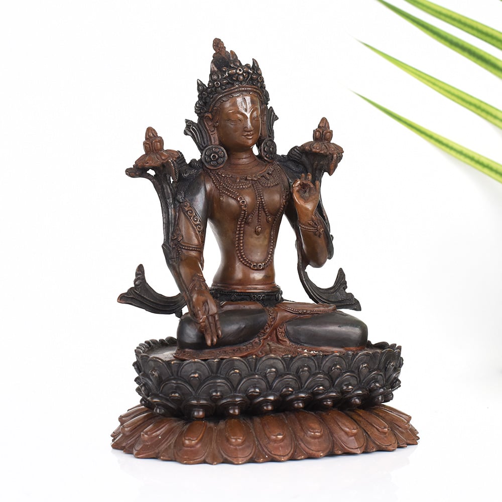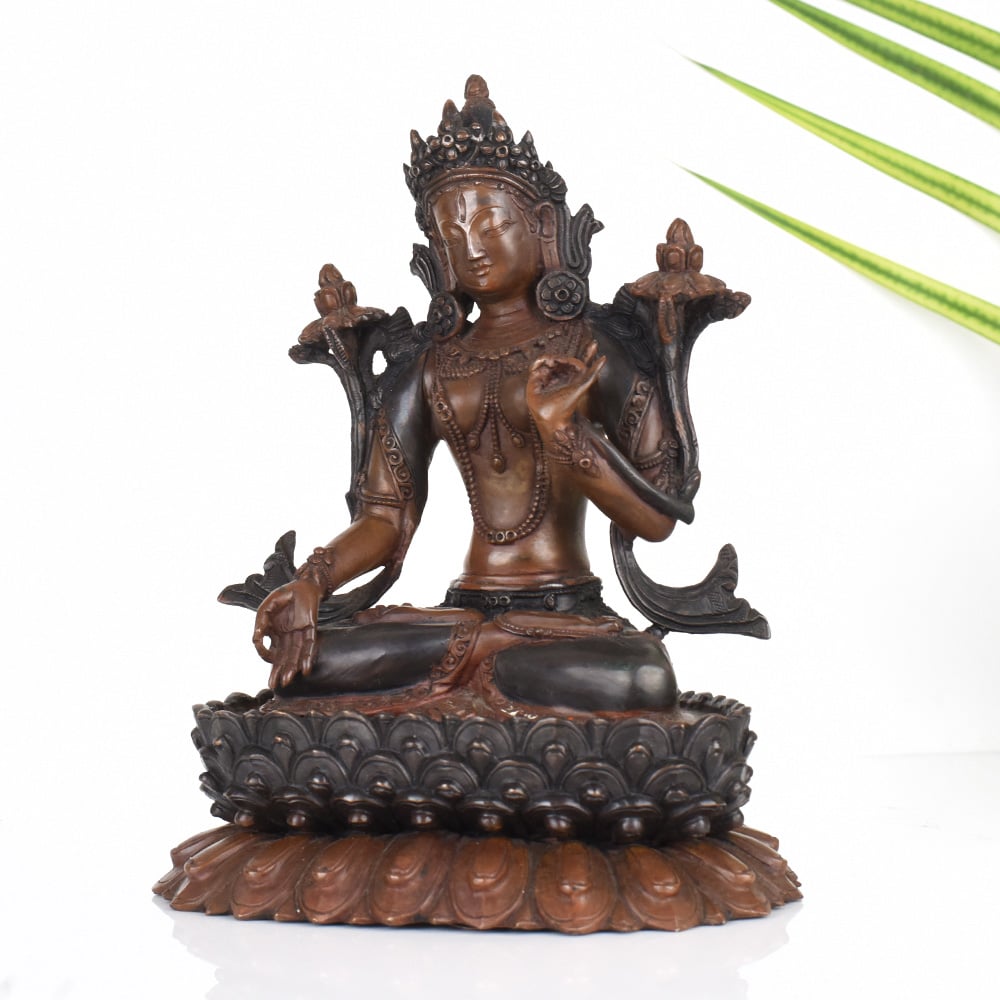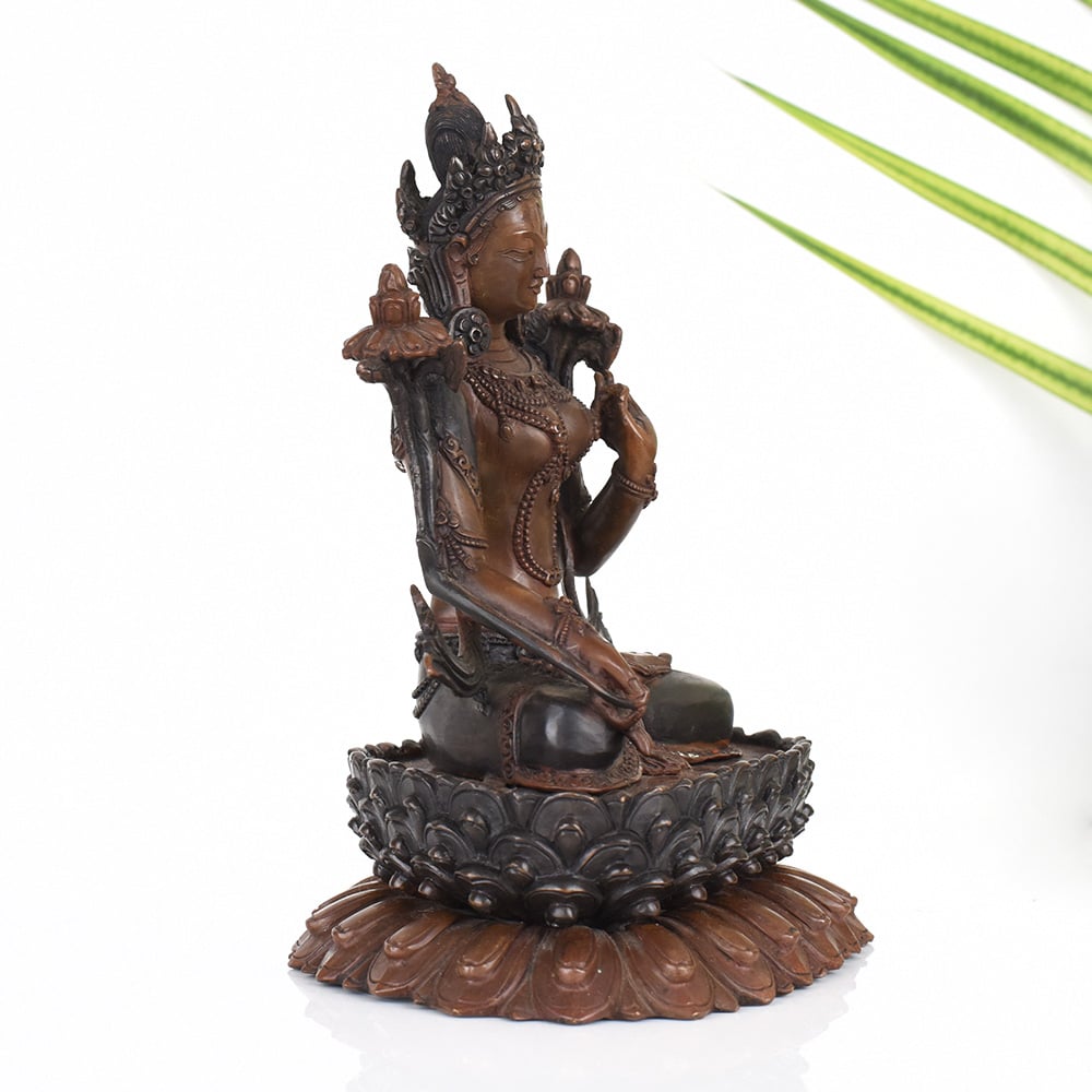 Elevate your meditation and prayer practice with this stunning vintage copper Tibetan Art Goddess Tara statue. Crafted with exquisite detail and imbued with centuries of sacred tradition, this awe-inspiring figure invites you to connect with the divine feminine energy of compassion, wisdom, and protection. Invite the blessings and bountiful grace of the Goddess Tara into your life. As you gaze upon her serene countenance, feel your worries melt away and your spirit lift. This sacred statue will become a cherished centerpiece, inspiring you to cultivate the qualities of unwavering compassion, fearless courage, and unwavering faith. Whether you're a devoted Buddhist practitioner or simply seeking to enhance your spiritual journey, this Goddess Tara statue will be a treasured companion. Place her in your prayer room or meditation space to elevate your practice, or use her as a beautiful decorative accent that radiates a sense of timeless wisdom and divine feminine power.