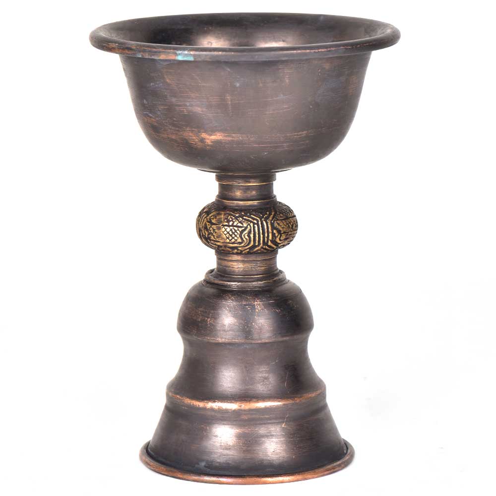 This traditional incense burner has a flared shape and is held by a thick and a decorative handle . The handle is long and thick as it gets heated up by burning coconut husk on which incense is sprinkled and used for various religious functions.