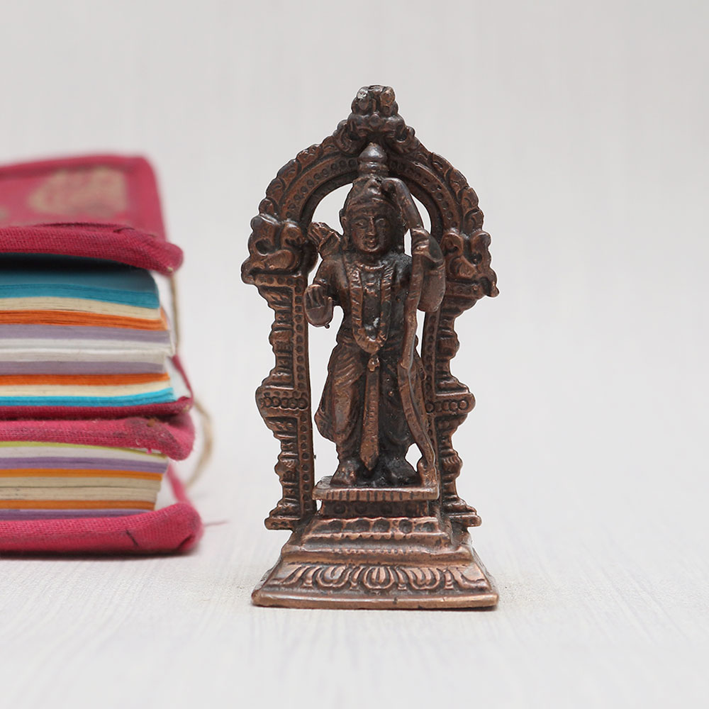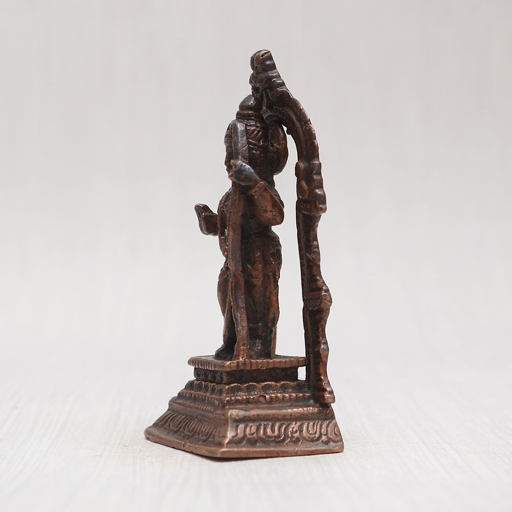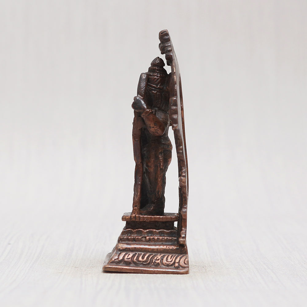 Buy a Copper Statue of Lord Ram online that is crafted by local Indian artisans with unparalleled artistry and devotion. Standing gracefully on a sturdy platform adorned with a captivating prabhavali, this masterpiece is meticulously handcrafted from high-quality copper, giving it a timeless vintage finish. This mesmerizing Lord Ram statue is a perfect addition to your prayer room at home, office, restaurant, cafe, or shop, radiating positive vibes and spiritual energy. Designed with reverence, this statue is not only a symbol of devotion but also an essential piece for worship in temples. Its versatile charm makes it a thoughtful and cherished gift for your loved ones on special, festive, or auspicious occasions. Experience the divine aura of this enchanting creation and easily buy idols online - a divine possession for your personal sanctuary.