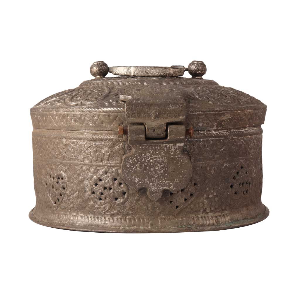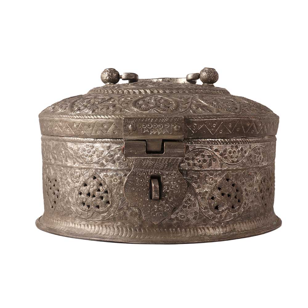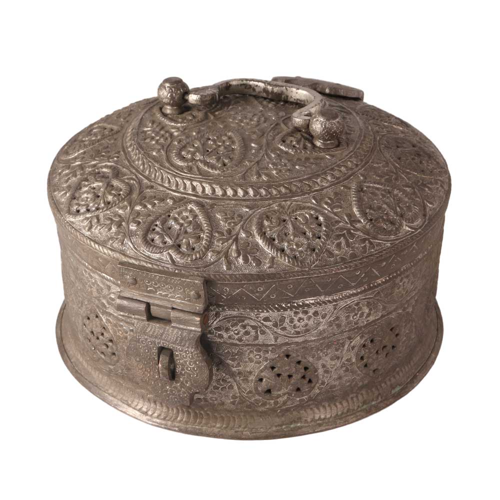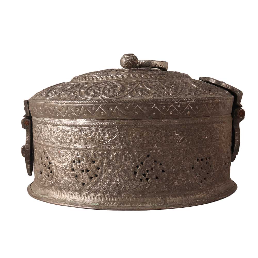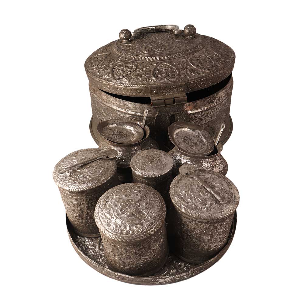 A handmade vintage style paandan made of the best copper to enhance your home decor. This copper paandan is made by skilled craftsmen with intricate details. It has been engraved with beautiful design and floral motifs and with jail work. It has 6 containers and 4 spoons which have been used to store paan ingredients in vintage time. In ancient times, paandan was used by kings and wealthy peoples to reflect their rich heritage. Decorate your home with a handmade paandan or add this incredible artifact to your vintage art collection. A perfect decorative piece for your home to reflect your rich heritage and an ideal gift for your loved ones on special occasions.