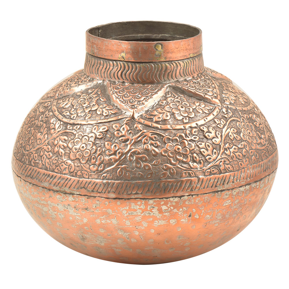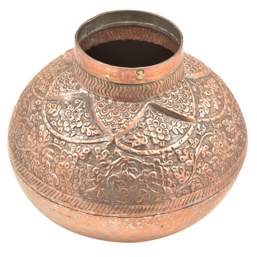 Hand-tooled vintage copper water pot bowl or lota with repousse embossed floral and leaf design vase or pot used to store or transfer small amounts of liquids such as water, particularly for cleaning and ritual purification. It would make a perfect flower vase. Almost every surface is covered - the leaf design on the bottom is repeated on the neck with a wide band of small flowers and leaves between. The Pot features a bulbous bottom rising to a tapered, cylindrical neck with rolled top edge on the rim.
