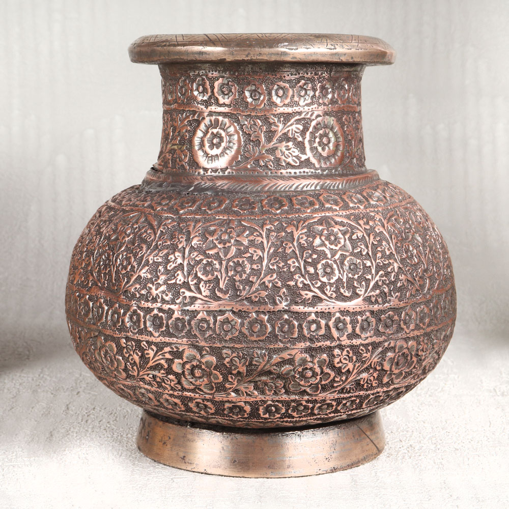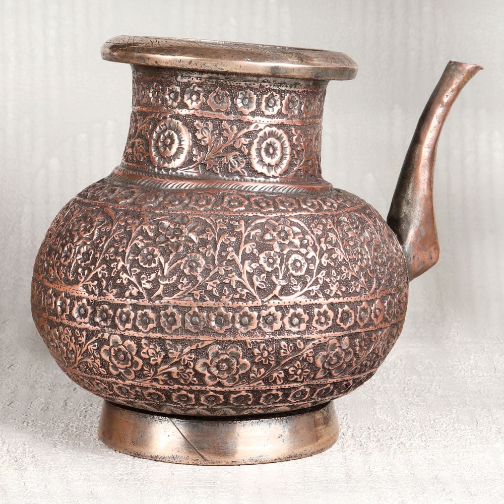 Buy a Vintage Copper Water Pot with Spout online that is a testament to the timeless craftsmanship of highly talented Indian artisans. Handcrafted in the heart of Hyderabad, this piece is a work of art, steeped in the rich heritage of Islamic design. Crafted from the highest quality copper, it bears an antique brown finish that lends it a rustic charm. The surface is adorned with intricate engravings, showcasing the artistry that has been passed down through generations. Its versatile design allows it to grace various settings, be it in your home, office, restaurant, hotel, or cafe, enhancing the ambiance with its historic allure. This pot serves more than just an ornamental purpose, it can also be used during religious rituals and prayers, making it a cherished item in temples and prayer rooms. For vintage collectors, it's a rare gem, and for exhibition enthusiasts, it's a captivating centerpiece. Furthermore, it makes a thoughtful and meaningful gift for your loved ones on special, festive, or auspicious occasions.