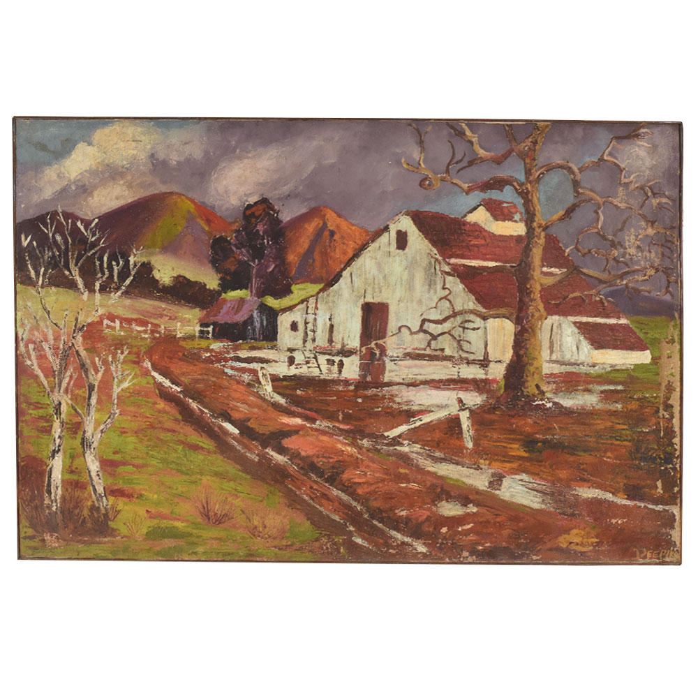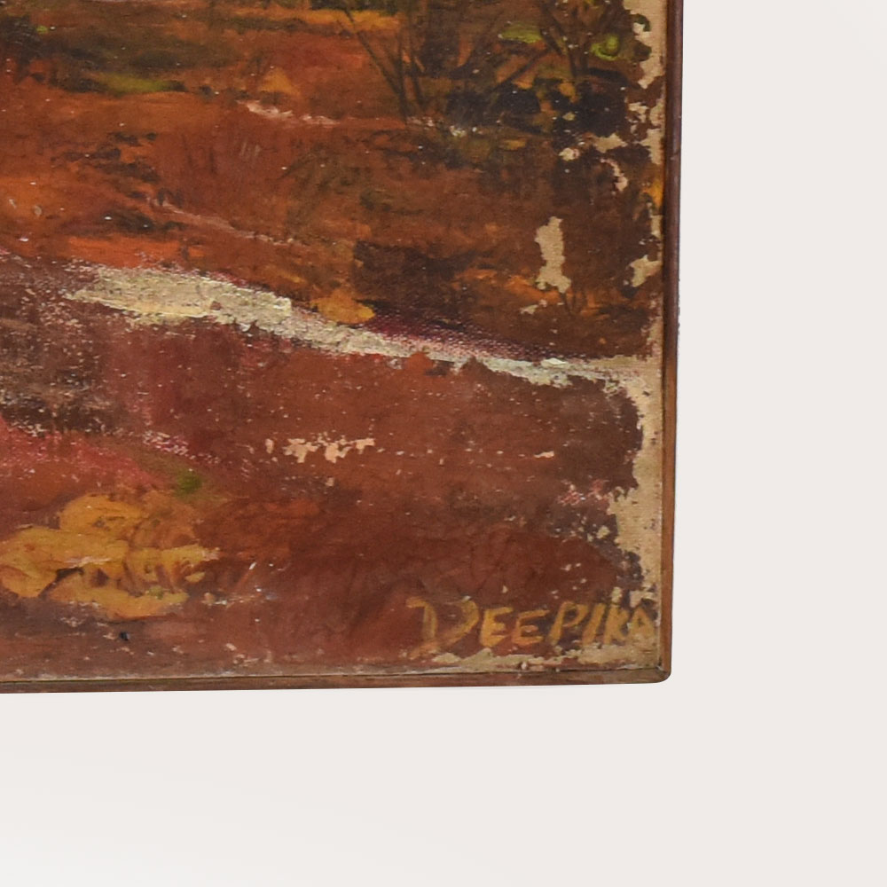 This vintage hardboard painting beautifully portrays a rustic countryside scene, capturing the essence of rural charm and tranquility. The composition features weathered white barns with deep red roofs, set against a backdrop of rolling hills painted in earthy ochre, muted green, and rich brown tones. A leafless tree in the foreground, with its twisting branches, adds a dramatic and nostalgic touch, suggesting the quiet stillness of late autumn or early winter. The artist has skillfully blended bold brushstrokes with textured detailing to bring depth and life to the scene. The meandering dirt path, bordered by patches of grass and worn fences, draws the viewer’s eye towards the heart of the composition, creating a sense of journey and storytelling. The contrast between the vibrant landscape and the somber sky adds mood and atmosphere, evoking the charm of pastoral life in a bygone era. Painted on hardboard, this artwork retains its vintage appeal, with a naturally aged surface that enhances its authenticity. Ideal for farmhouse-style interiors, rustic decor themes, or collectors of rural landscape art, this piece offers a timeless glimpse into the beauty of the countryside.