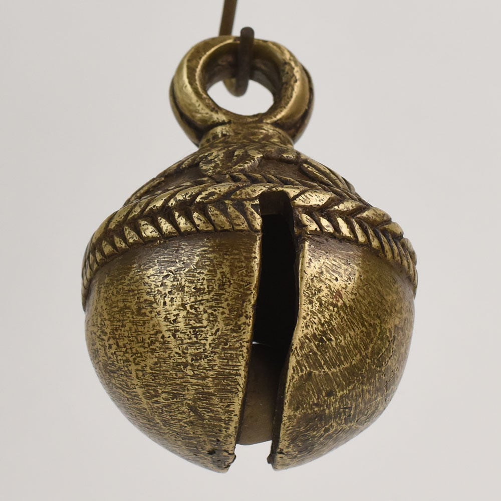 This rustic Indian cow bell, crafted from traditional bell metal, offers a timeless glimpse into Northern Indias pastoral lifestyle. The bells hand-shaped form features a smooth rounded base and sturdy loop top, making it both functional and charming. Its aged patina reveals layered hues of bronze, charcoal, and tawny gold, giving the piece an unmistakably vintage appearance. Perfect for rustic homes, bohemian interiors, or collections of global artifacts, this bell adds texture and authenticity to any display. Its artisanal origins and weathered look make it ideal for hanging dcor or as a distinctive tabletop accent. The bell is not only decorative but also a cultural artifact enriched with history, warmth, and handcrafted beauty.