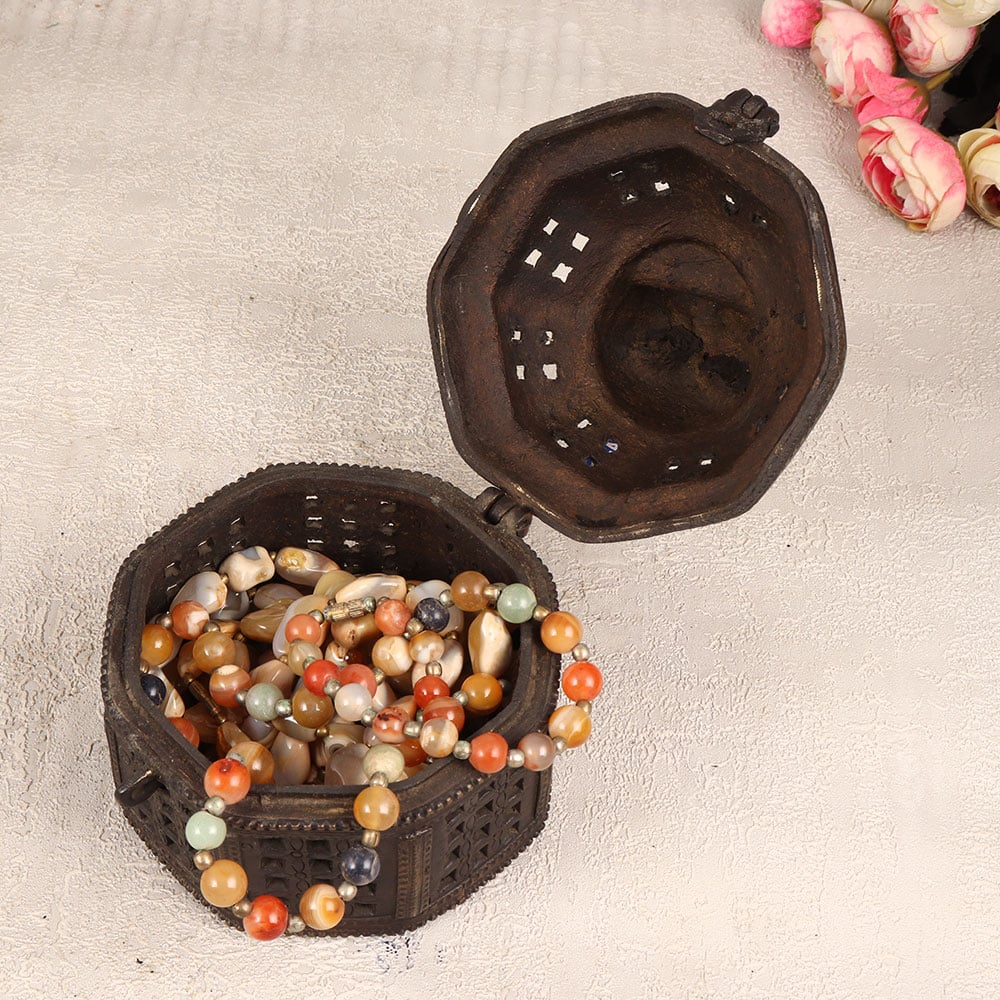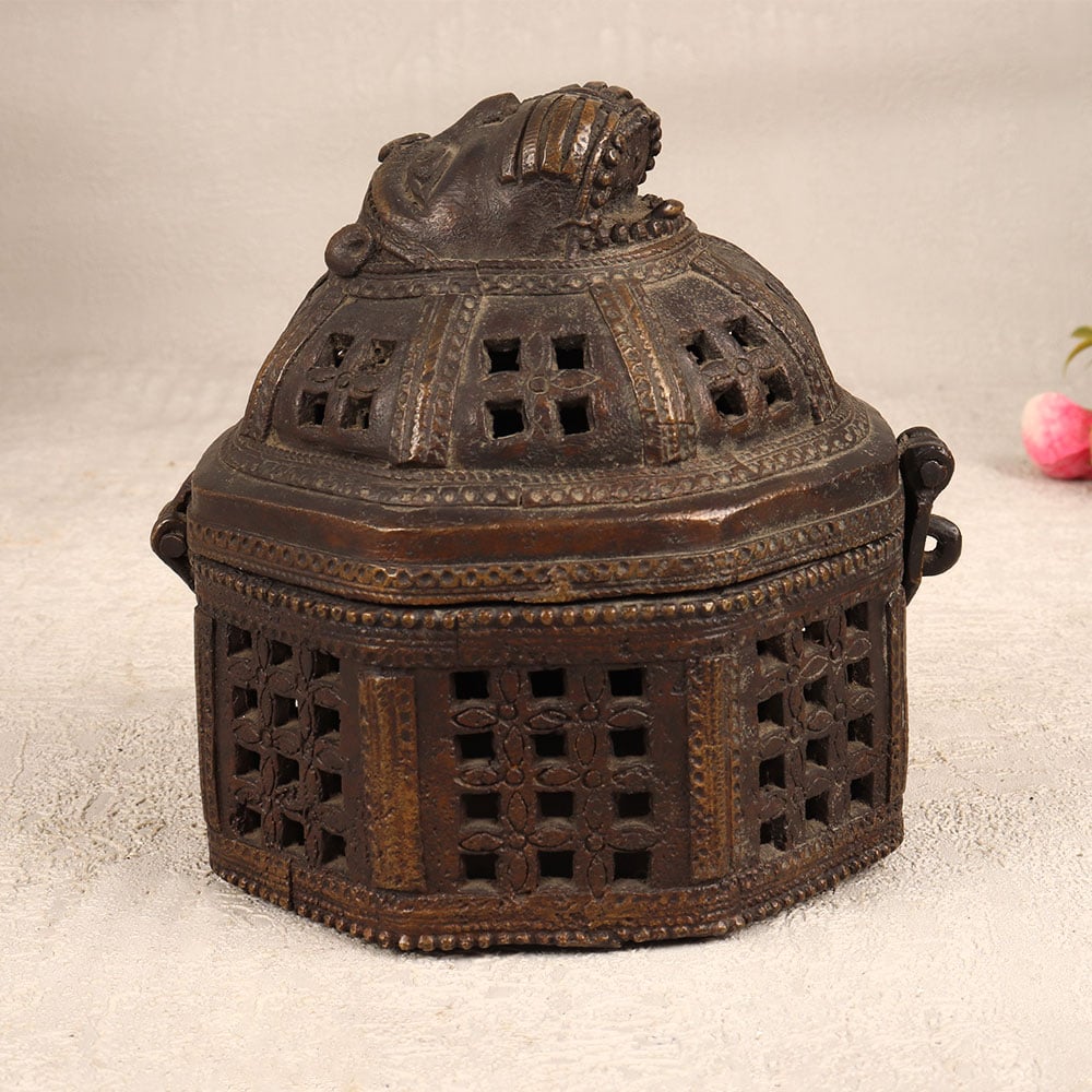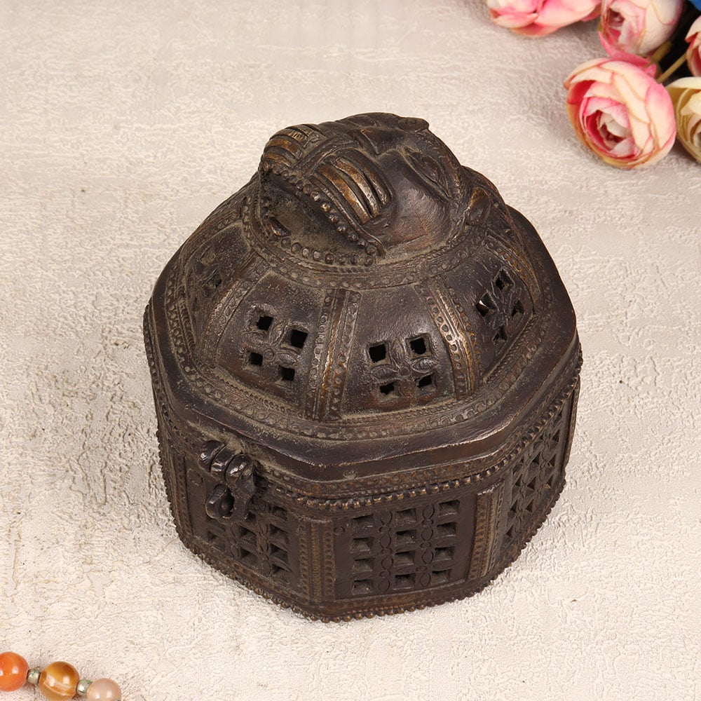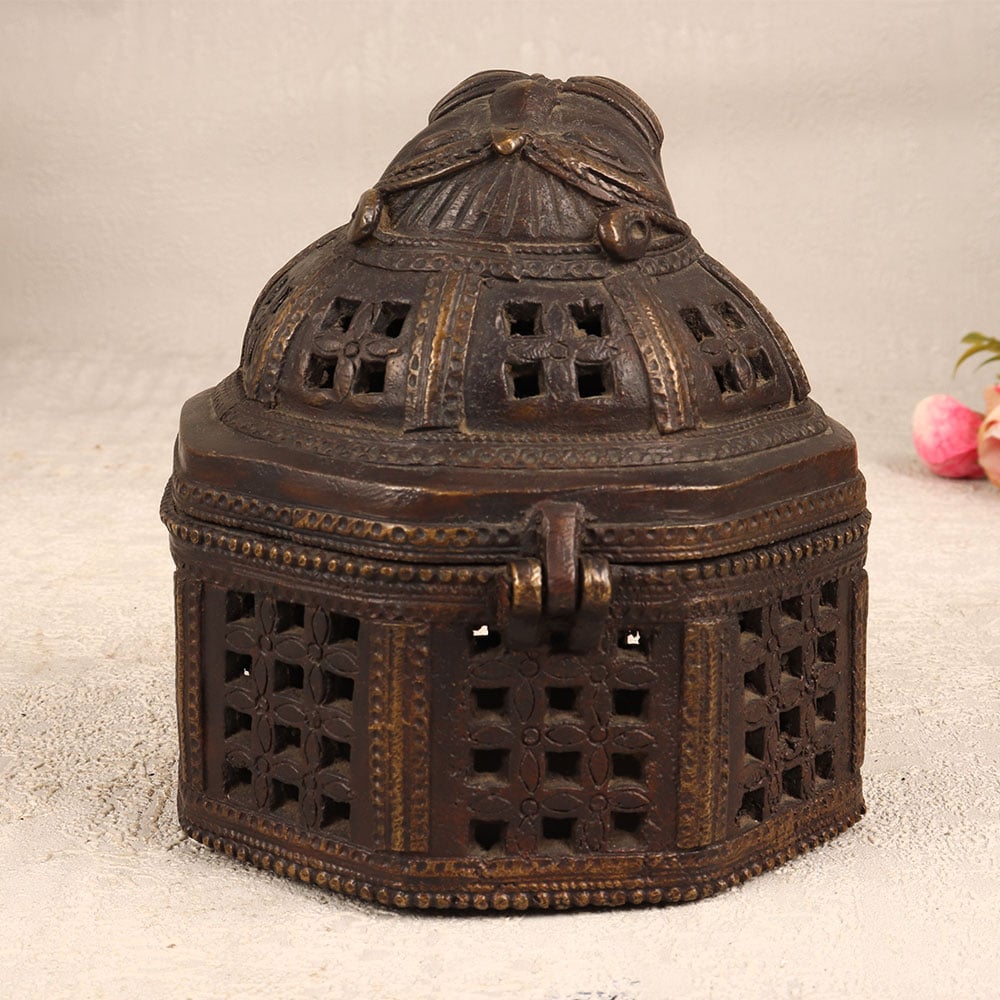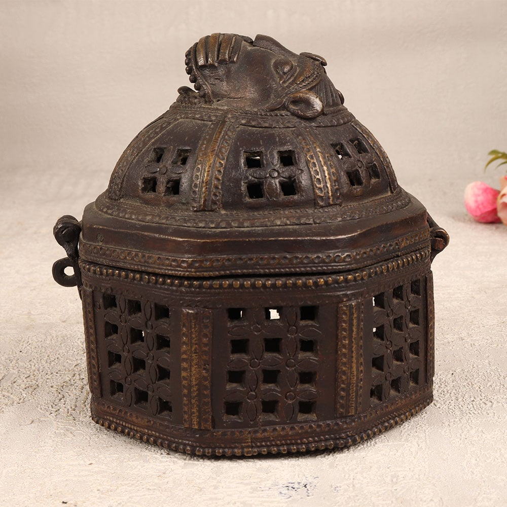 Decorate your living room with the timeless allure of our Vintage Brass Jewelry Box that is a true masterpiece handcrafted by highly talented Indian artisans in the rich tradition of Odisha Art. This round-shaped box, resplendent in its antique dark finish, exudes an air of opulence and sophistication. The exquisite jali work, with intricate engravings adorning its surface, showcases the artisan’s mastery in metal craftsmanship. The box features a secure latch, ensuring that your precious stones and jewelry are not just stored but elegantly protected. Atop this magnificent creation rests a face intricately carved, adding a touch of artistry and individuality. Versatile and captivating, this jewelry box seamlessly blends into various settings - be it at home, in your office, a chic restaurant, a luxurious hotel, or a charming cafe - enhancing the ambience with its vintage charm. A perfect addition to any collector's trove, this brass jewelry box stands as a testament to the enduring allure of classic design. It makes for an ideal gift, evoking nostalgia and appreciation for the meticulous craftsmanship embedded in its creation, a thoughtful gesture for your loved ones on special, festive, or auspicious occasions.