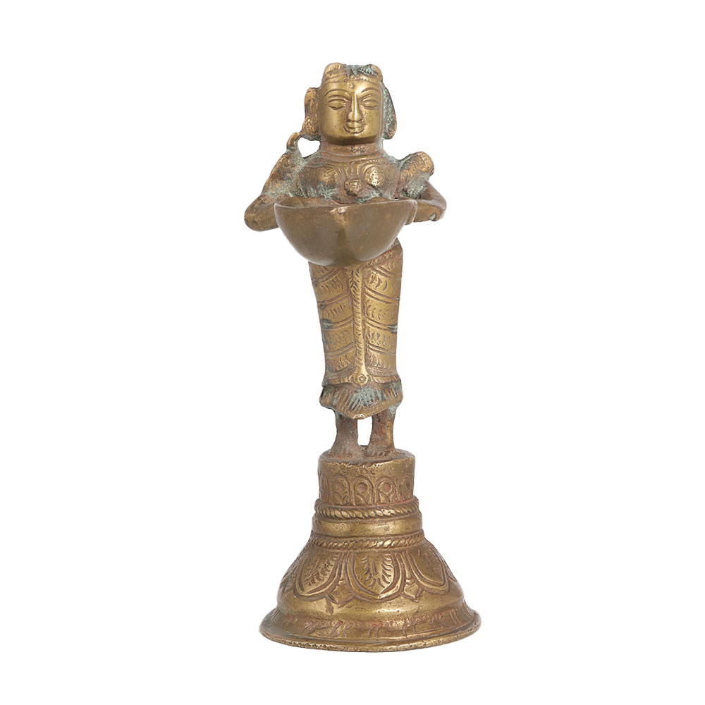 A Deeplakshmi or Deep Lakshmi statue holding a lamp in her hands. These statues are used in temples and at home for morning and evening prayers, auspicious occasions and rituals. This auspicious statue is made of high quality brass and features Goddess Lakshmi holding a lamp in her hands, which can be lit with mustard oil or ghee and a cotton wick. At the bottom is a bell that can be used in rituals or prayers. This incredible piece is made by professional Indian artisans from South India with their hands to give the decoration a long lasting impression. Place this statue in your prayer room at home, office, hotel, cafe, restaurant or shop. An ideal gift for your friends, family or relatives for any special and festive occasion.