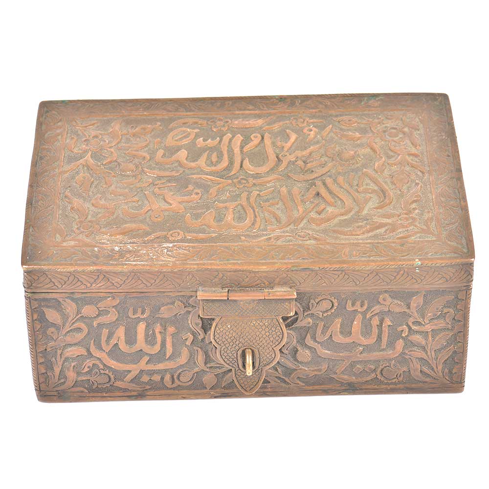 This lovely box appears to be made of copper. It has a beautiful embossed pattern on the entire surface of the box .It has a hinged lid and a latched closure. Store your valuables, jewelery and important documents in this box. It is an ideal gifting option for friends and relatives .