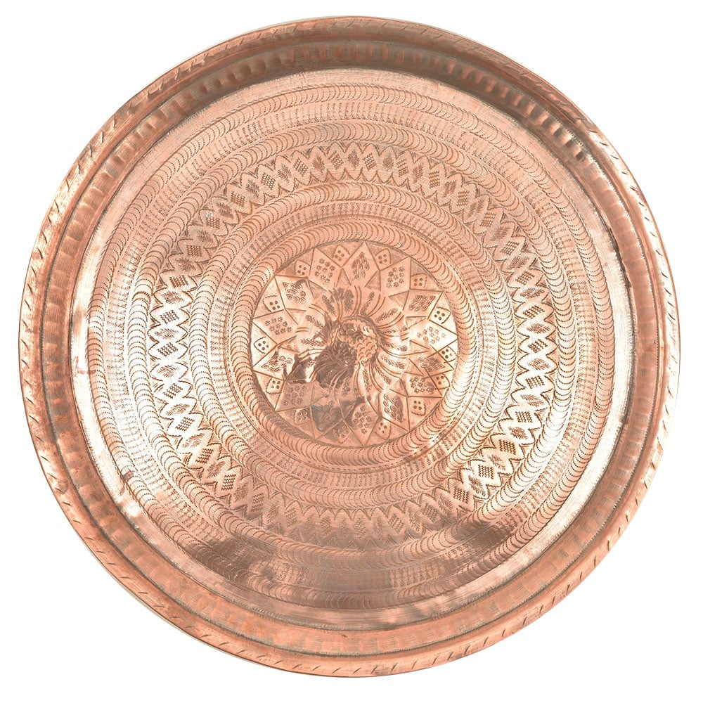 Handmade copper etched and carved Cooper plate with several rings of design to give it an elegant and traditional look. It has a beautiful Flower and leaf design in the centre and diamond design. The exterior has a beautiful roped type trim around the entire tray. Makes an Excellent wall hanging and home decor product.