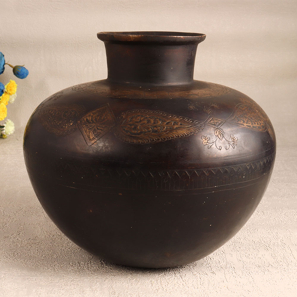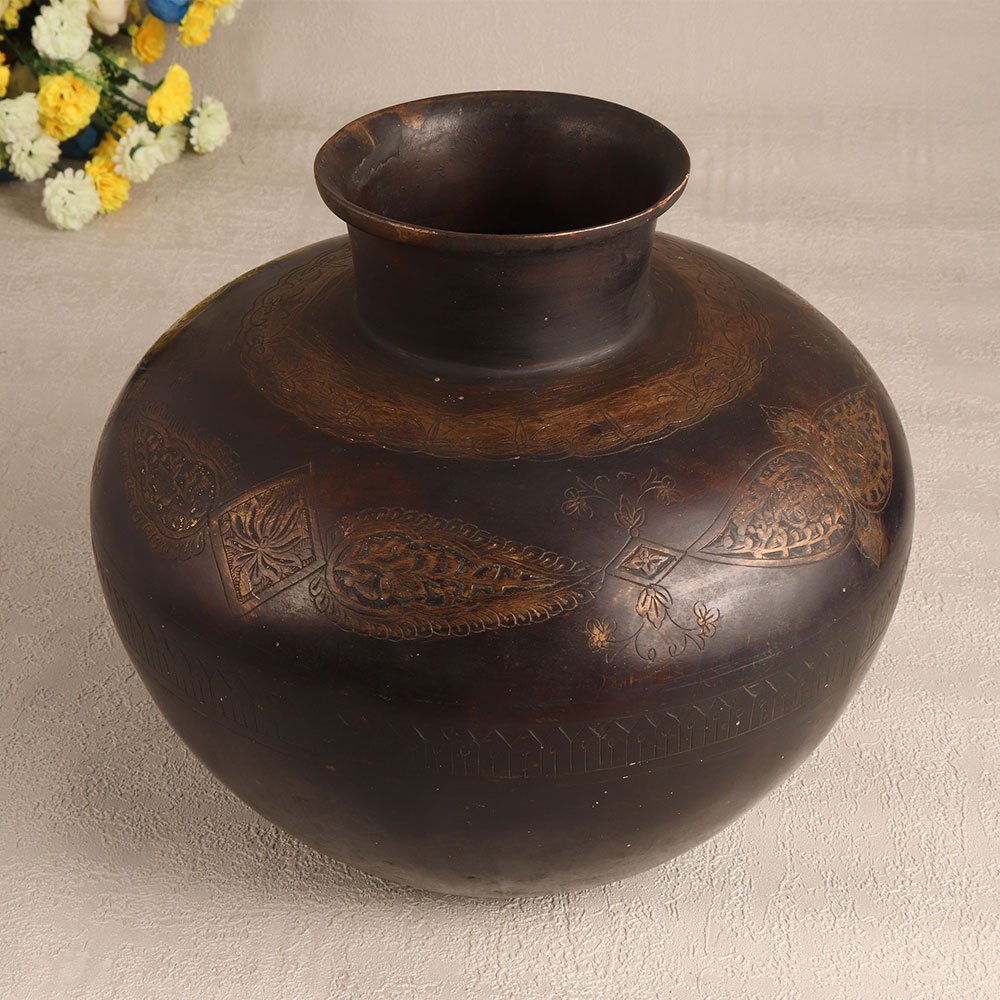 Buy a Vintage Brass Flower Pot online from our website and get a hassle free delivery at your doorstep. This exquisite piece is a testament to the craftsmanship of highly skilled Indian artisans hailing from the historic city of Hyderabad. Handmade with the utmost precision and care, this flower pot showcases their mastery in working with high-quality brass. The intricate carvings adorning the surface of the pot are a testament to the artisan's dedication to detail. The antique dark finish adds a touch of old-world charm, making it a perfect fit for a wide range of settings. Whether you're looking to enhance the ambiance of your home, office, hotel, cafe, shop, or restaurant, this flower pot will be an enchanting addition. Moreover, it's an ideal choice for collectors, as it can be proudly displayed at exhibitions and showcases. This brass flower pot also makes for a thoughtful and meaningful gift for your loved ones on special, festive, or auspicious occasions, allowing you to share the beauty and craftsmanship of Indian heritage.
