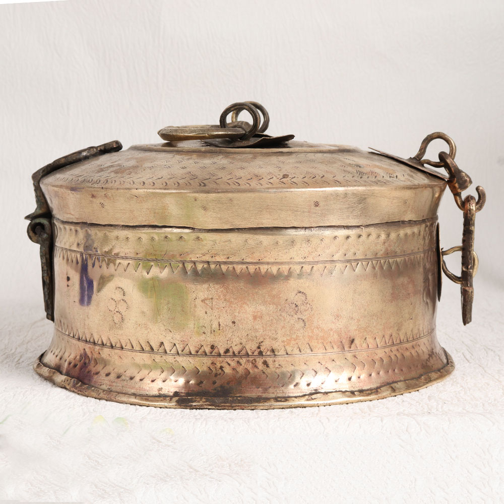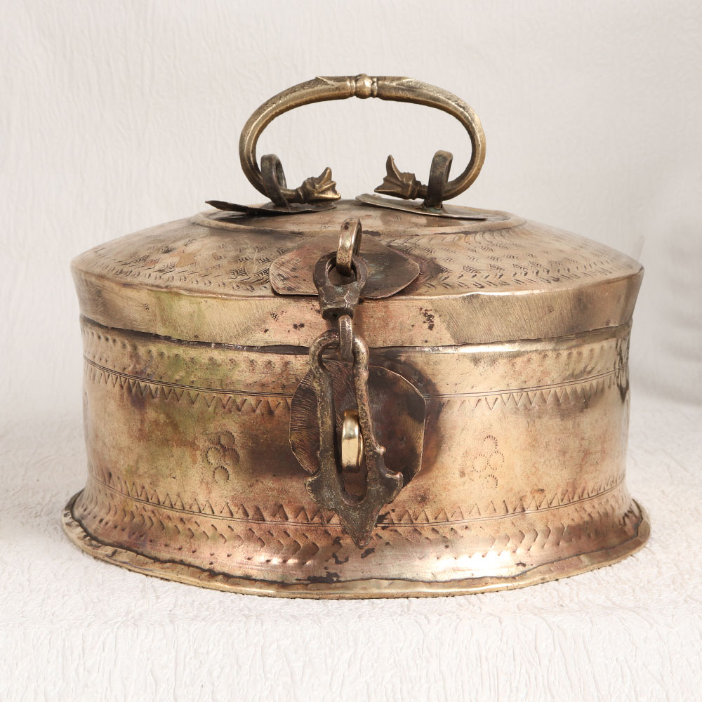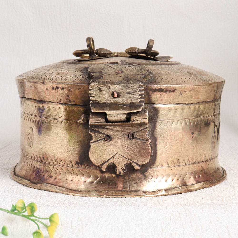 Buy a Vintage Brass Jewelry Box online from our website and get a hassle free delivery right at your doorstep. This exquisite piece is meticulously handcrafted by skilled Indian artisans that captures the essence of old-world charm. Crafted from high-quality brass, it boasts a rich antique brown finish that exudes warmth and character. The intricate carving on the lid adds a touch of artistry to this jewelry box. Its sturdy handle and secure latch make it both functional and aesthetically pleasing. Versatile in its application, this box is a perfect addition to your home, office, restaurant, hotel, cafe, or shop. Use it to store and display precious stones, gems, or jewelry, adding a touch of opulence to any space. Whether you're an avid collector of vintage treasures or wish to showcase it at an exhibition, this jewelry box is a conversation piece. It also makes for a thoughtful and timeless gift, perfect for your loved ones on special, festive, or auspicious occasions.