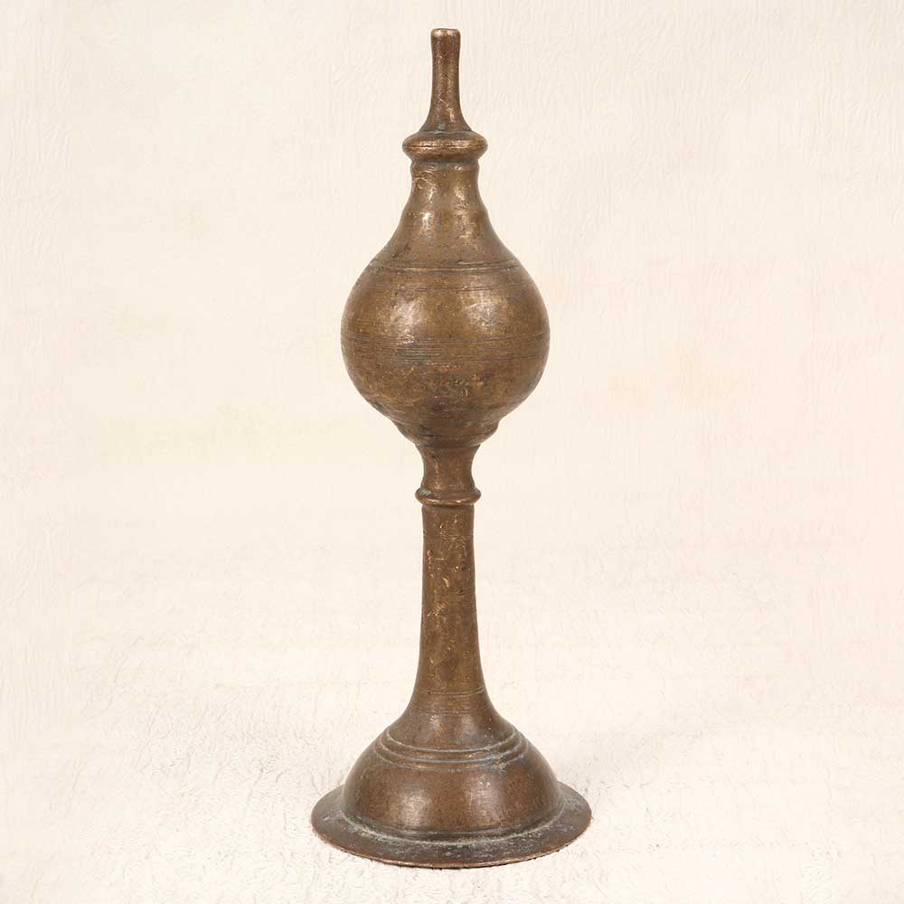 Bring a timeless glow into your home with this vintage brass oil lamp stand from Central India. With its intricate metalwork and elegant design, this lamp stand beautifully illuminates any space. Crafted by skilled artisans, this brass lamp stand adds a touch of history and artistry to your decor. The metal has a lovely aged patina, highlighting the handiwork while giving the lamp an antique look. Place it on an end table, bookshelf, or console table to provide a soft, romantic glow during the evenings. The lamp holder is designed for traditional diya oil lamps, bringing an authentic Indian element. Bring the mood and charm of a past era into your home with this exceptional vintage brass oil lamp stand. With its timeworn elegance and handcrafted style, this lamp stand is sure to become a treasured focal point.