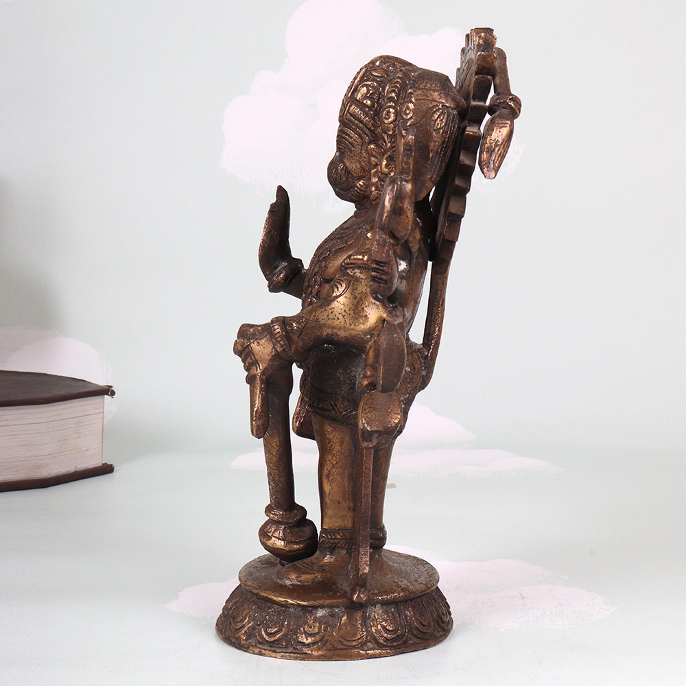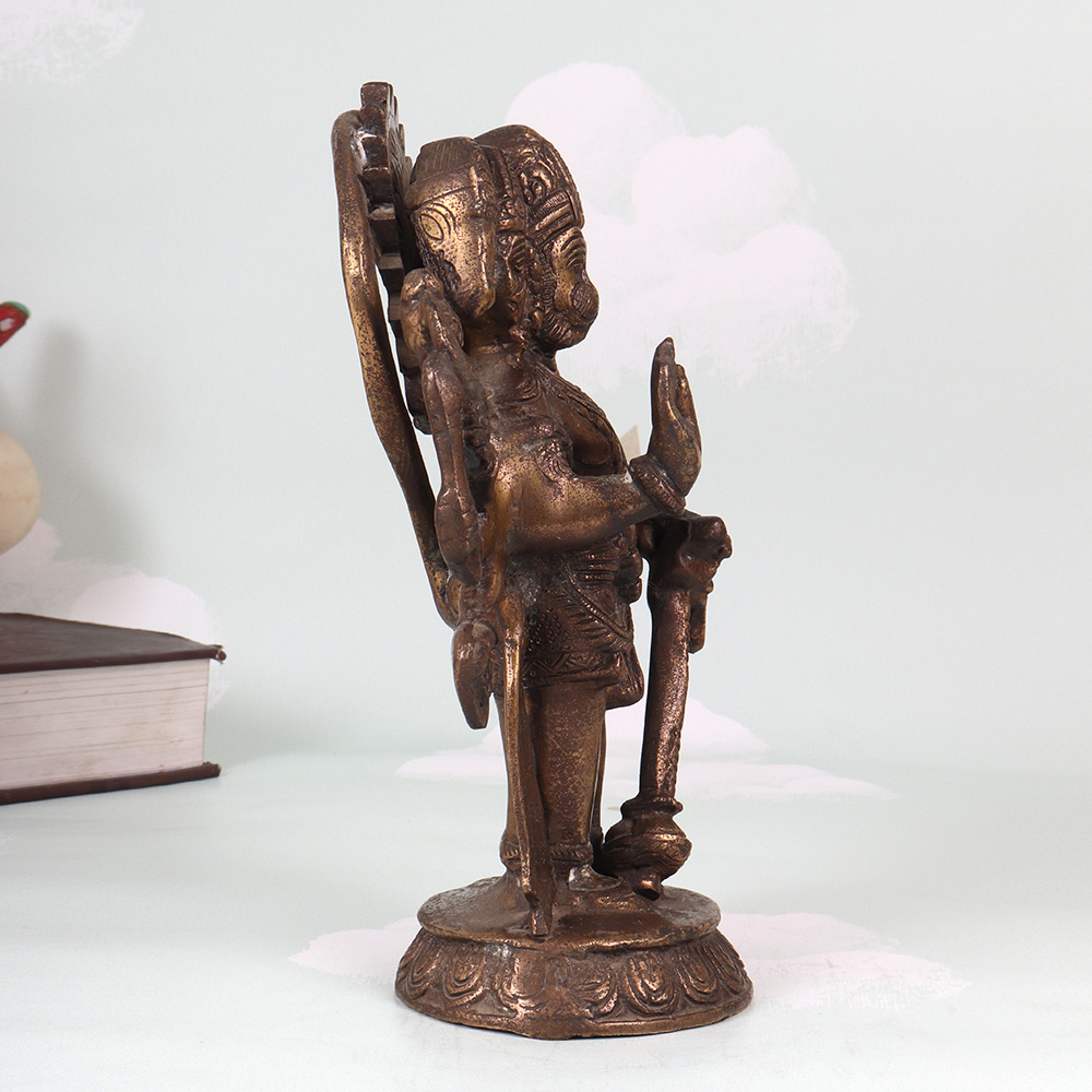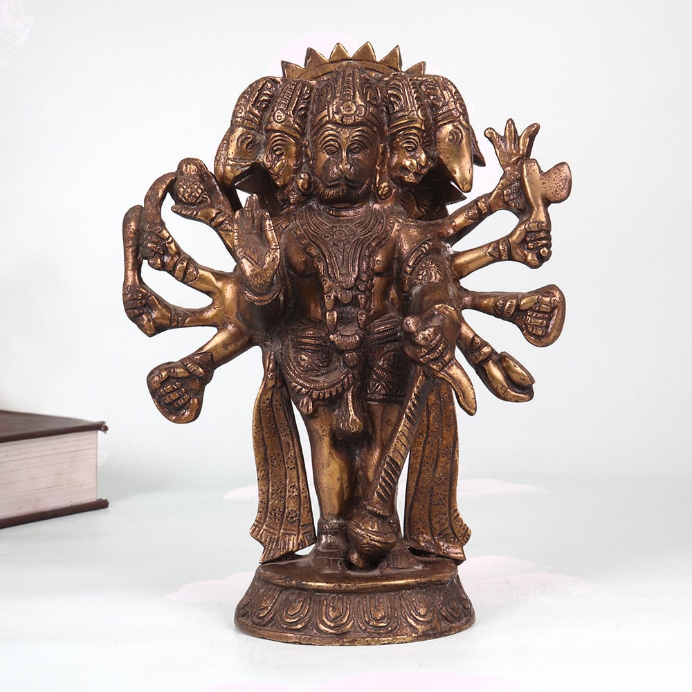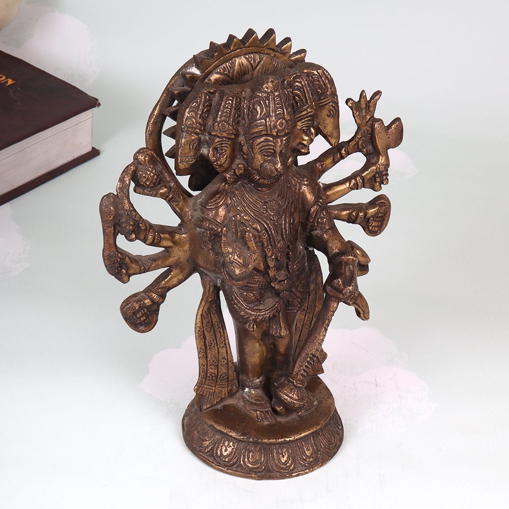 Bring the power and protection of the mighty Lord Hanuman into your home with this stunning vintage brass Panchmukhi (5-faced) statue. Crafted with exquisite detail, this heirloom-quality piece will captivate all who behold it. Lord Hanuman is the embodiment of unwavering devotion, boundless strength, and selfless service. Keeping his sacred image in your space invites his blessings of protection, courage, and the ability to overcome any obstacle. As you gaze upon this magnificent statue, feel your worries melt away and your spirit lifted by the palpable power of the Monkey God. This Panchmukhi Hanuman is perfect for devotees seeking a striking visual aid for meditation and puja. It also makes a thoughtful housewarming or wedding gift, imbuing any space with the divine benediction of this revered Hindu deity. Elevate your home decor and your spiritual practice with this museum-worthy brass masterpiece.
