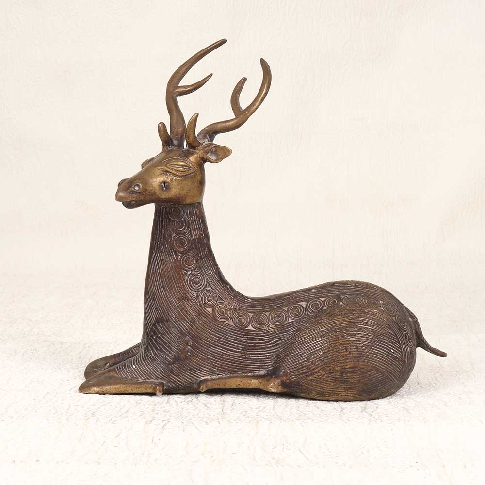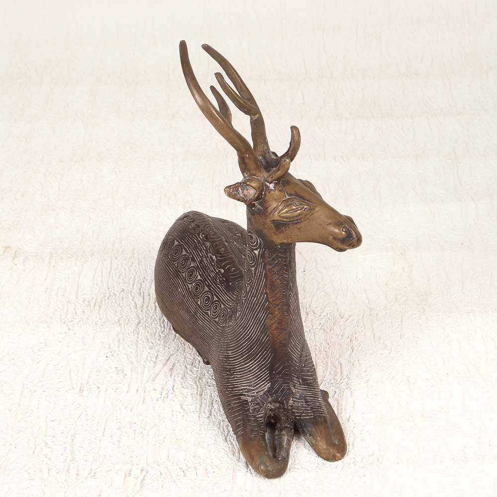 - Exquisitely detailed brass sculpture depicts a deer sitting peacefully