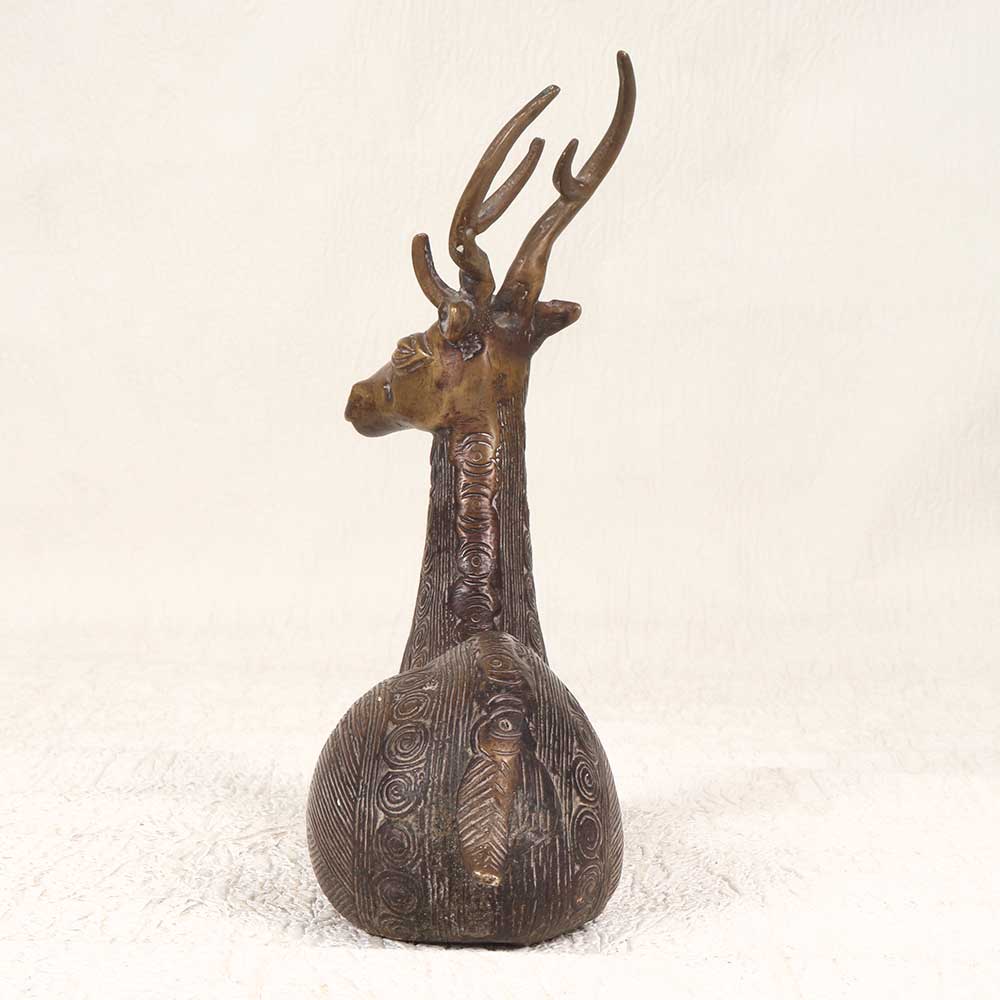Bring the beauty of nature into your home with this stunning brass sitting deer statue. Crafted by skilled artisans in Odisha, this vintage tribal art piece is sure to impress. This tribal deer statue pays tribute to the grace and serenity of nature. The deer sits with its head held high, alert yet calm, perfectly capturing the essence of this gentle creature. The fine details in this brass sculpture, from the textured fur to the slender legs folded under, demonstrate remarkable skill and dedication from the artisan. Place it on a shelf, tabletop, or mantel to add an air of tranquility to your living space. The vintage finish gives this deer statue the look of an antique, full of rich history and meaning. But its timeless beauty means it looks just as gorgeous in modern homes. For animal lovers, nature enthusiasts, and vintage decor fans, this brass tribal deer sculpture makes an inspiring addition to any indoor space.