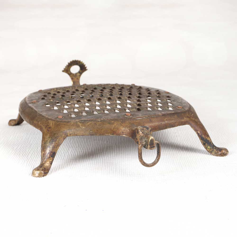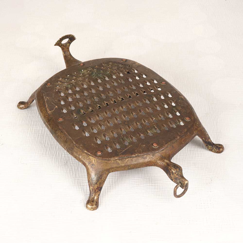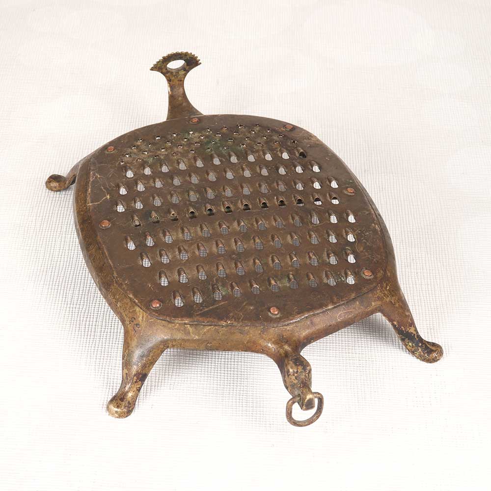Transport yourself to a bygone era with this vintage brass vegetable grater. Lovingly used and bearing the patina of time, this grater evokes nostalgia for old-world kitchens. Harken back to simpler times when fresh vegetables were lovingly grated by hand. This vintage brass grater is a charming relic of the past, perfect for grating vegetables, cheese, chocolate and more. Ideal for someone who appreciates antiques and wants an elegant yet functional kitchen accessory. This charming vintage grater enables you to connect with cooking traditions of the past. Display it as a decorative element or use it to grate ingredients for your vintage-inspired recipes. Either way, it's sure to be a treasured kitchen tool.