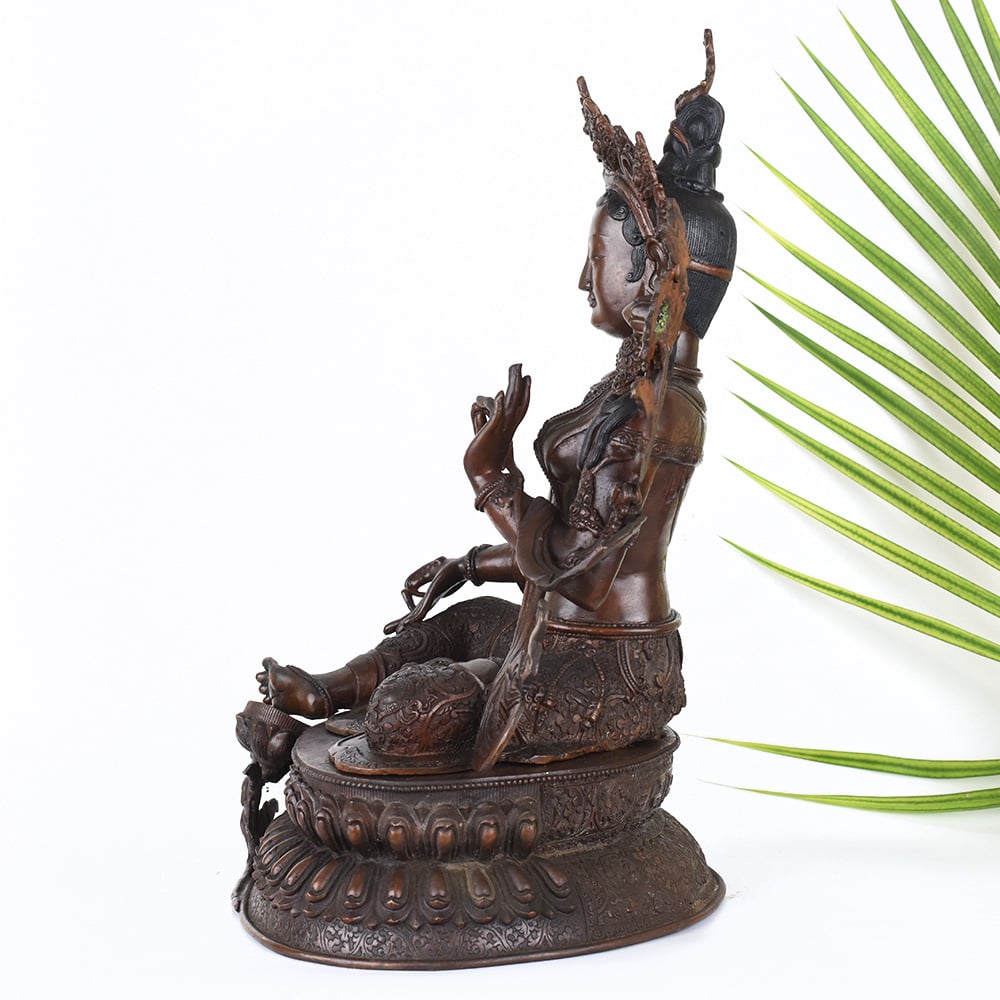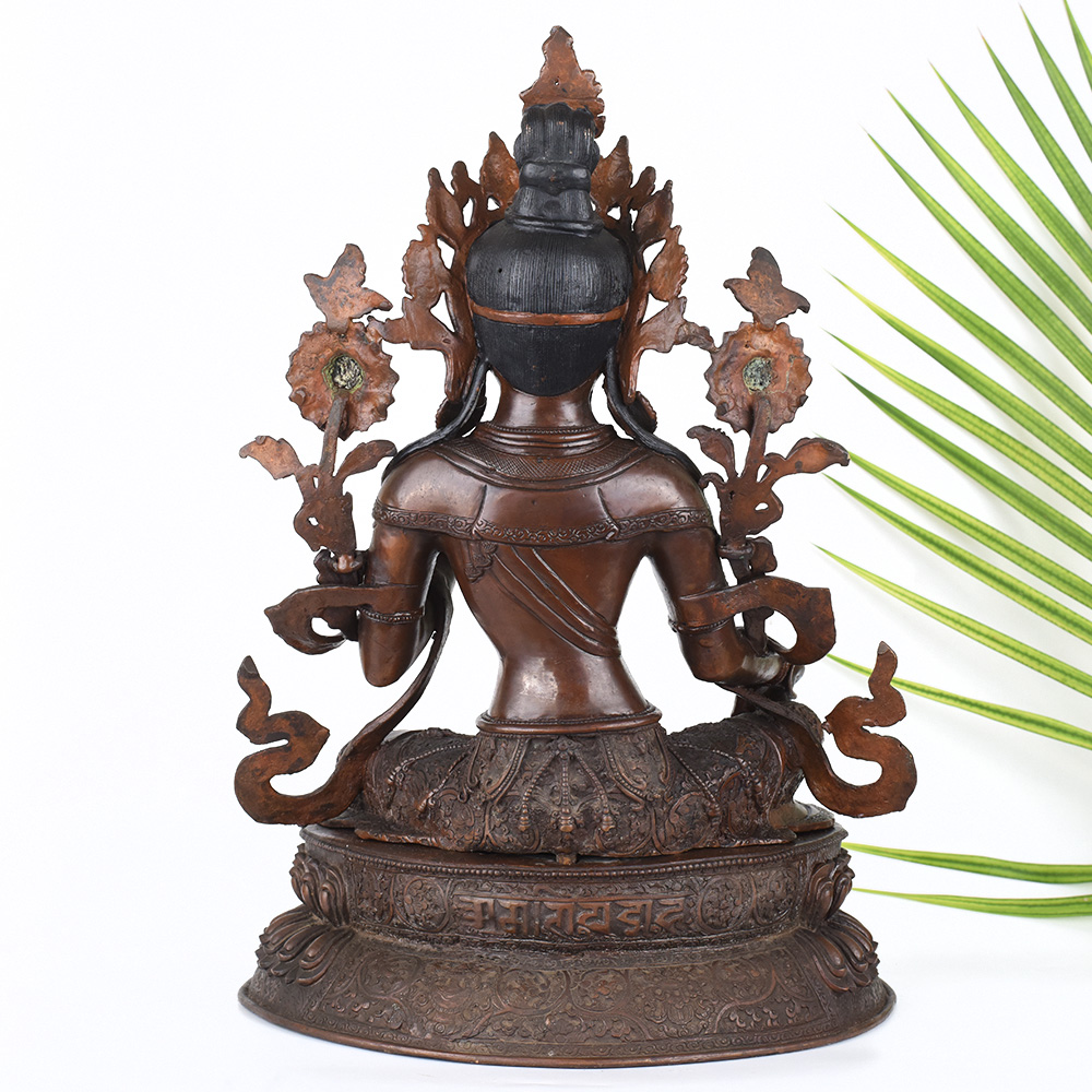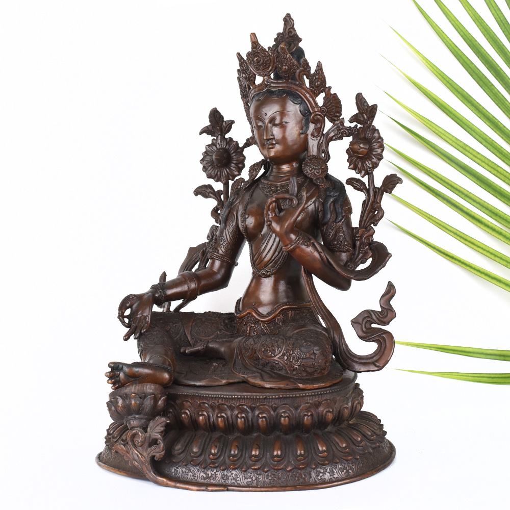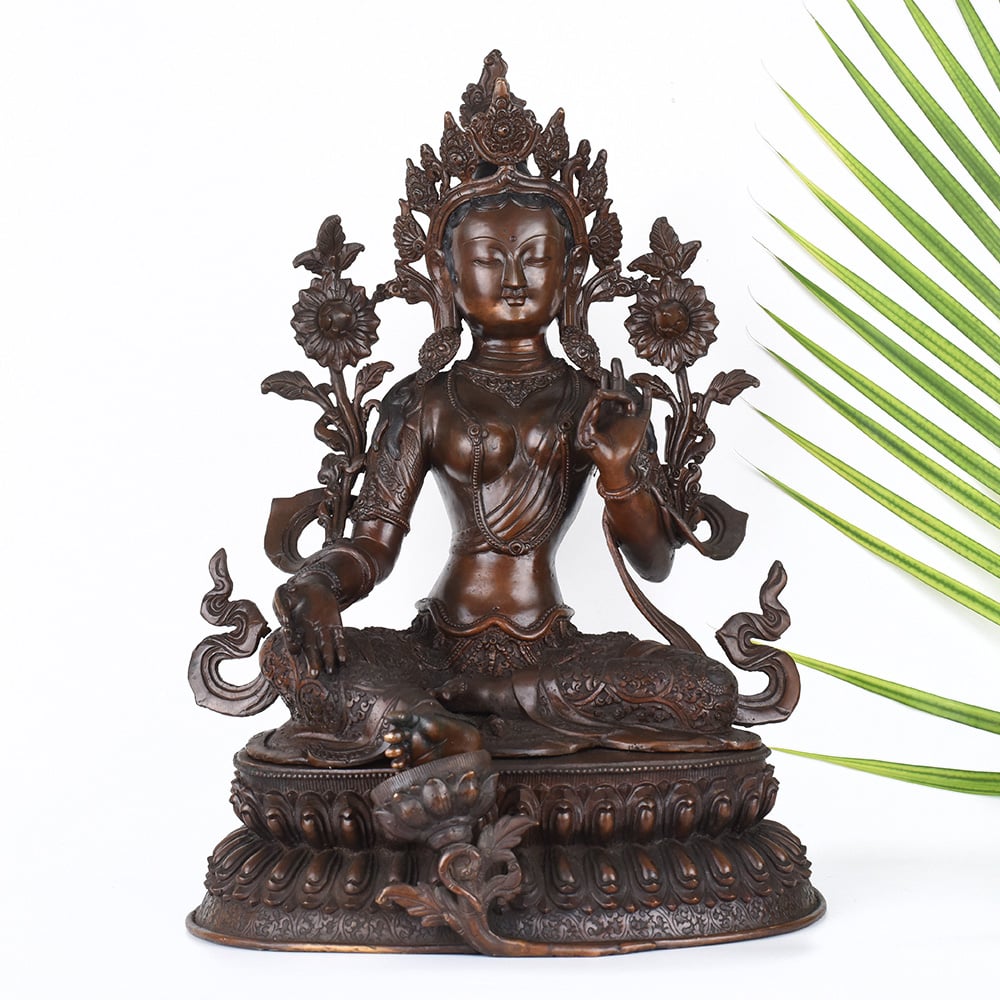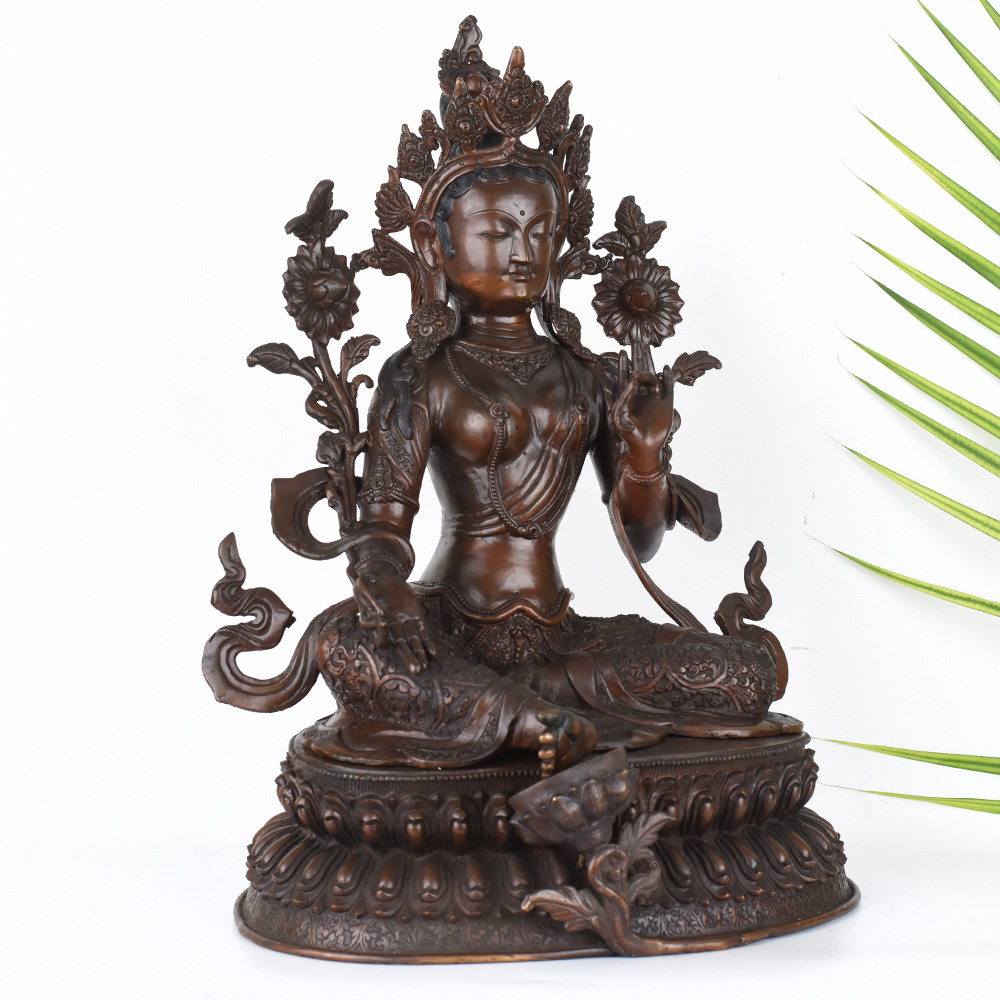 Gaze into the serene, smiling face of the Goddess Green Tara and feel your worries melt away. This stunning, vintage Tibetan Buddhist copper statue captures the essence of the divine feminine - a beacon of wisdom, compassion, and protection. Crafted with intricate detail, this Green Tara figurine will be the centerpiece of your prayer room or meditation space, inviting you to connect with the sacred feminine energy. The Green Tara is revered in Tibetan Buddhism as the "Mother of Liberation", a bodhisattva who swiftly comes to the aid of those in distress. Gaze upon her tranquil, gentle face and let her compassionate energy wash over you, filling your heart with peace and clarity. Whether you're a seasoned Buddhist practitioner or simply seeking to bring sacred feminine energy into your home, this vintage Green Tara statue will be a cherished addition to your spiritual sanctuary.