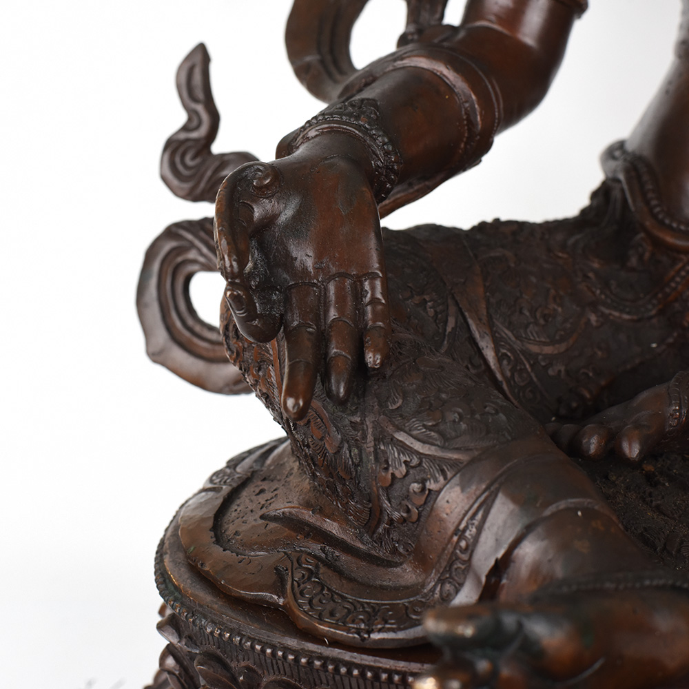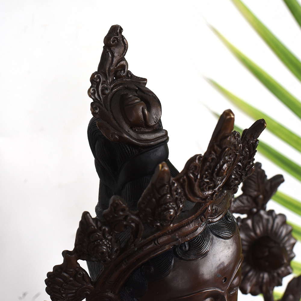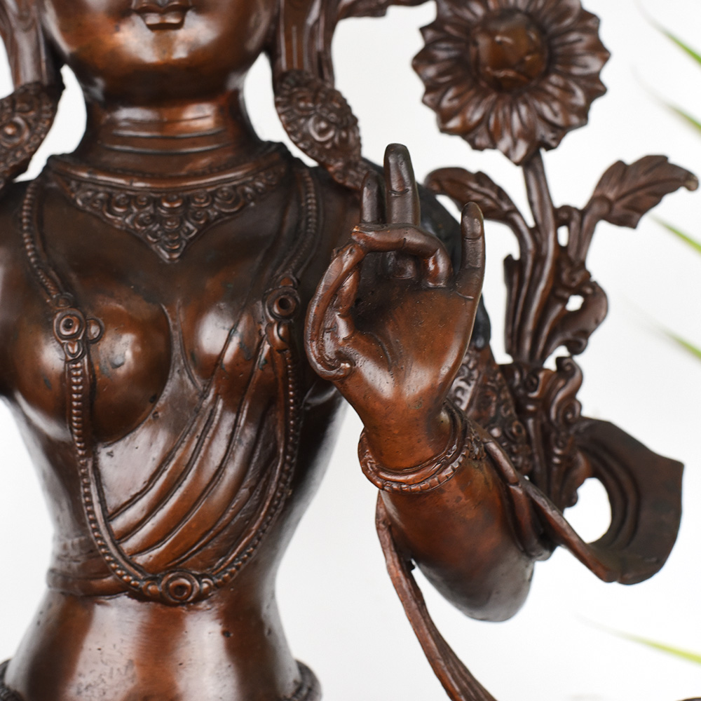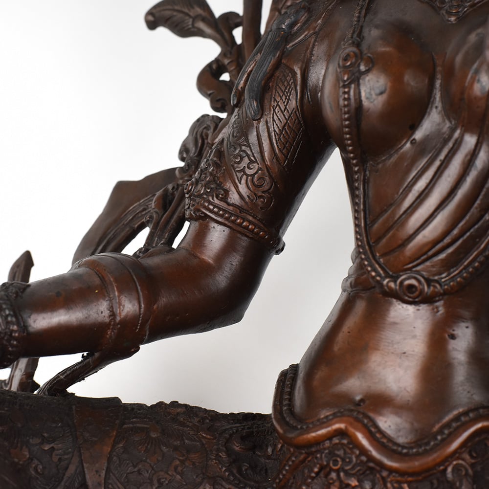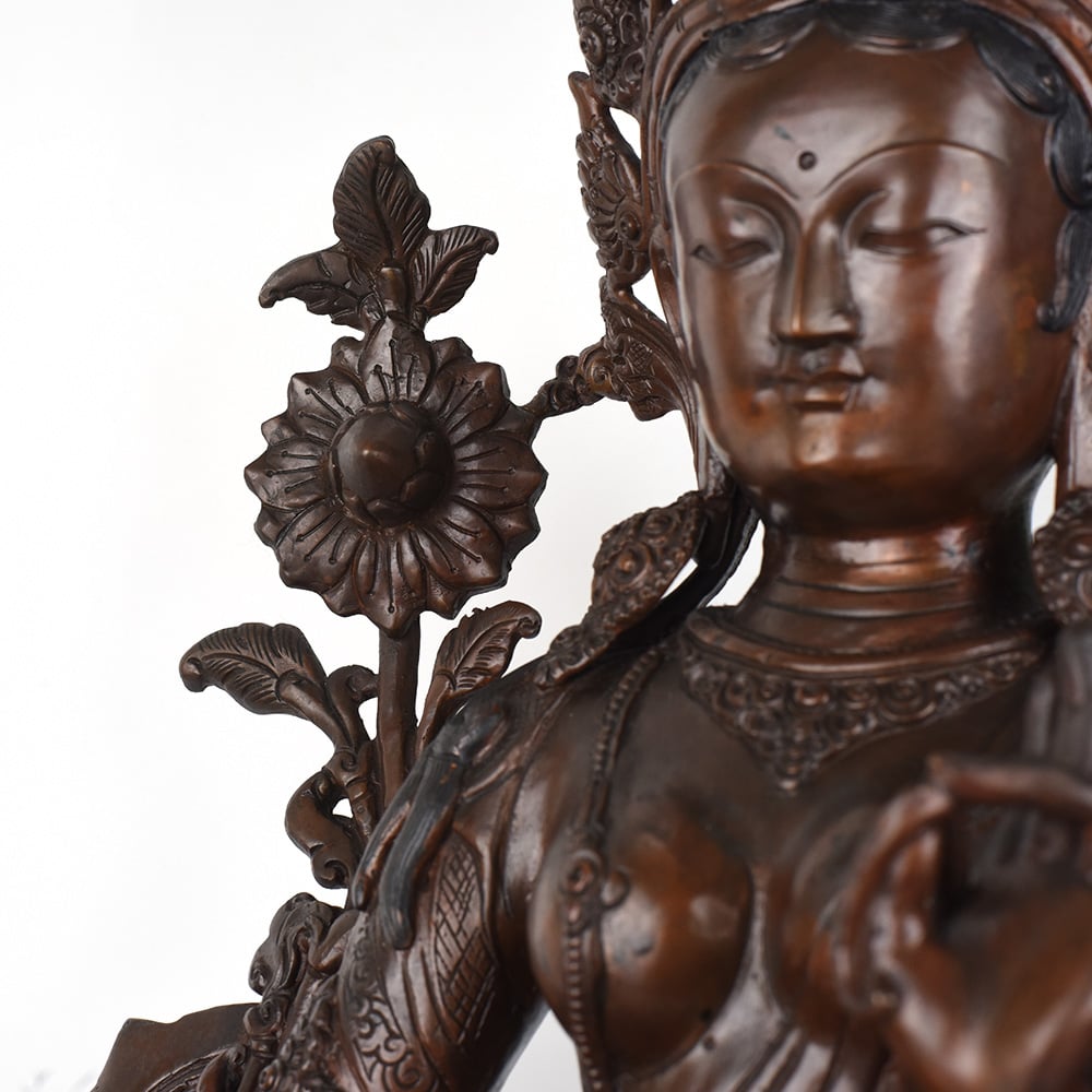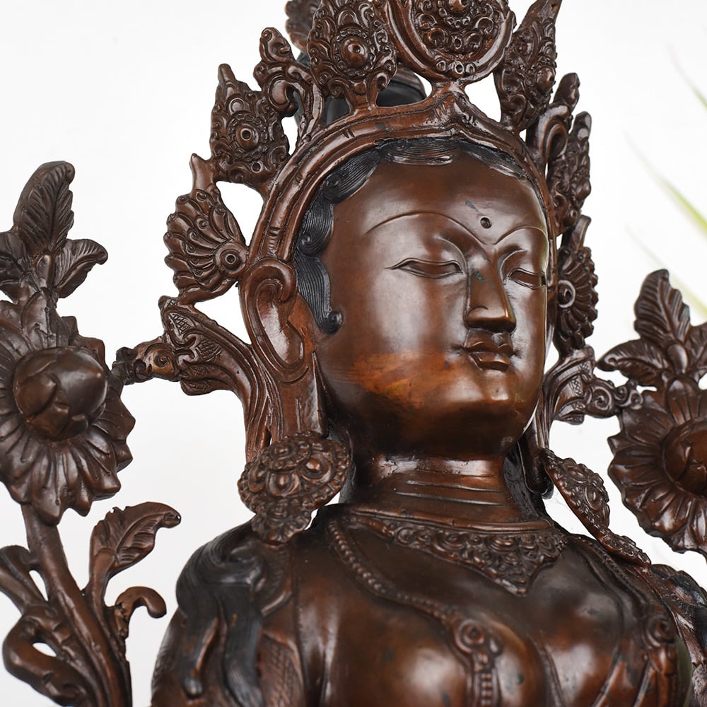 Gaze into the serene, smiling face of the Goddess Green Tara and feel your worries melt away. This stunning, vintage Tibetan Buddhist copper statue captures the essence of the divine feminine - a beacon of wisdom, compassion, and protection. Crafted with intricate detail, this Green Tara figurine will be the centerpiece of your prayer room or meditation space, inviting you to connect with the sacred feminine energy. The Green Tara is revered in Tibetan Buddhism as the "Mother of Liberation", a bodhisattva who swiftly comes to the aid of those in distress. Gaze upon her tranquil, gentle face and let her compassionate energy wash over you, filling your heart with peace and clarity. Whether you're a seasoned Buddhist practitioner or simply seeking to bring sacred feminine energy into your home, this vintage Green Tara statue will be a cherished addition to your spiritual sanctuary.