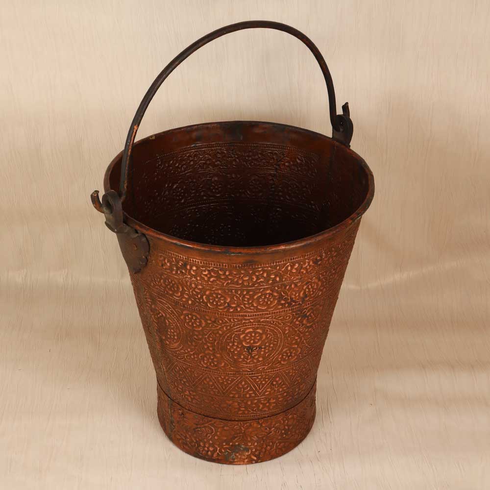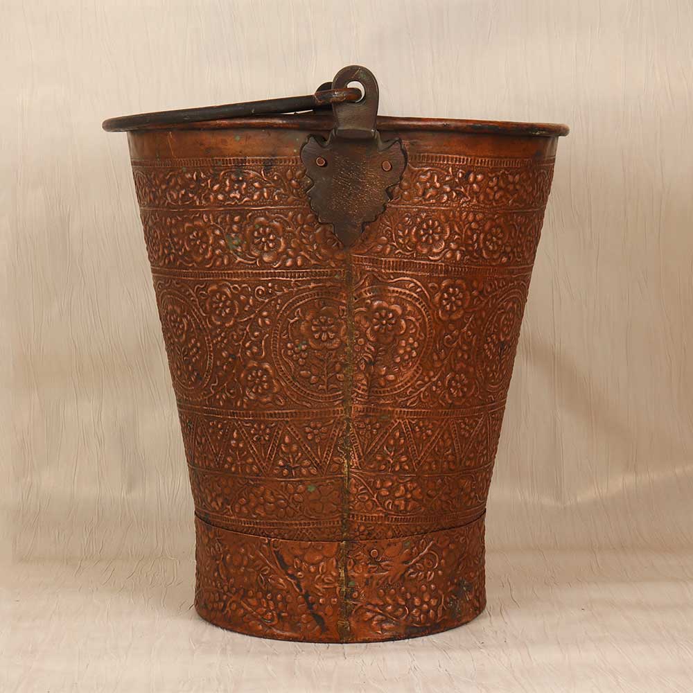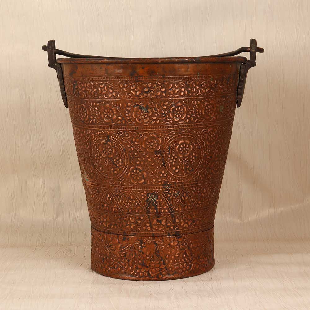 Bring the beauty of ancient metalwork into your home with this stunning vintage copper bucket. Handcrafted from solid copper, this bucket features a classic rounded shape with sturdy loop handle for easy carrying. The surface is hand-engraved with intricate geometric and floral motifs inspired by the rich artistic tradition of the Islamic world. With its gorgeous vintage patina, this decorative bucket adds a touch of antiquity to any space. Display it on a kitchen countertop filled with fruits or baked goods for an artistic accent. Or place it on a console table topped with fresh flowers or bundled dried herbs from the garden. Wherever it's displayed, this copper bucket evokes the craftsmanship of past eras with timeless beauty. Bring home this special piece of history and enjoy its lasting charm for years to come. Ideal for anyone who appreciates unique decorative accents with artisanal appeal. This vintage copper bucket will become a treasured focal point.