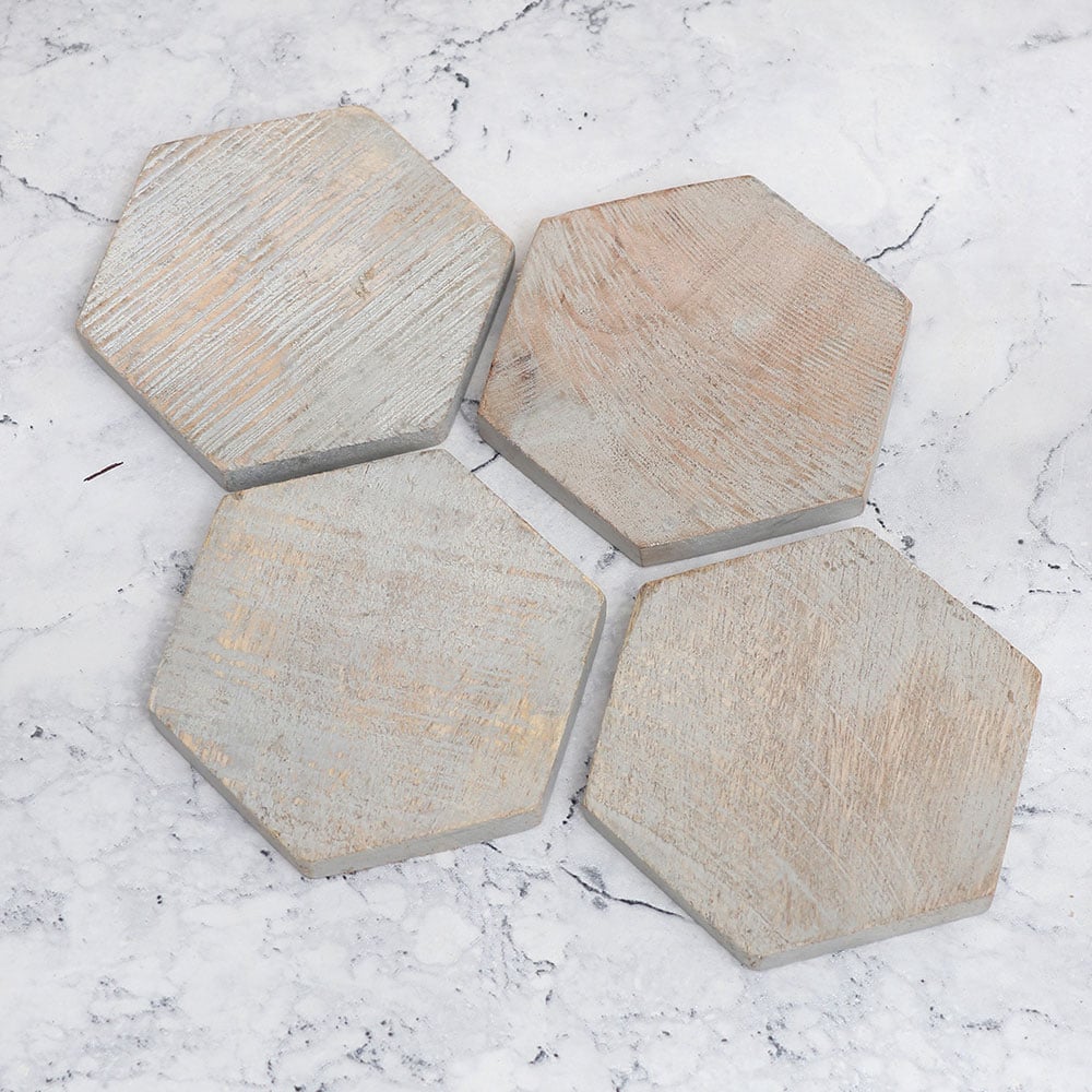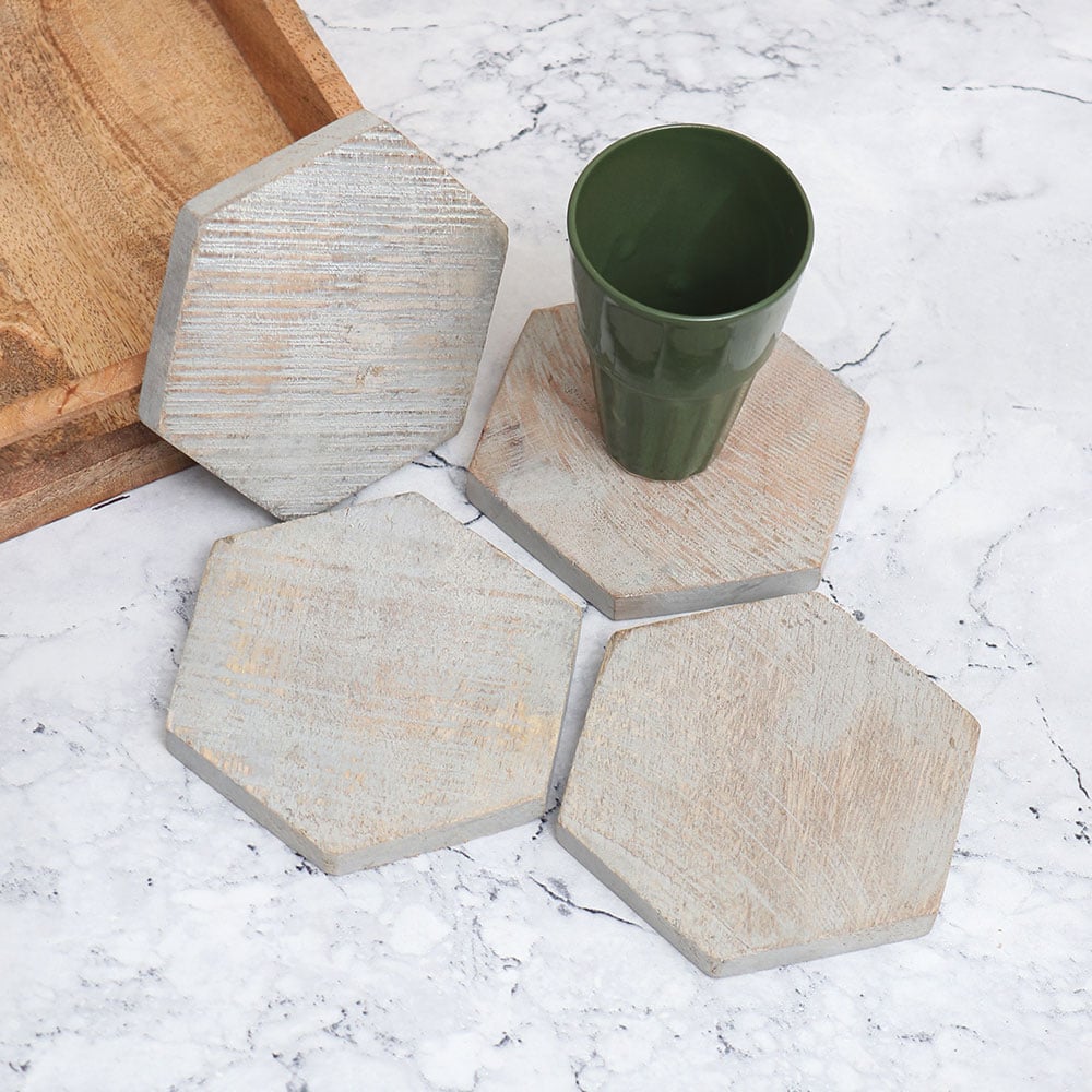 This Pack of four wooden coaster sets is designed to add a touch of elegance to your surroundings. These high-quality wooden tea coasters are crafted from premium wood, with each coaster meticulously shaped into a captivating hexagon form. Handmade by local Indian artisans, these coasters showcase the mastery of their craftsmanship. The vintage finish of these coasters imparts a classic charm, making them not only functional but also a delightful decorative piece for your home or office. Designed to hold water, tea, juice, or coffee glasses, these coasters offer protection against unsightly stains on any surface. Whether you\'re at home, in the office, a restaurant, hotel, or café, these coasters will elevate your beverage experience while preserving the cleanliness of your surroundings. Moreover, these wooden coaster sets make ideal gifts for your loved fours on special or festive occasions. Indulge in the best wooden coaster experience and elevate your beverage rituals with these wooden tea coasters.