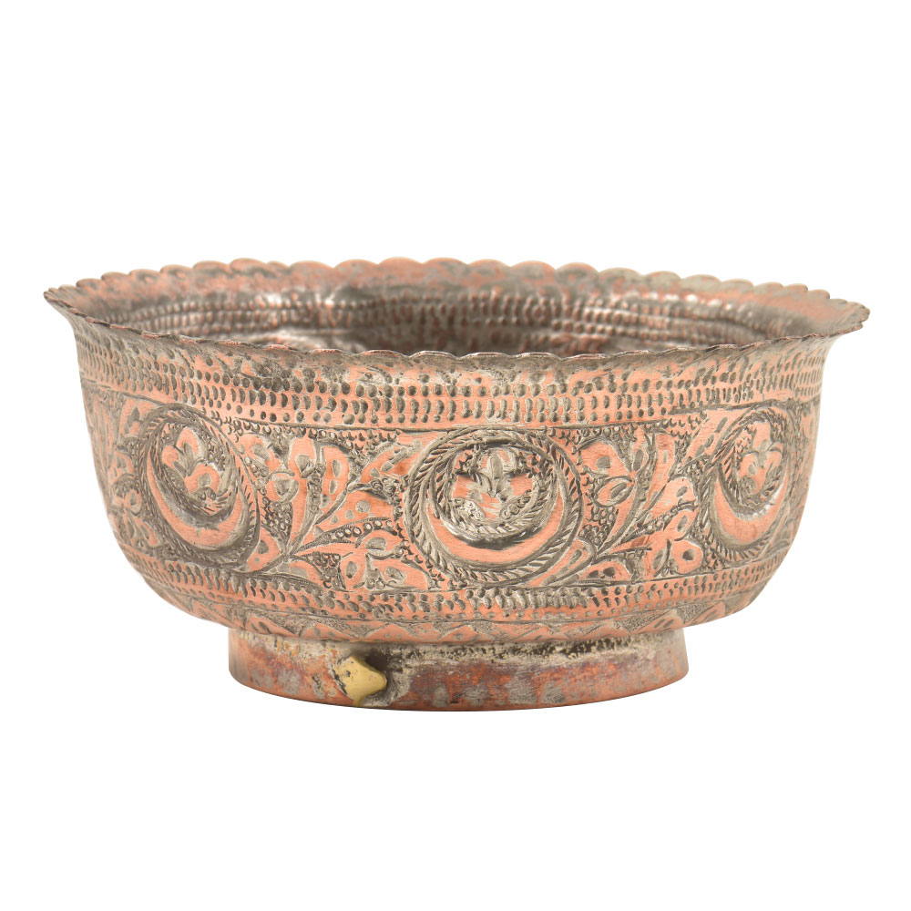 • Vintage Floral Pattern Copper Bowl Engraved Scalloped Edge