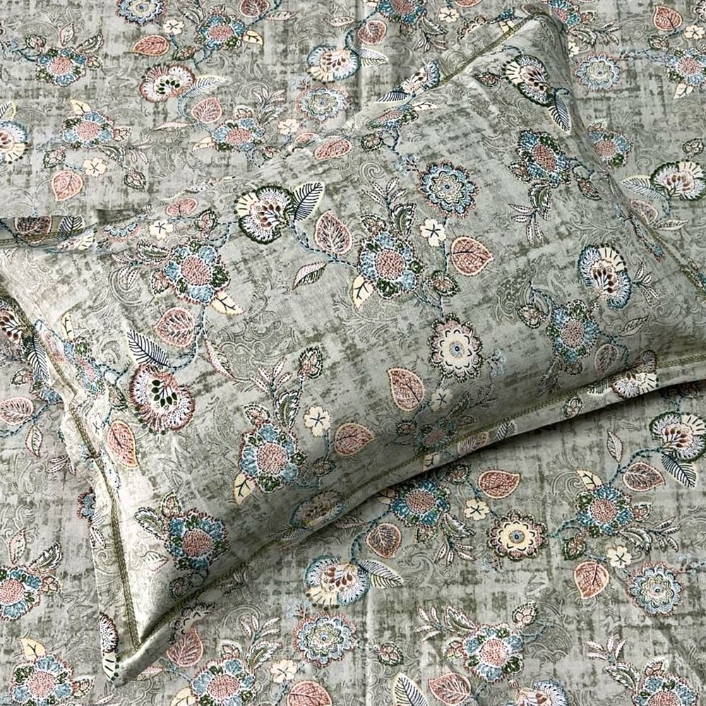 Bring timeless elegance to your bedroom with this Vintage Floral Vine King Size Bedsheet Set. Featuring soft, hand-drawn floral motifs in muted tones of blue, peach, and green over a faded green-grey textured background, this bedsheet evokes a classic, rustic charm. Crafted from 100% pure cotton casement, it offers breathable comfort and a gentle, soft touch.This 3-piece set includes one flat (non-fitted) bedsheet and two pillow covers with matching prints, making it an ideal choice for heritage-inspired interiors or tasteful gifting.