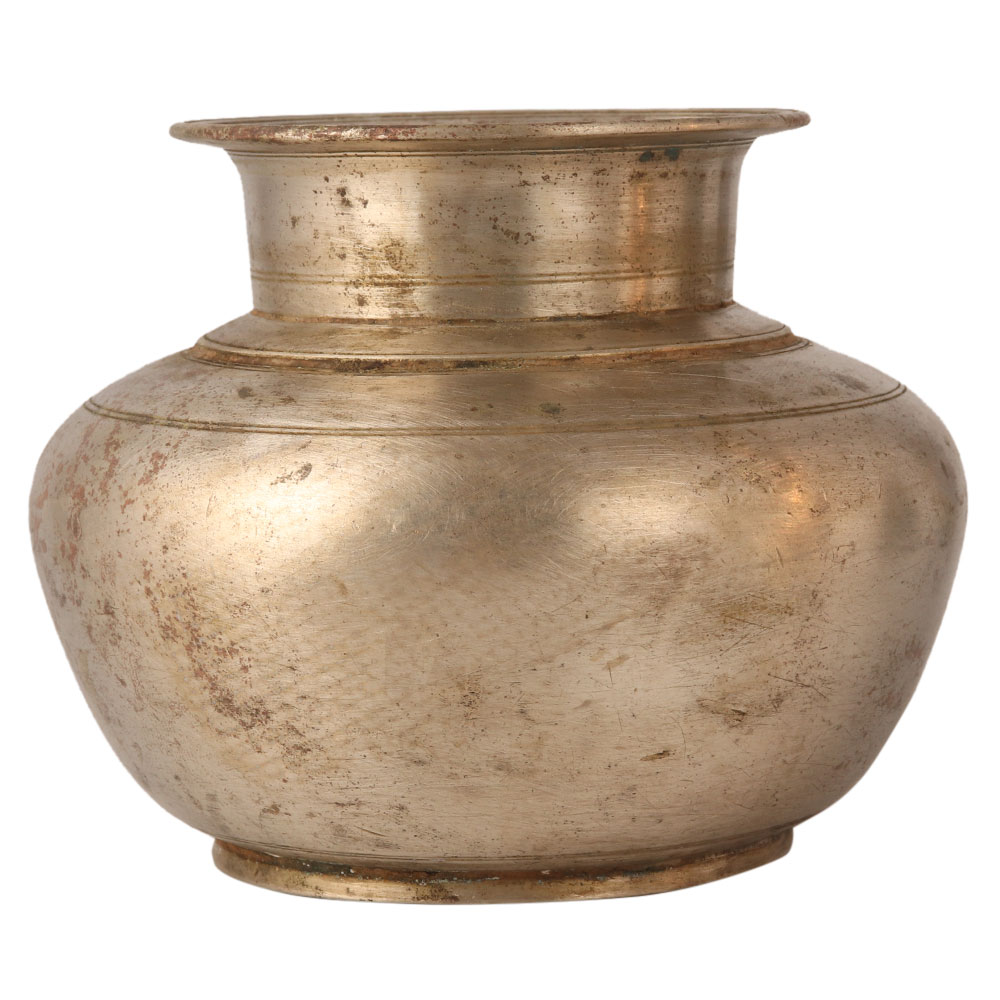 This Gangajal water pot was carved from a white metal alloy. It has a vintage look with a wide belly and a small mouth. There is a circular ring engraved on the sides and neck. It has a sturdy look. An ideal gift for birthday, wedding, anniversary, New Year and Diwali.