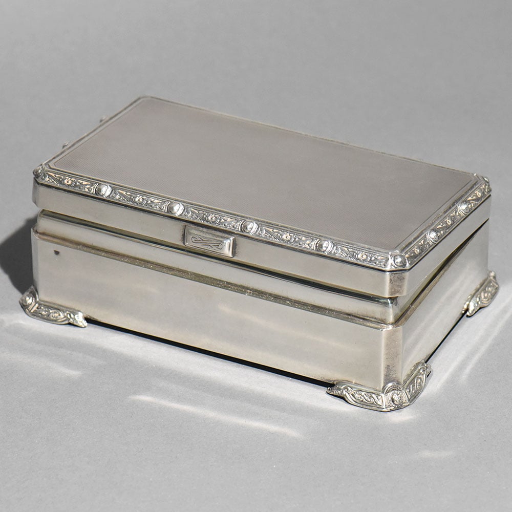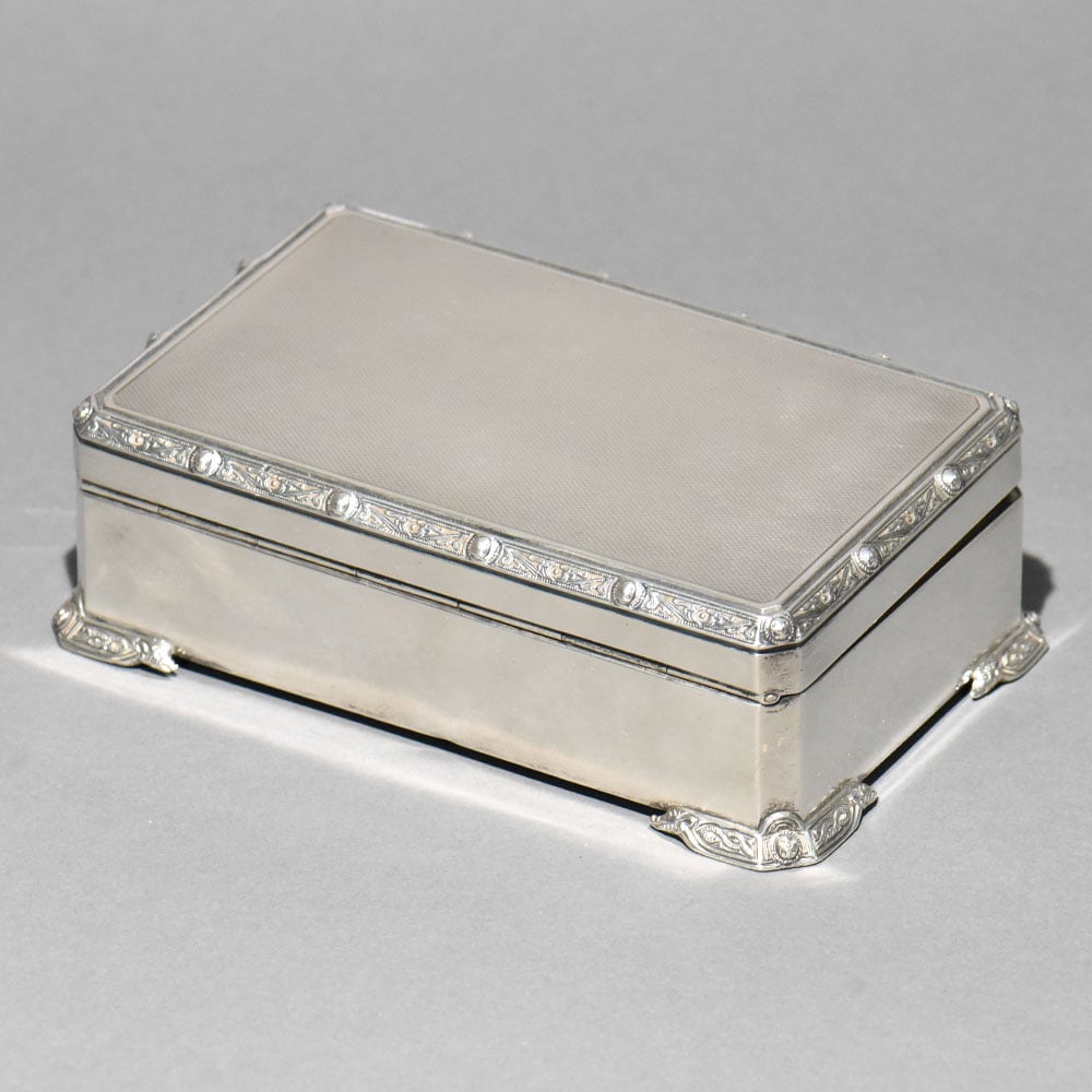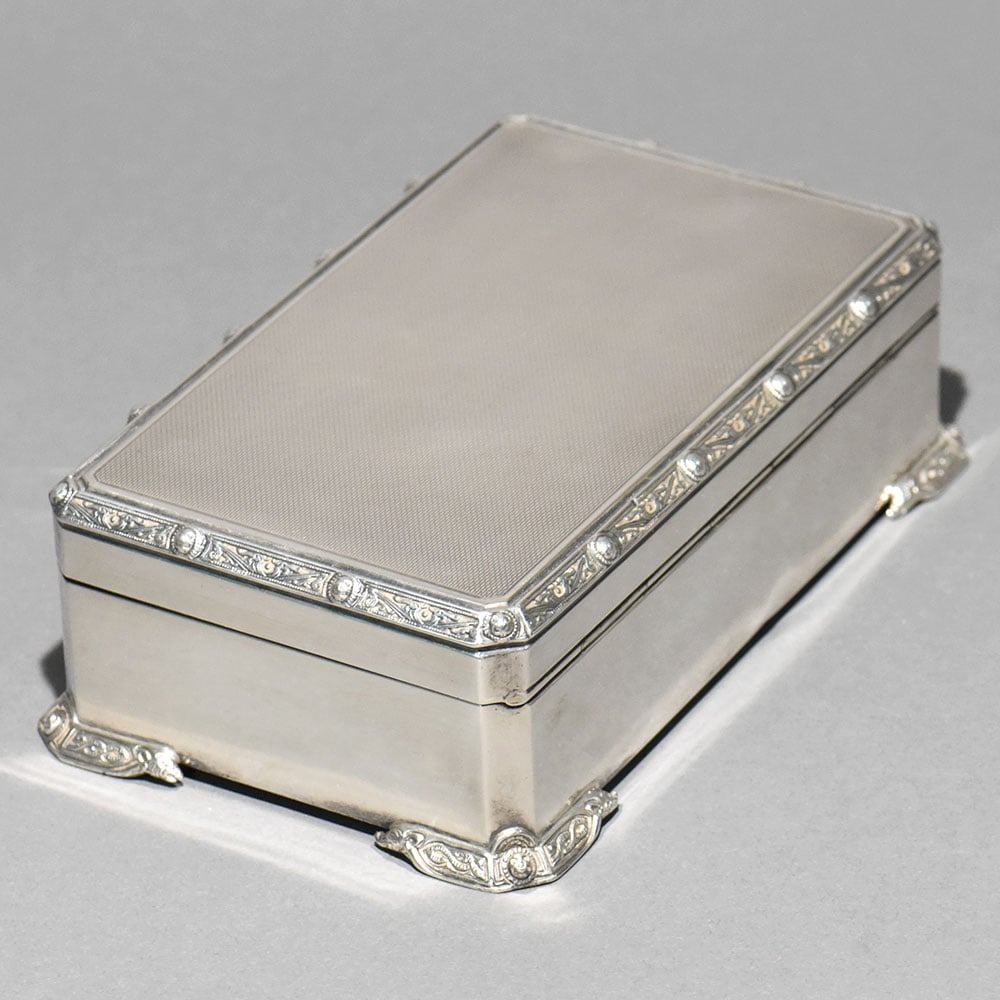 An exquisite vintage sterling silver box by Garrard & Co. Ltd., the renowned Crown Jewellers of Britain. This piece reflects Garrard’s signature elegance, precision craftsmanship, and understated luxury, making it a highly desirable collectible for serious silver and heritage collectors. The box features a refined rectangular form elevated on ornate scroll feet, with finely executed repoussé and engraved detailing along the lid’s border. The satin-finished silver surface enhances its classic character while allowing the intricate ornamentation to stand out without excess. The hinged lid opens smoothly to reveal an original wood-lined interior, a hallmark of quality antique silver boxes designed to protect jewellery, snuff, or personal valuables. The construction is solid and substantial, underscored by its impressive weight.