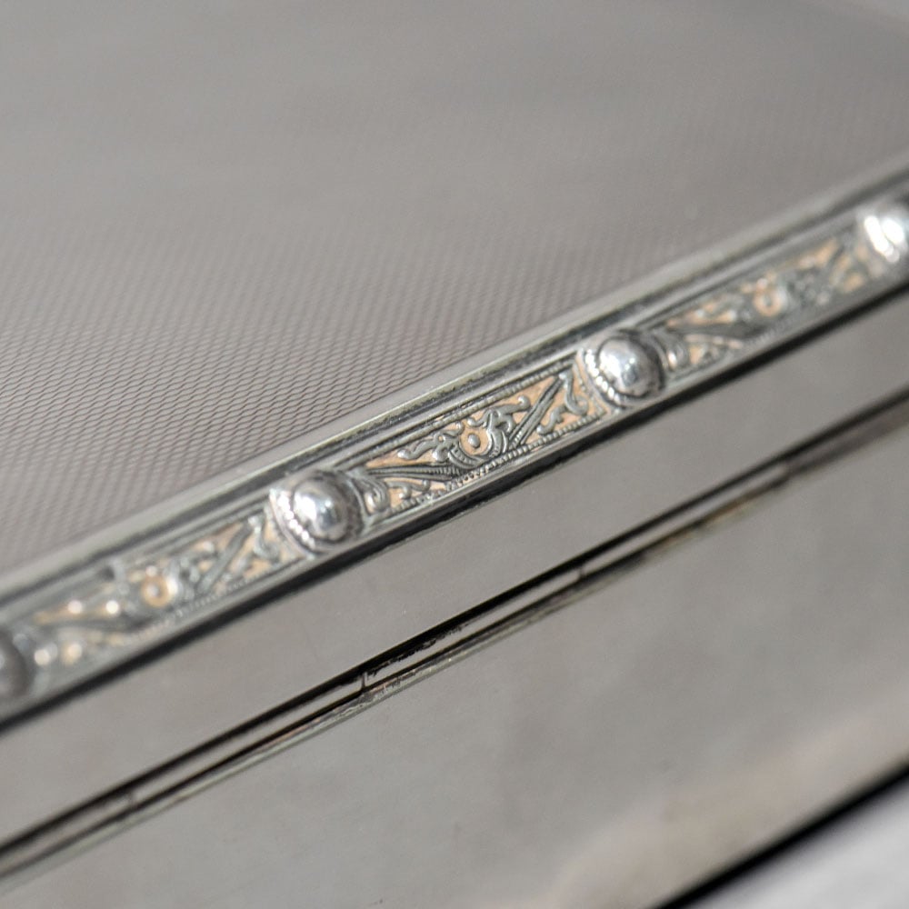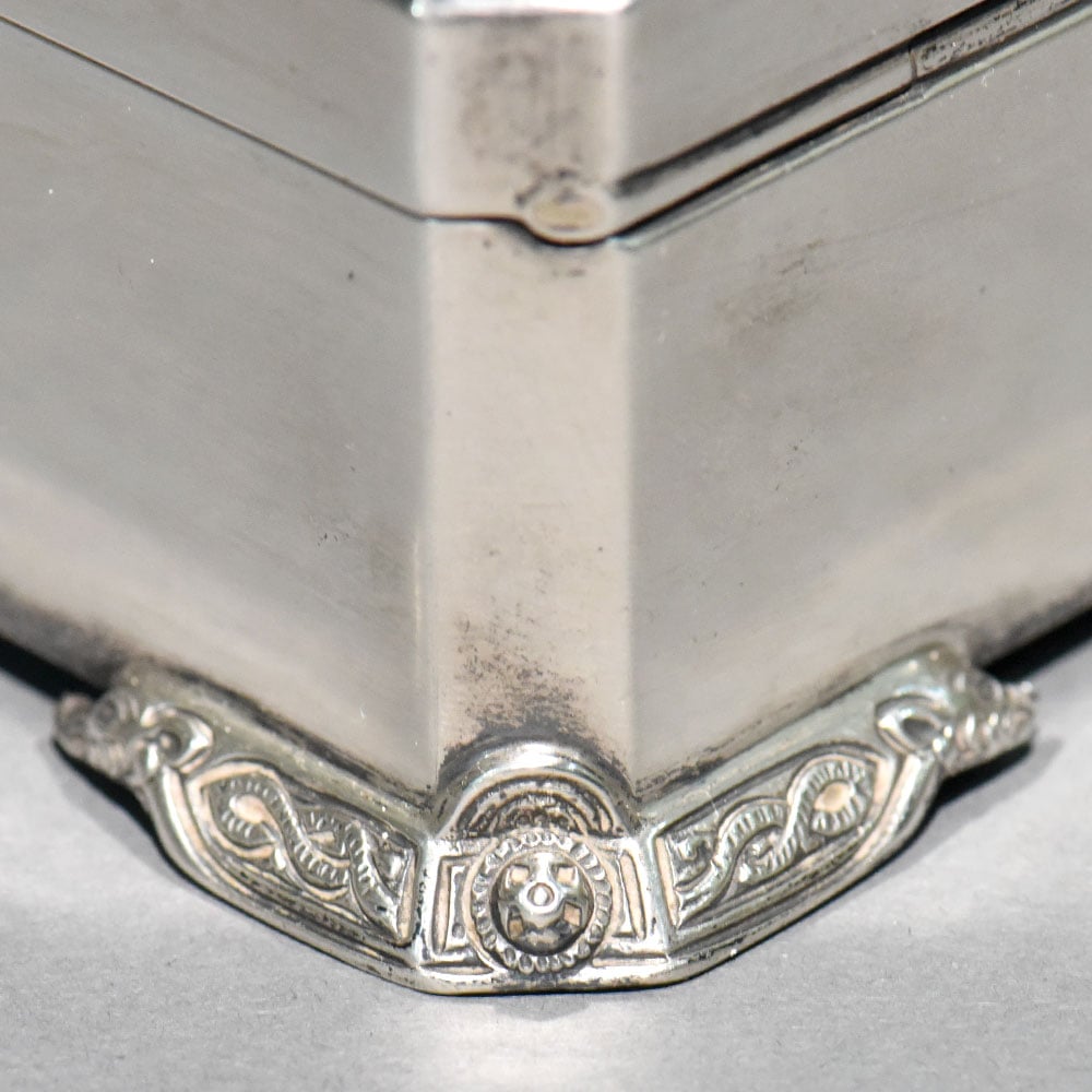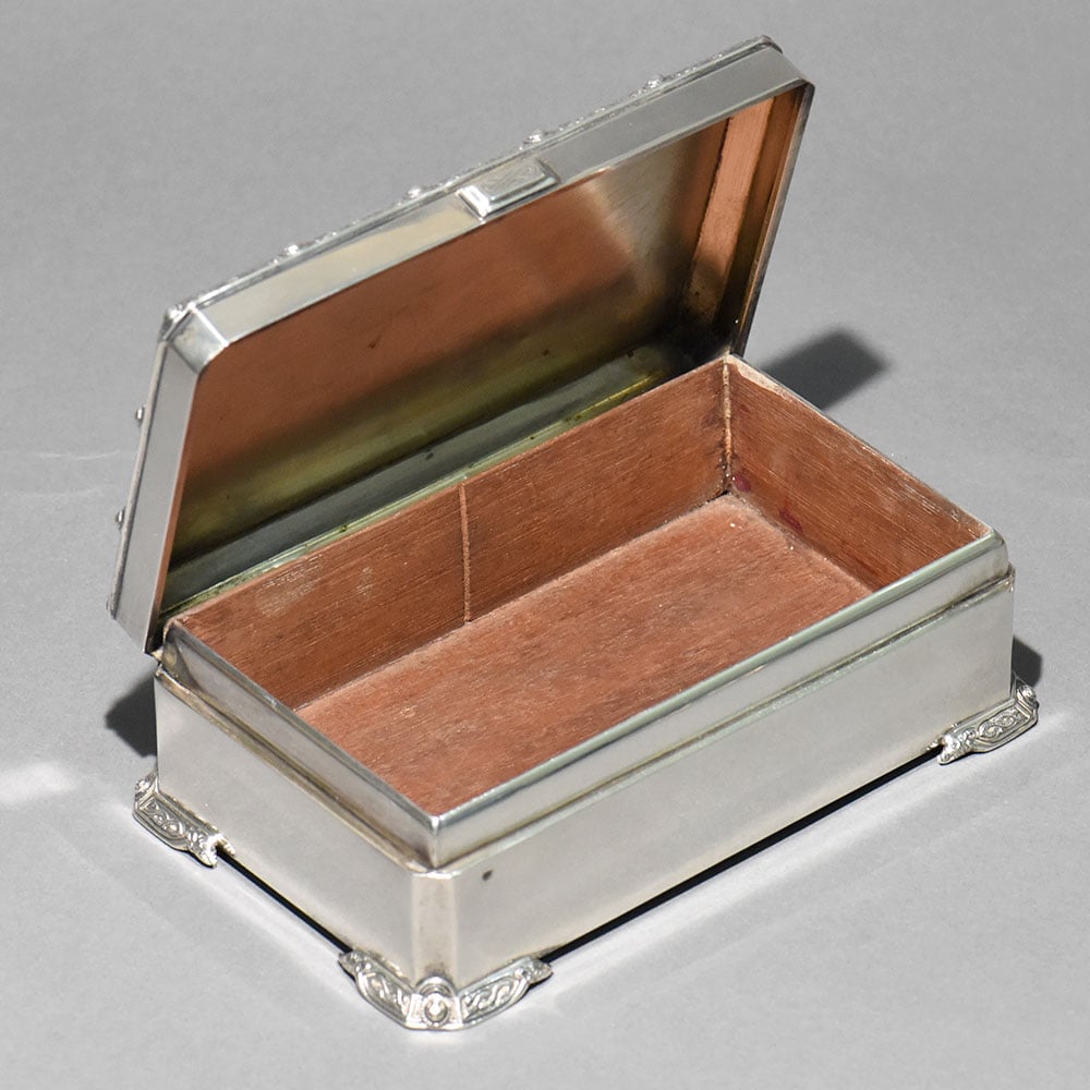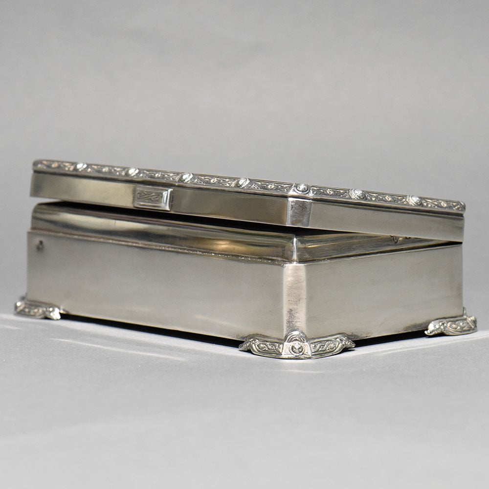 An exquisite vintage sterling silver box by Garrard & Co. Ltd., the renowned Crown Jewellers of Britain. This piece reflects Garrard’s signature elegance, precision craftsmanship, and understated luxury, making it a highly desirable collectible for serious silver and heritage collectors. The box features a refined rectangular form elevated on ornate scroll feet, with finely executed repoussé and engraved detailing along the lid’s border. The satin-finished silver surface enhances its classic character while allowing the intricate ornamentation to stand out without excess. The hinged lid opens smoothly to reveal an original wood-lined interior, a hallmark of quality antique silver boxes designed to protect jewellery, snuff, or personal valuables. The construction is solid and substantial, underscored by its impressive weight.