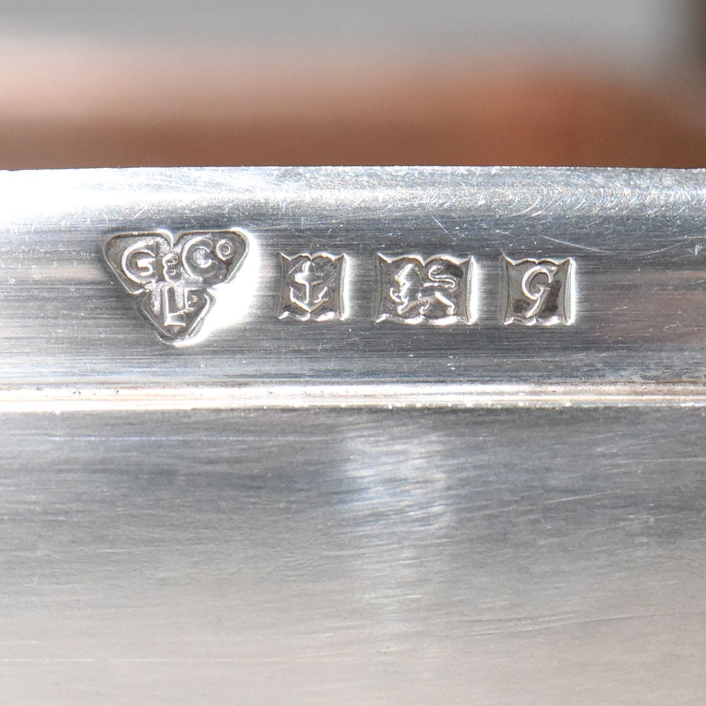 The box is clearly hallmarked with: Garrard & Co. Ltd. maker’s mark Lion Passant, confirming sterling silver (925) Anchor mark, denoting Birmingham Assay OfficeThese marks authenticate the piece as genuine British sterling silver by Garrard & Co. Ltd.Dimensions & Weight Height: 5 cm Width: 16 cm Length: 10 cm Weight: 618 grams (Combined)
