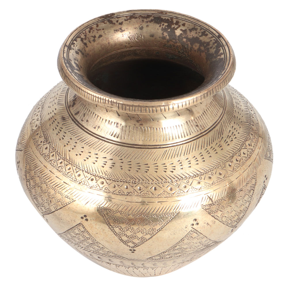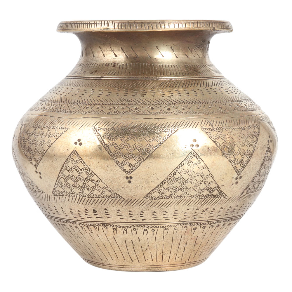 A vintage water pot with a shiny appearance. There is a beautiful triangular pattern engraved in the centre. It is hand carved from brass by skilled Indian artisans using ancient methods. It has a flat bottom. It will be an eye-catching piece to place in your vintage collection. Use it for decoration on stages, weddings or birthday parties. Ideal for collections and home decorations. A perfect gift for corporate ceremonies, Deepavali, Christmas and anniversary.