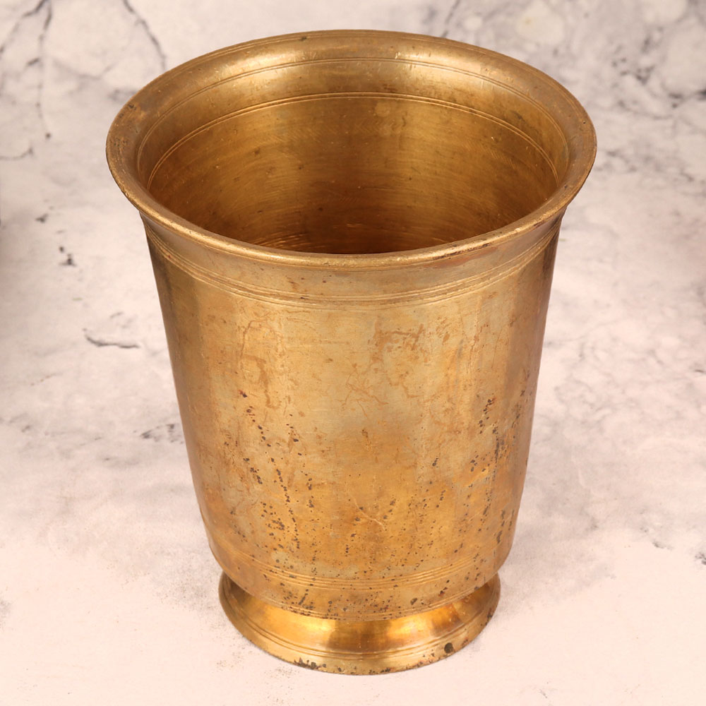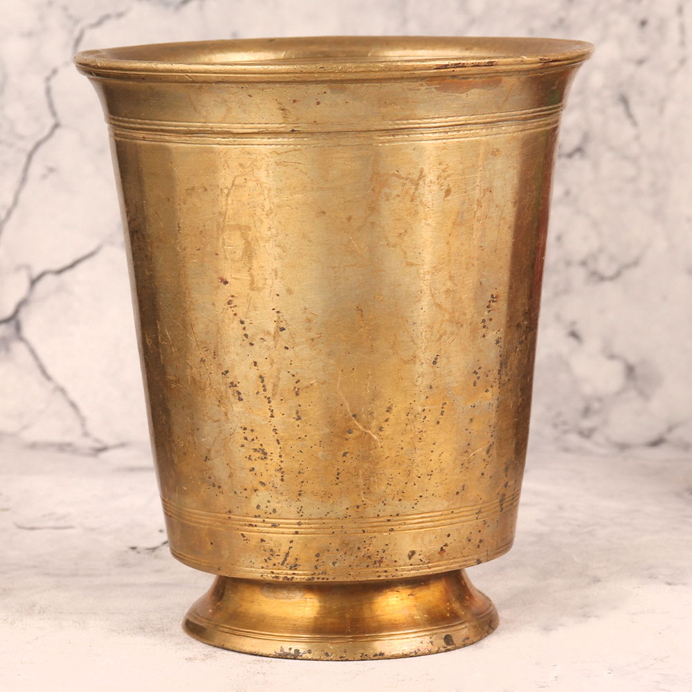 A vintage brass glass with an antique golden finish which is meticulously handmade by highly skilled and experienced Indian artisans hailing from the artistic realms of South India. Crafted from high-quality brass, this timeless artefact bears the heritage of traditional Pooja, havan, and rituals. With its ornate design and historical significance, this piece serves as more than just a ritual accessory—it doubles as an elegant decoration for your home, office, restaurant, hotel, shop, or cafe. Its versatility is striking, it can hold fragrant flowers, becoming a captivating flower pot that radiates charm. For ardent vintage collectors, this glass is a coveted treasure, a tangible link to the past. Its allure is not confined to private spaces, consider featuring it in exhibitions, where its beauty and cultural value can be appreciated by all. Moreover, this masterpiece makes for an ideal gift to mark special, festive, or auspicious occasions, symbolizing your best wishes and cultural appreciation.