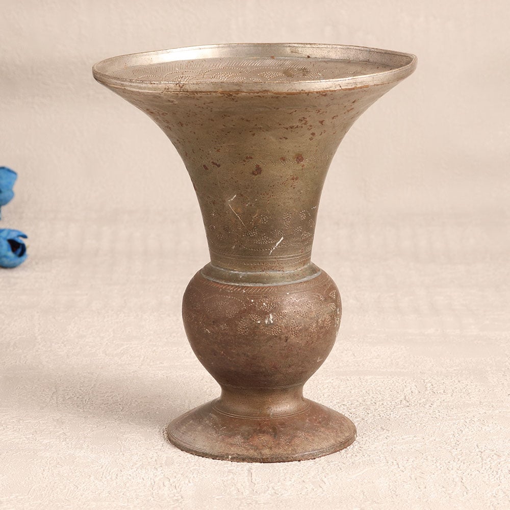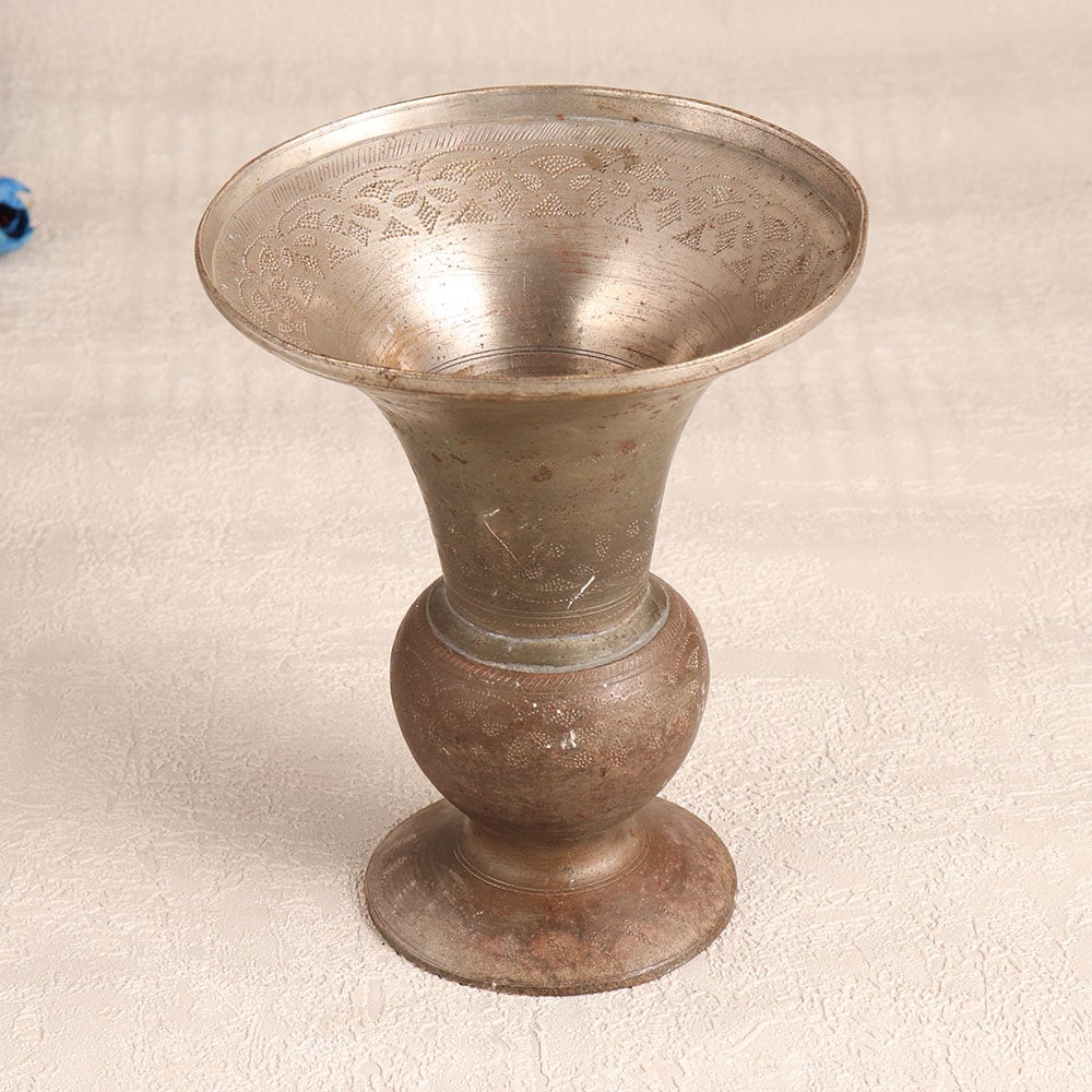 Decorate your interior with a touch of timeless elegance with this exquisite vintage brass flower pot. Handcrafted by skilled Indian artisans, this stunning piece is a testament to the rich heritage of South Indian Art. The flower pot is meticulously engraved with intricate designs, showcasing the artisan's dedication to their craft. Its antique gray finish exudes an aura of vintage charm, making it a versatile addition to various settings. Whether it's your home, office, hotel, cafe, shop, or restaurant, this flower pot will make a captivating statement piece. You can fill it with your favourite blossoms to bring life and beauty to any space. This piece is not just a decorative item but a collector's dream. It can be proudly displayed at exhibitions or added to your vintage collection, telling a story of artistry and tradition. Additionally, it makes for a thoughtful and meaningful gift for your loved ones on special, festive, or auspicious occasions, adding a touch of Indian craftsmanship and culture to their lives.