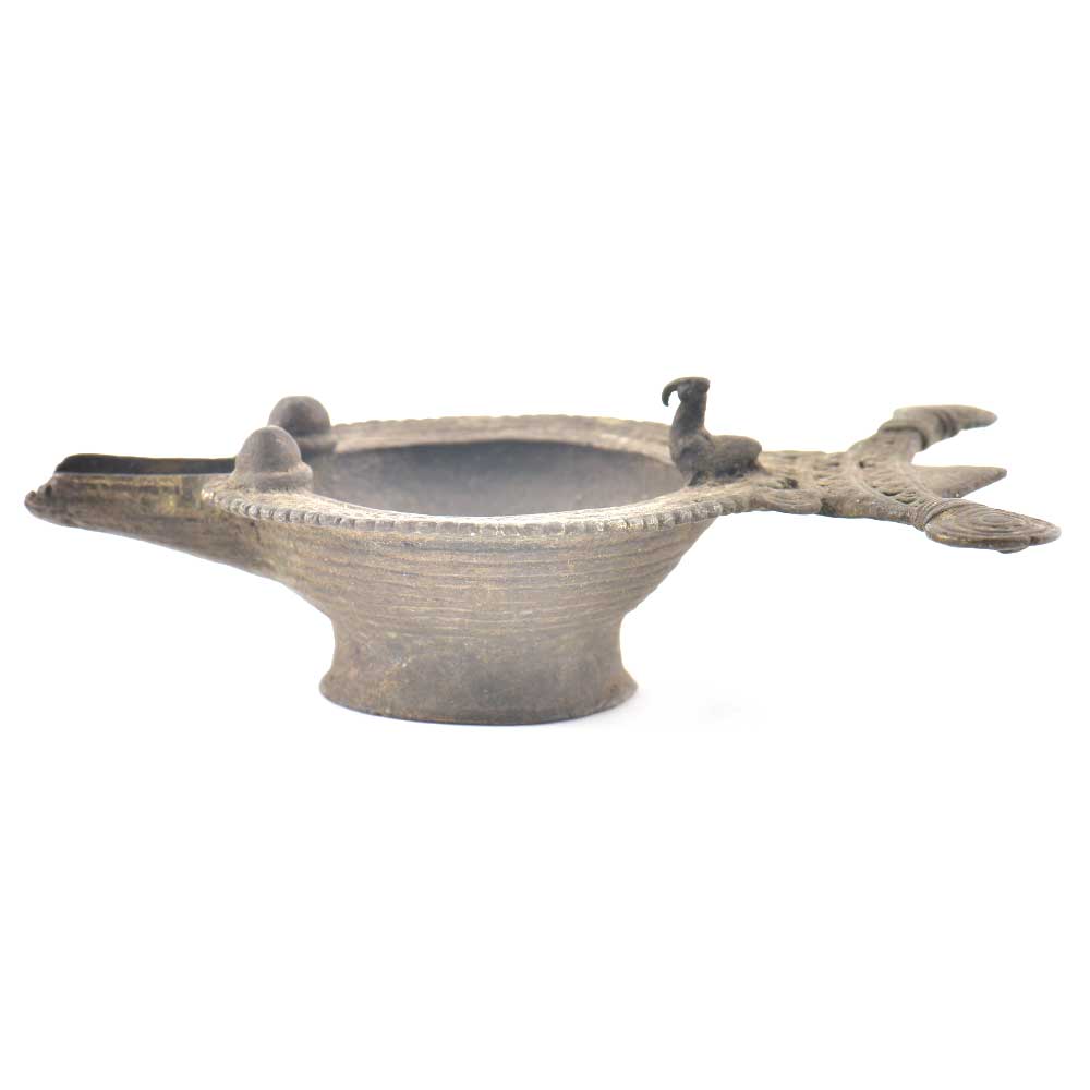 Traditional South Indian Brass Oil lamp made using the traditional lost wax process has a deep cup to fill oil or ghee . The lamp is unique in shape with a small bird figurine on one end of the lamp . It also has nice engraved design on the border of the lamp .It is generally used during Diwali or other auspicious occasions.