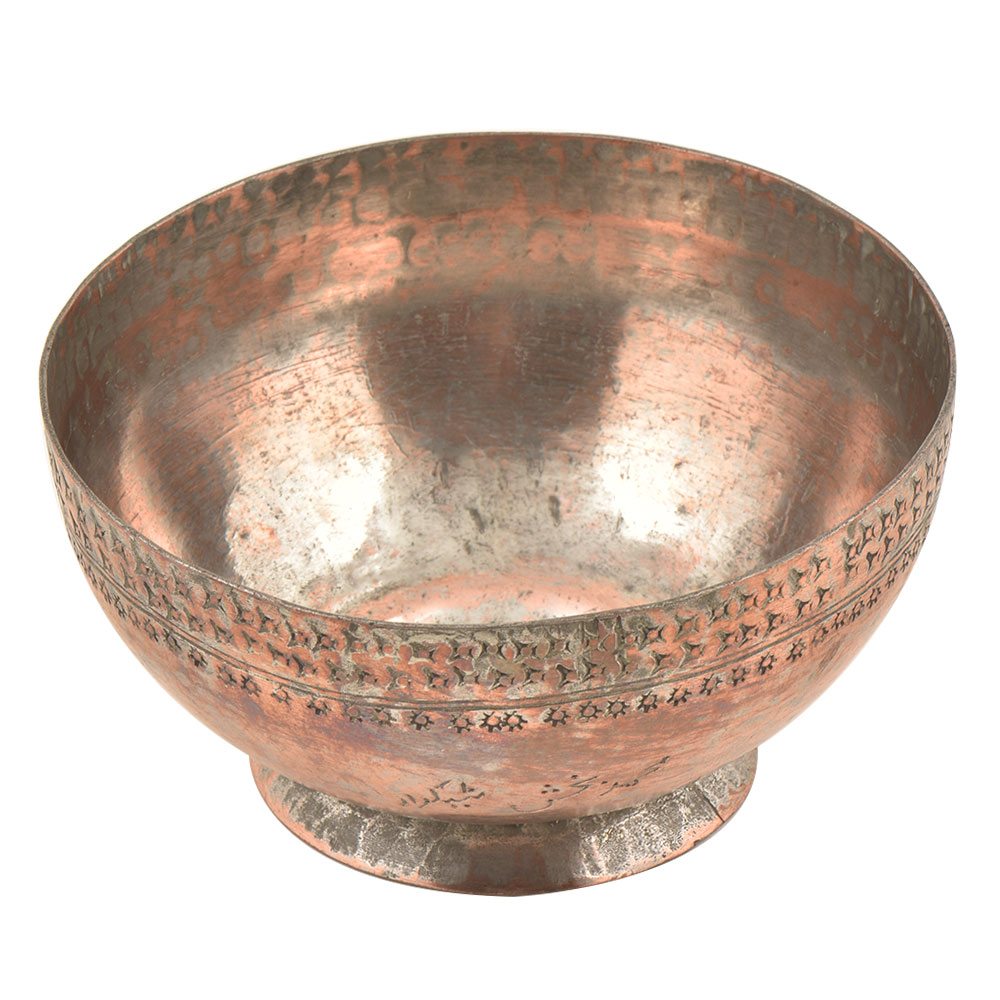 The hand hammered copper bowl is a Beautifully Unique Piece Complete with islamic style starry sun Pattern Design. The Perfect Addition to Any Set or Your Home Kitchen Decor. It has geometrical patterns to the side and base and a rolled over top rim of the bowl. The perfect addition to any set or your home kitchen decor.