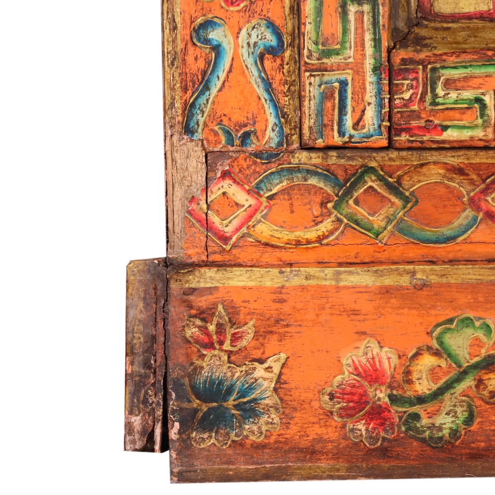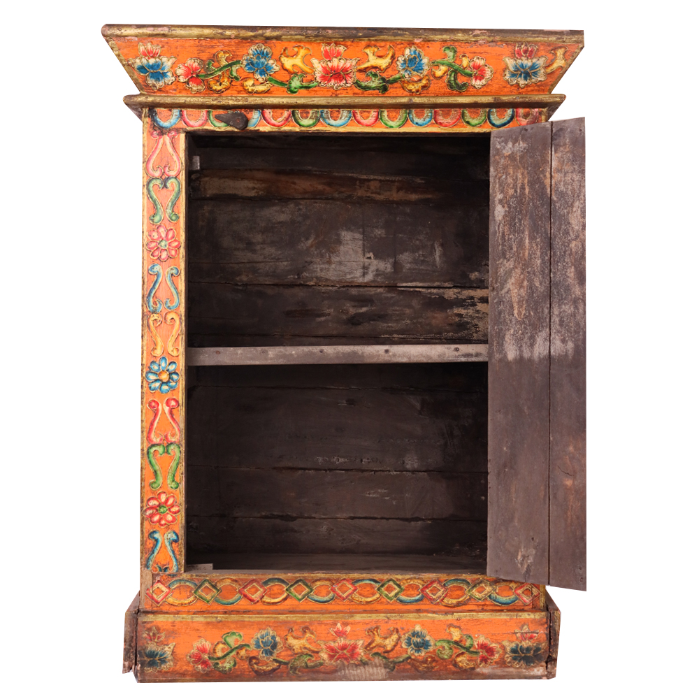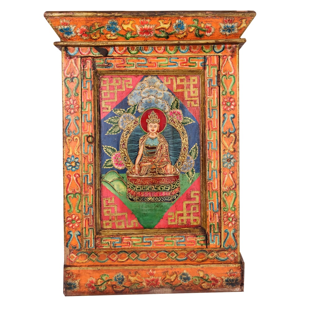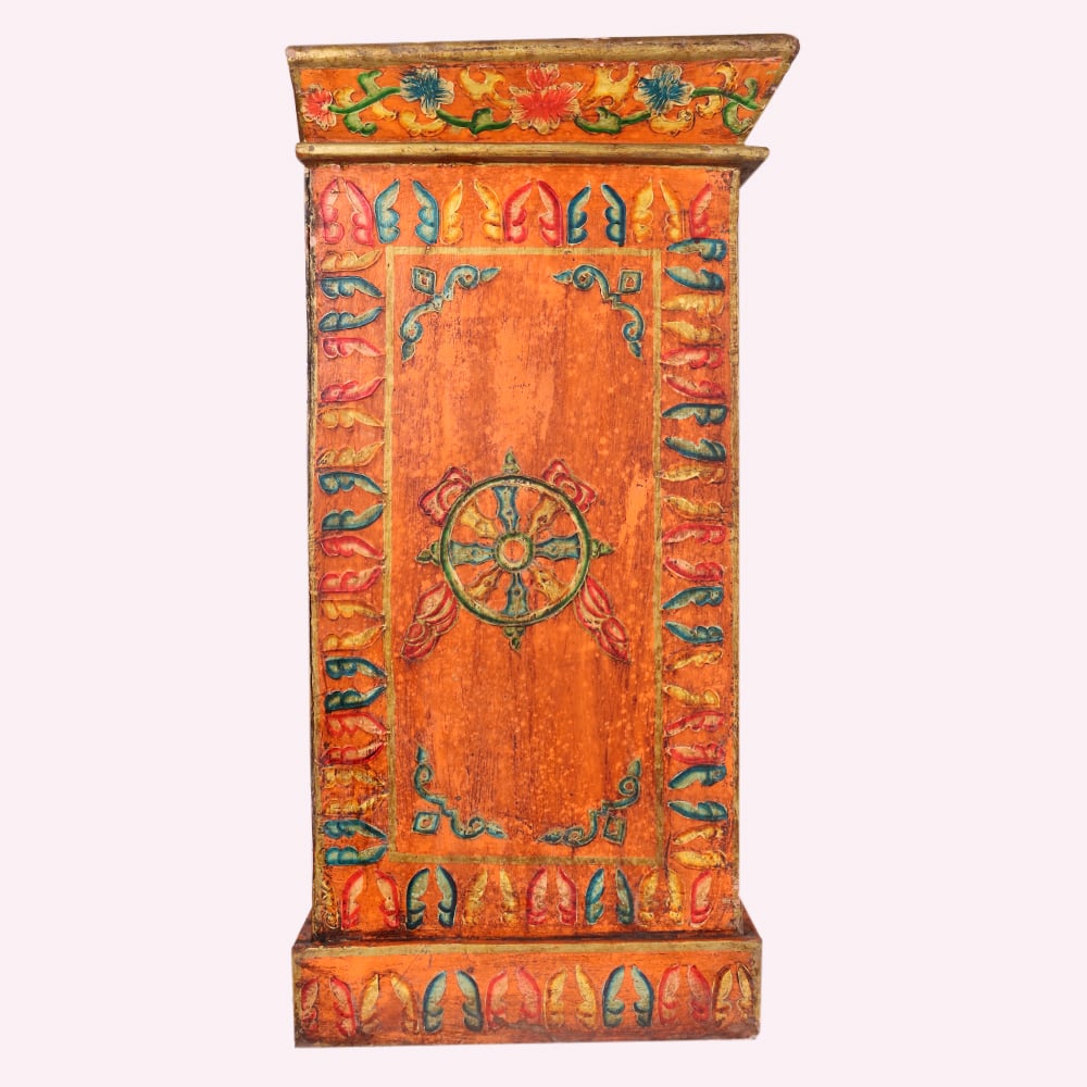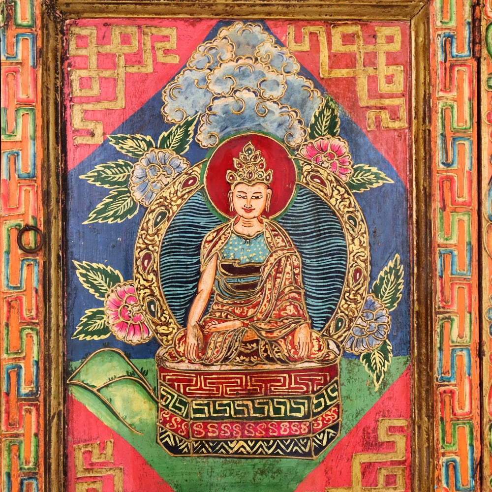 Add timeless artistry to your home with this handmade antique wooden box, beautifully adorned with vibrant hand-painted deity artwork and intricate floral carvings. Crafted from solid wood, this vintage-style storage cabinet reflects the rich cultural heritage of Himalayan craftsmanship. Its colorful detailing, symbolic motifs, and distressed finish make it not just a functional storage solution but also a captivating décor piece. With spacious shelving inside, it can be used for storing sacred items, jewelry, books, or personal treasures. Perfect for altars, meditation corners, or heritage-inspired interiors, this wooden box carries an aura of spirituality and elegance. Handcrafted by skilled artisans, each piece is unique, making it a cherished addition to your collection or a thoughtful gift for art lovers.